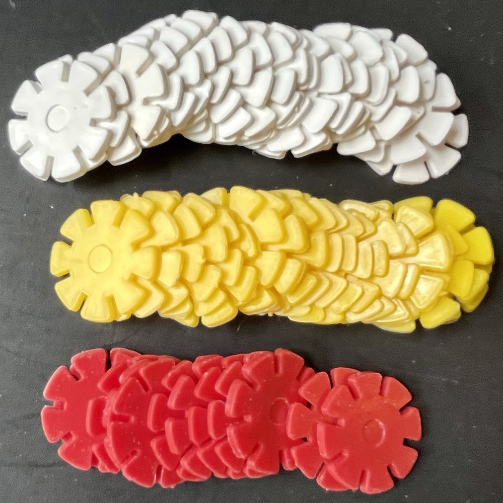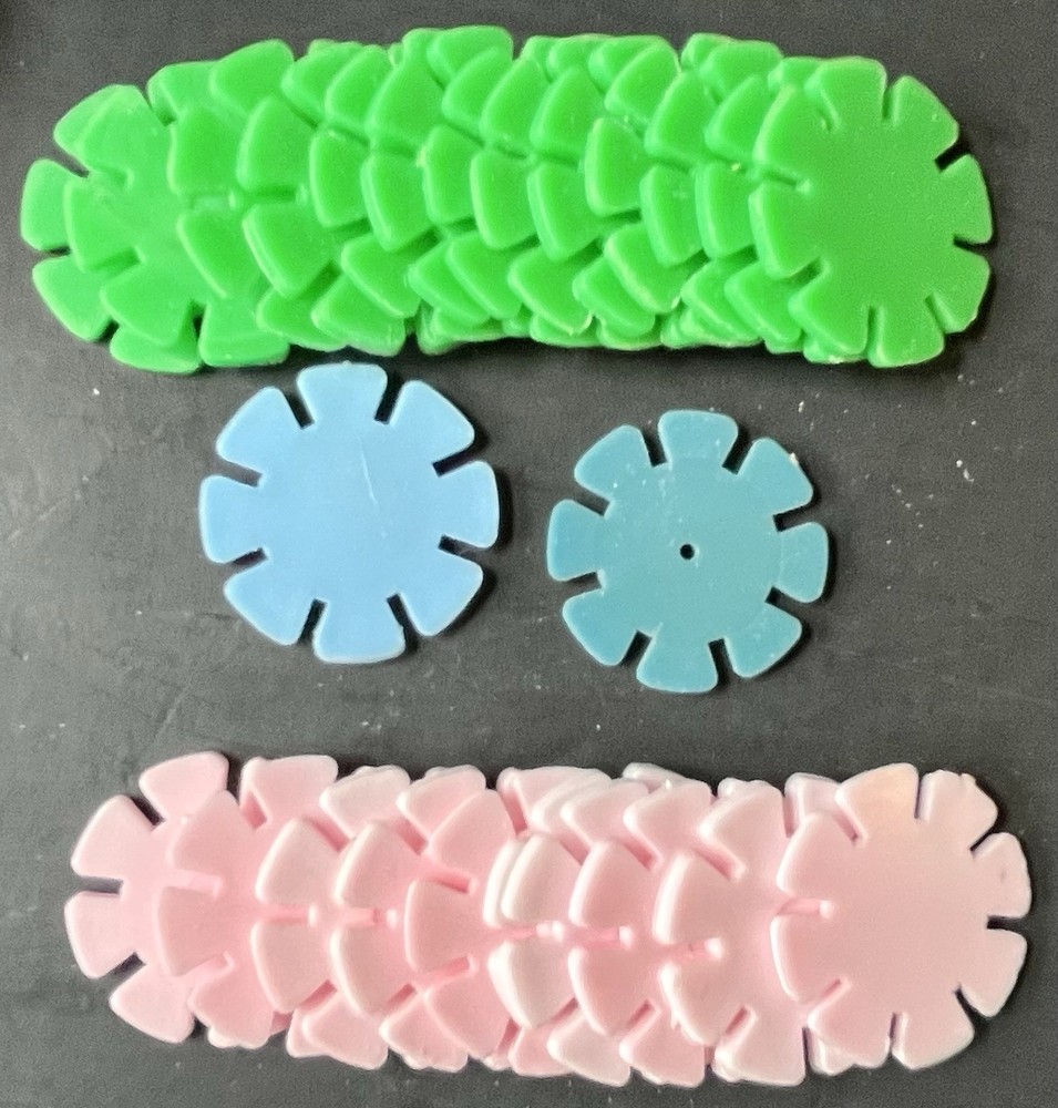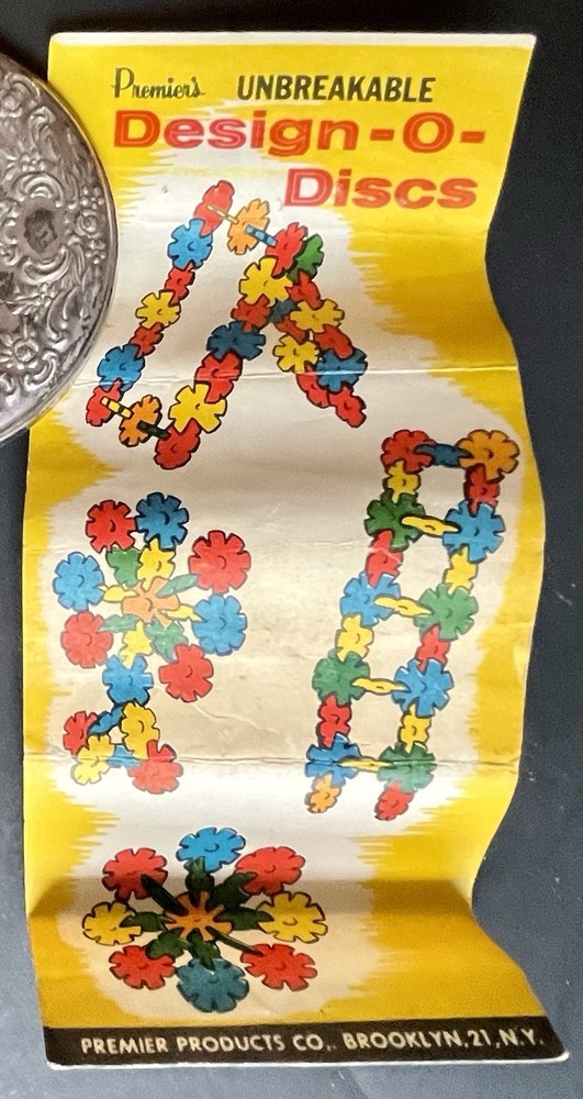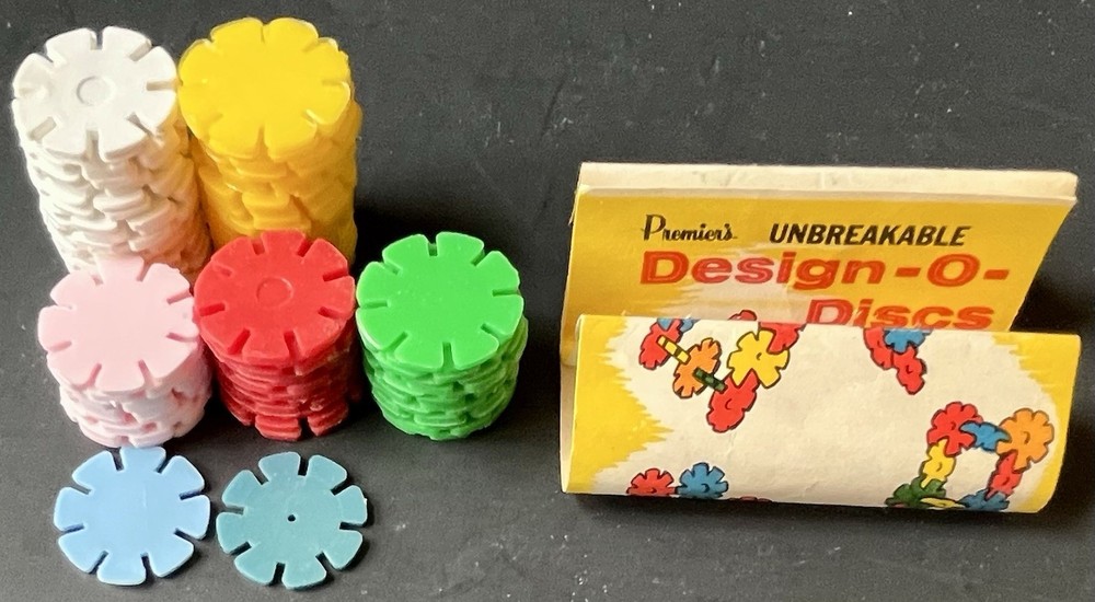 Vintage creative design building toy - Design-O-Discs, plastic flower shaped that interlock, made by Premier Products Co, Brooklyn, NY, each flower disc measures 1 1/8” in diameter. White 21, yellow 21, red 12, pink 10, blue 2, green 13. This is from my collection. Condition is fairly good - clean, not warped, not played with much, not dried out, unsure what number of discs you should have, I found it like this,