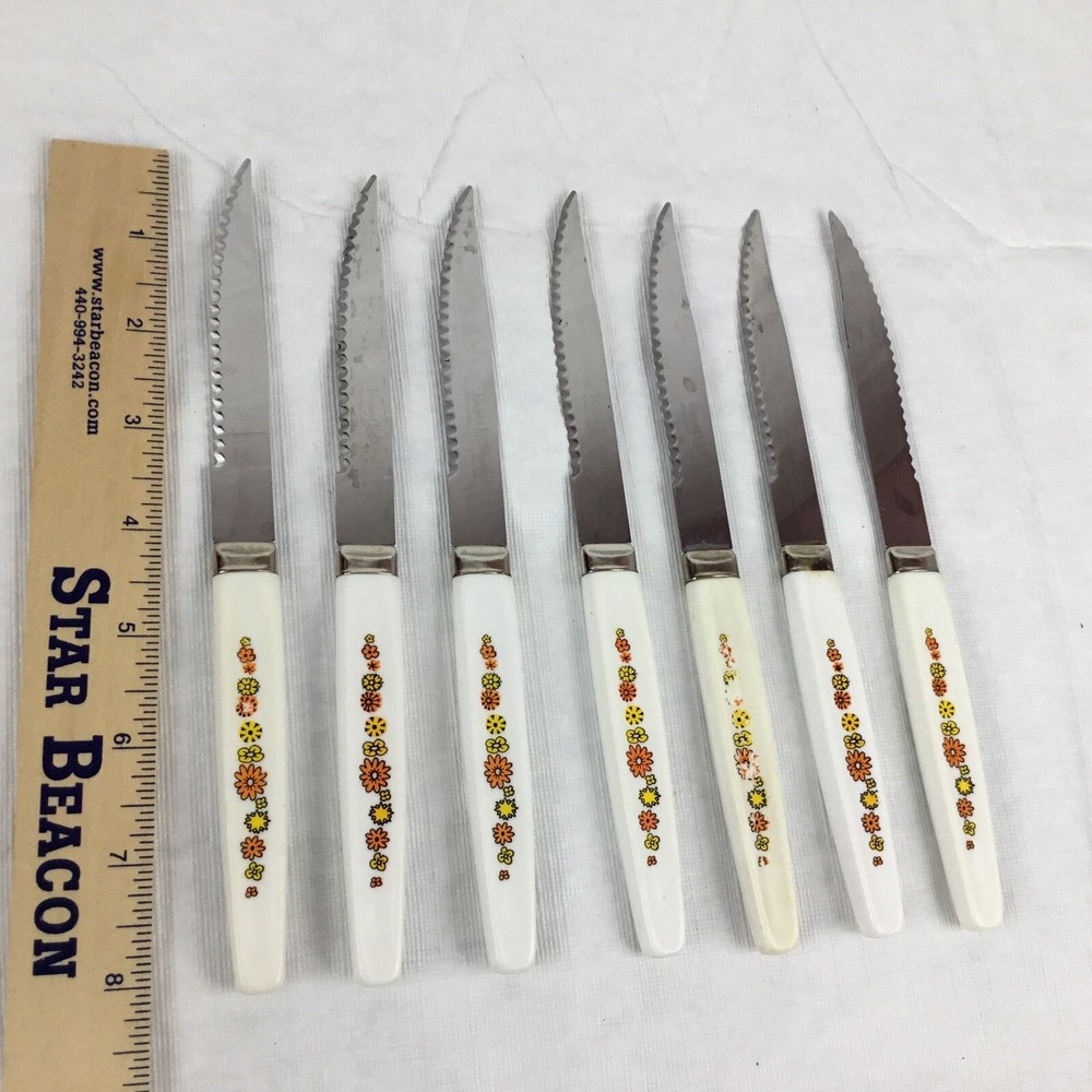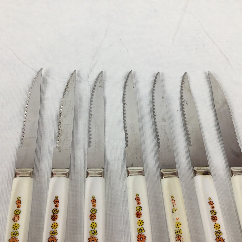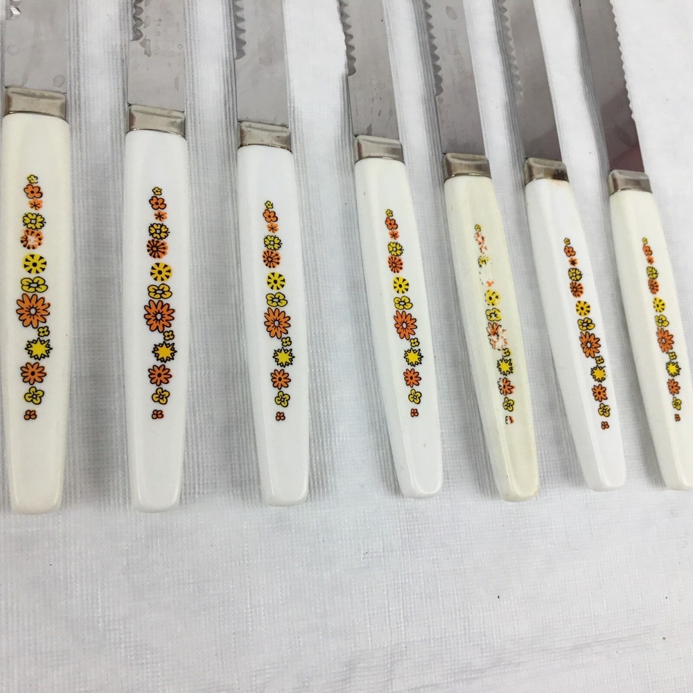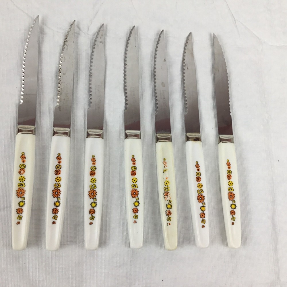 Vintage Regent Sheffield England cutlery steak knives set of 7. Orange yellow green flowers. Flower power. Nice addition to your Mid-century kitchen. One knife has rust a couple are yellowed and some have flowers worn. Overall nice addition to your vintage MCM kitchen ware. Please view all photos to make your decision on purchase. Any questions please ask and thanks for looking!! Condition is used preowned.