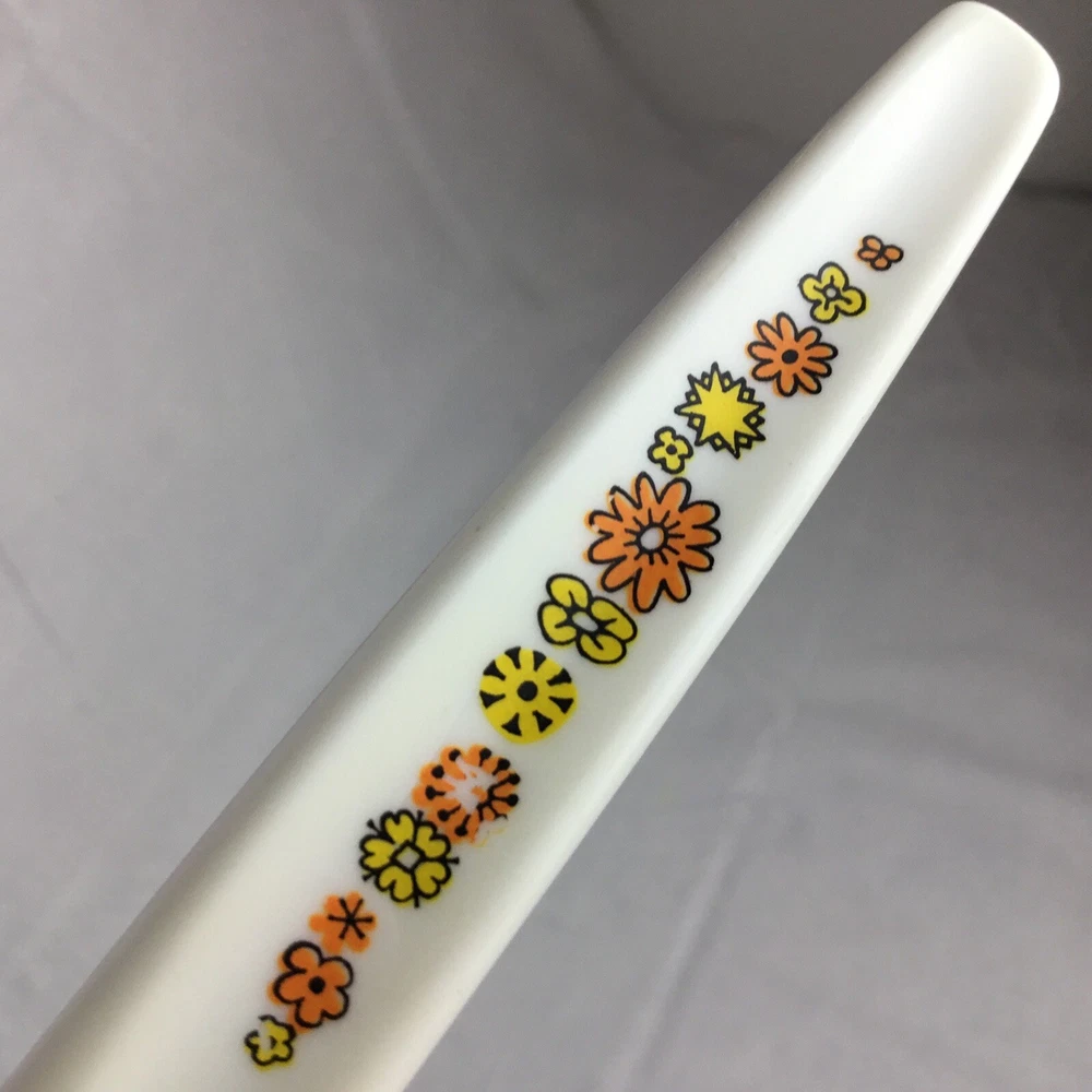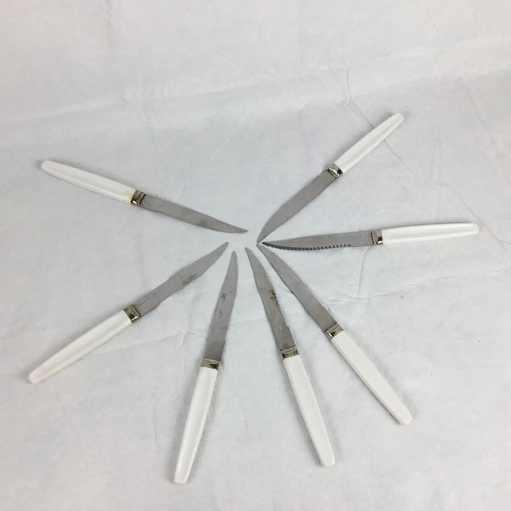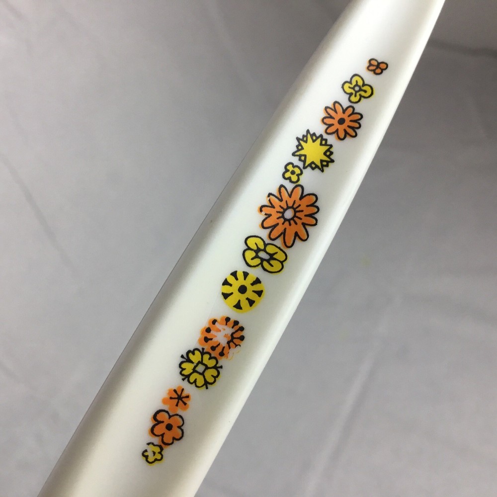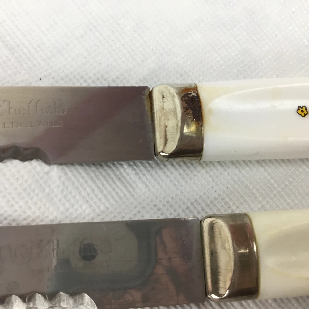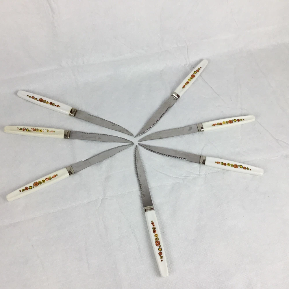 Vintage Regent Sheffield England cutlery steak knives set of 7. Orange yellow green flowers. Flower power. Nice addition to your Mid-century kitchen. One knife has rust a couple are yellowed and some have flowers worn. Overall nice addition to your vintage MCM kitchen ware. Please view all photos to make your decision on purchase. Any questions please ask and thanks for looking!! Condition is used preowned.