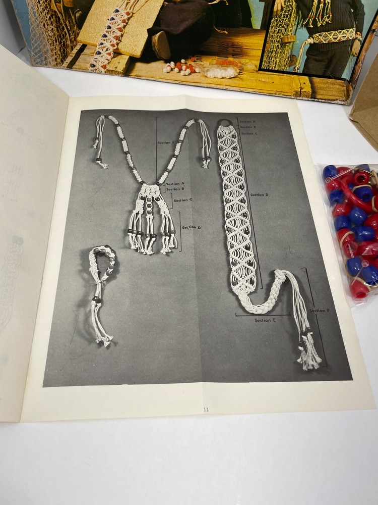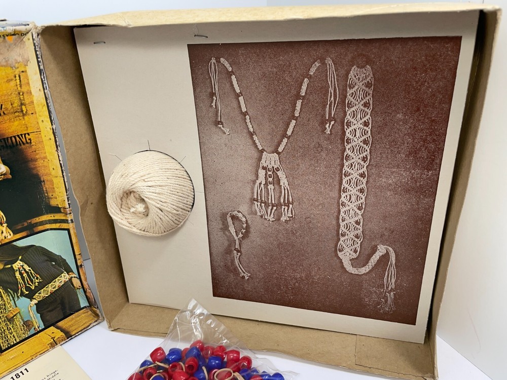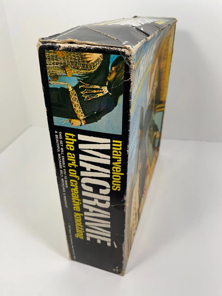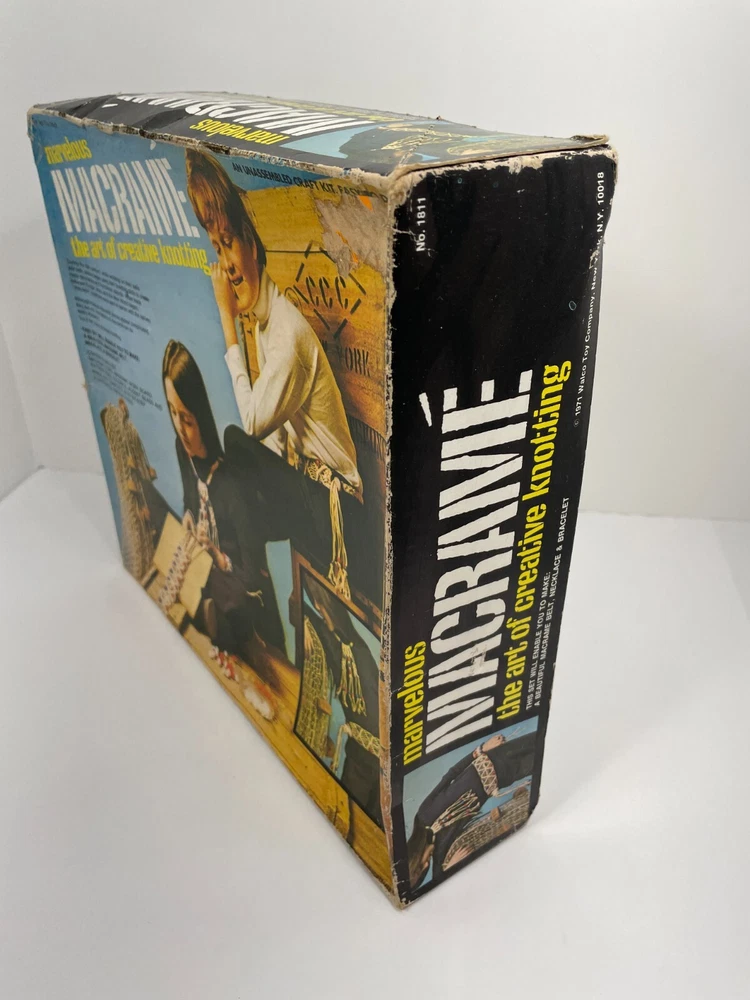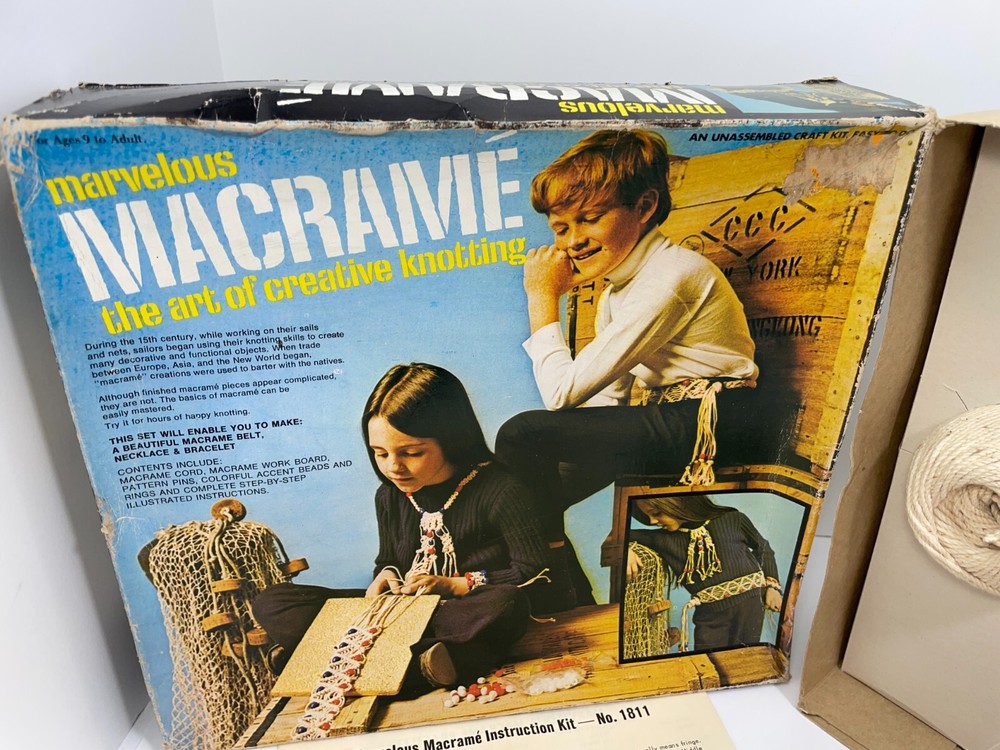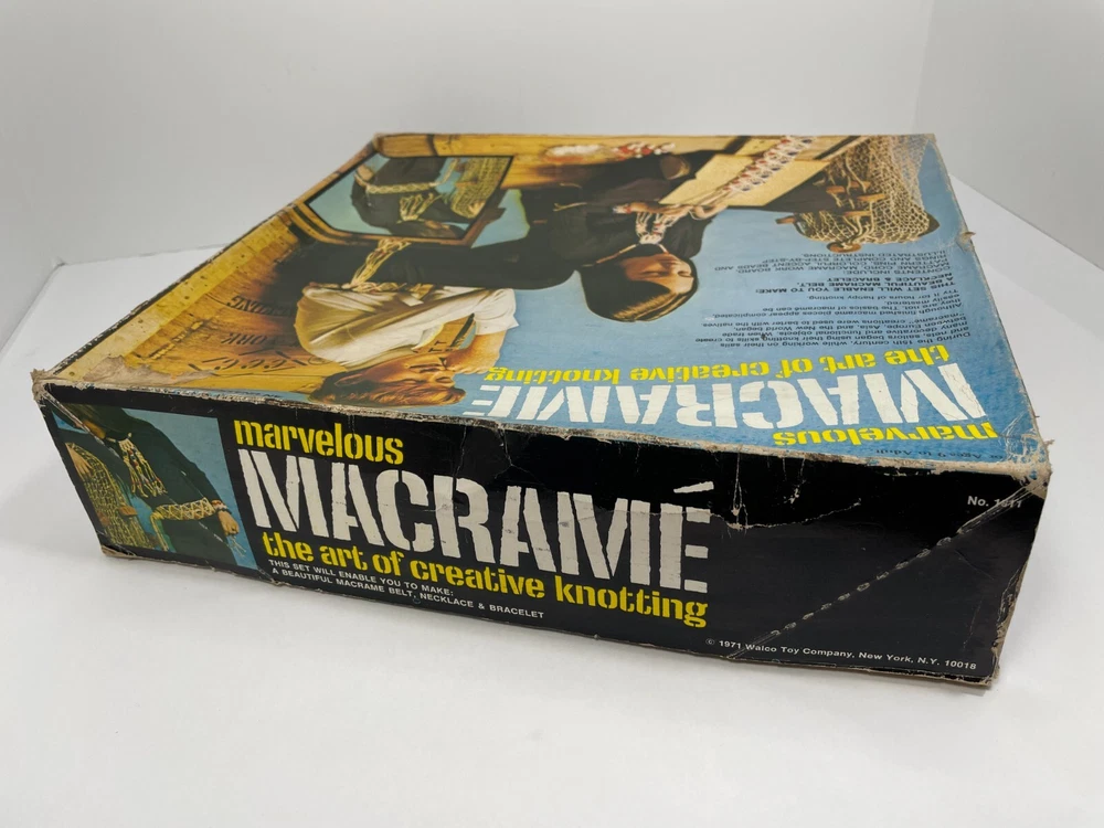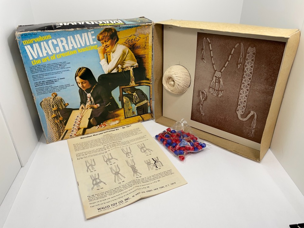 Up for sale-Vintage Retro 1971 Macrame Craft Kit Creative Knotting By Walco Toy Co New York Preowned open box, complete with original cord, beads and illustrated instructions, box does have some wear to it, see pics, overall cool unique funky item from the 70s, any other questions please ask. Thanks for looking