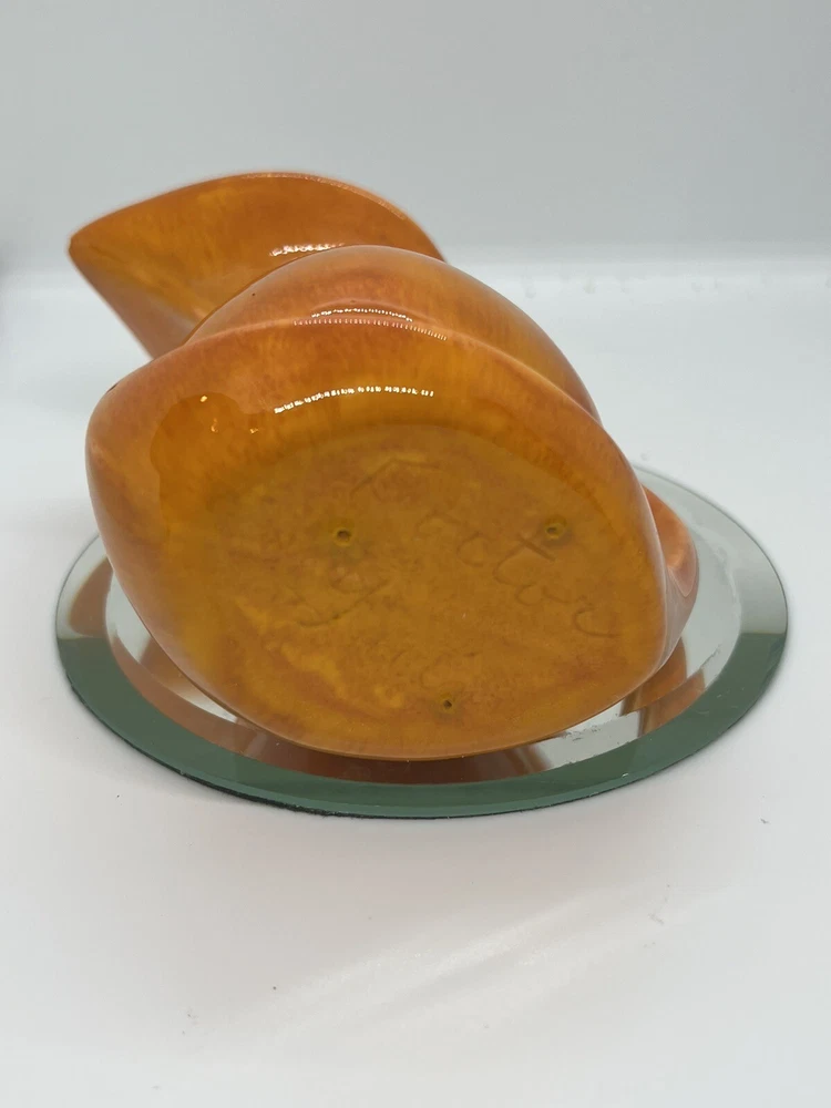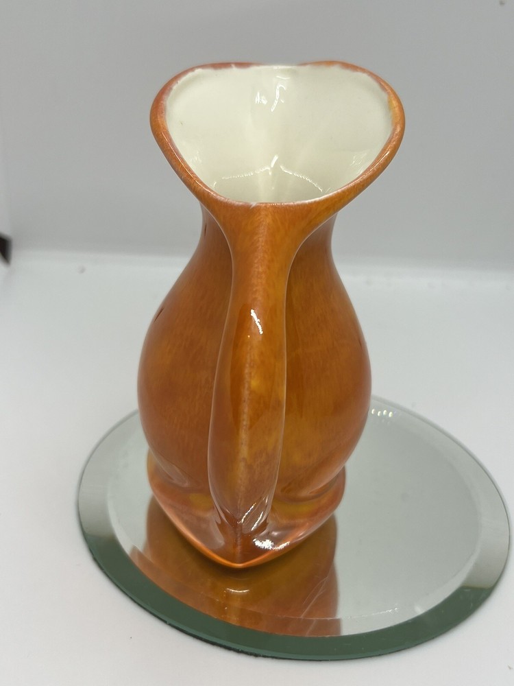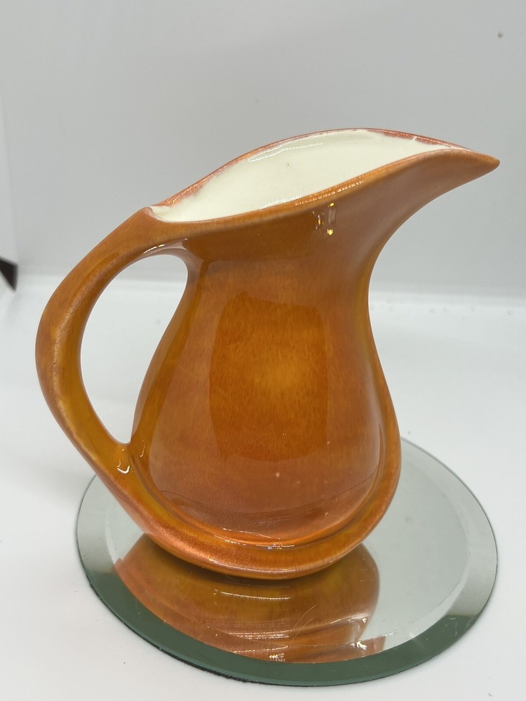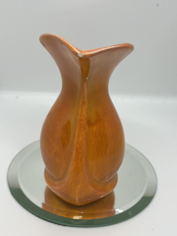 This vintage mid-century pitcher vase is a stunning piece of decorative art pottery. The 5.5" vase features a solid orange color and a high gloss finish. The vase is hand-painted and has a unique retro style that is sure to catch the eye of any collector. The pitcher vase is made of ceramic and is unmarked with no visible brand or model. The production technique used to create this piece is pottery, and it is handmade which adds to its unique charm. This decorative vase also comes with a handle, making it easy to move around and display. This is a must-have item for any collector of retro or art pottery. SELLING AS IS: Spout has chip. See detailed picture