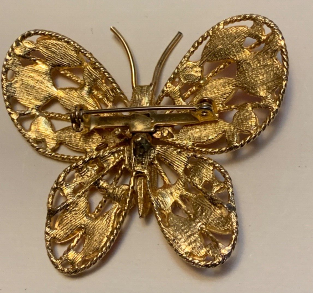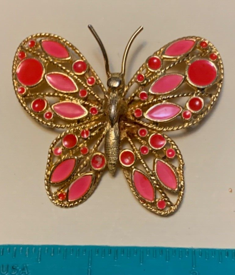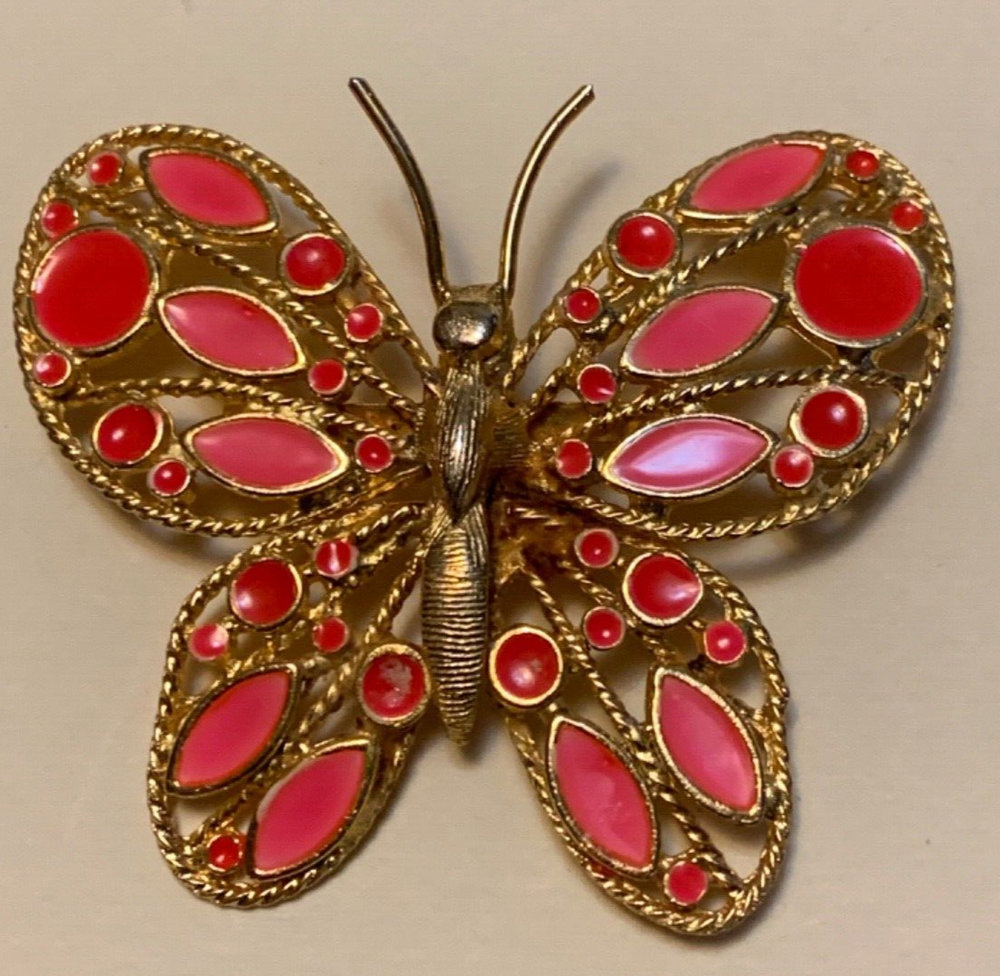 This item is a vintage (age unknown) pin or brooch in the shape of a butterfly. It is openwork gold tone metal with bright orange circles and spindle shapes on the wings. The orange is I believe CPE (cold plastic enamel). The color and style is very mid-century mod with the bright orange spots. It measures about 2 1/4" wide with a clasp on the back. Good condition, some wear to the orange. I am always happy to combine similar items (or items that will pack well together) for possible savings on postage. Please let me send a combined invoice before making payment. Media items (books, etc) can only be combined with other media items.