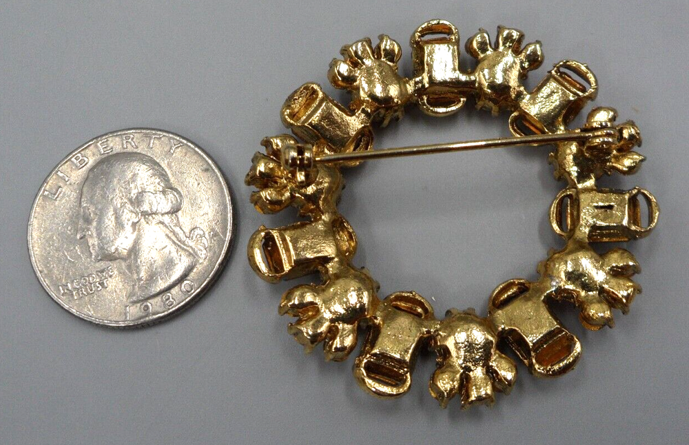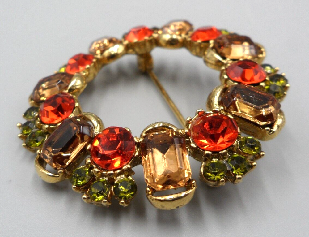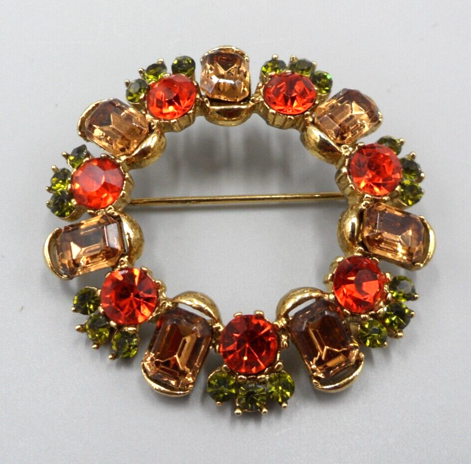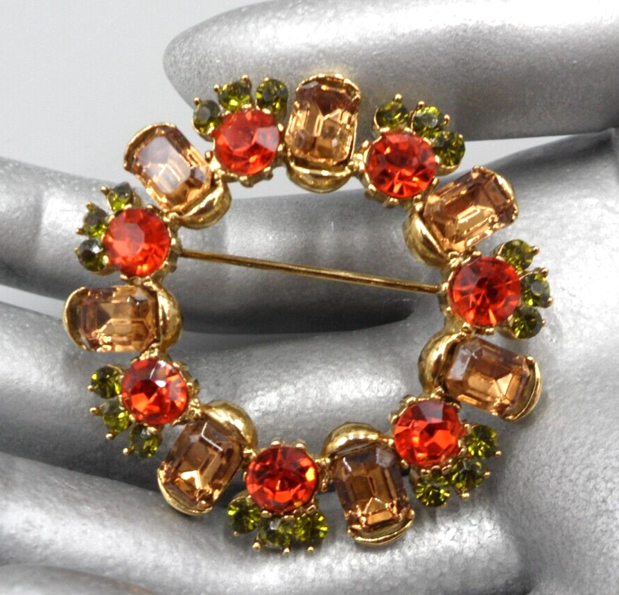 Vintage, 1950s era, rhinestone brooch. 1.75" in diameter. Topaz-colored, emerald cut glass stones alternating with orange glass chatons topped by trios of peridot green chatons form an incomparable, mid century circle pin. Rolling safety clasp. This brooch is being stored in my pet and smoke-free studio. It will be protectively wrapped and shipped in a box .