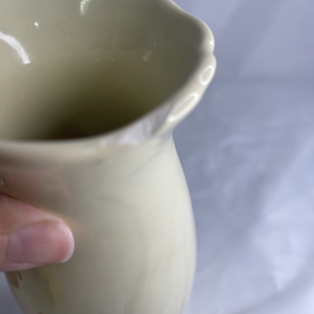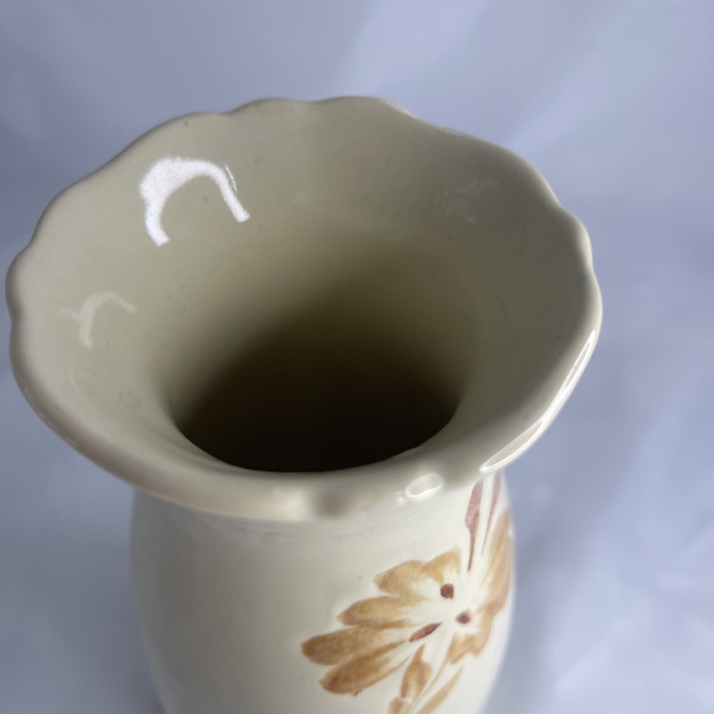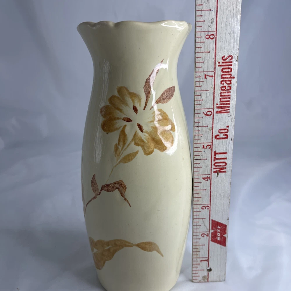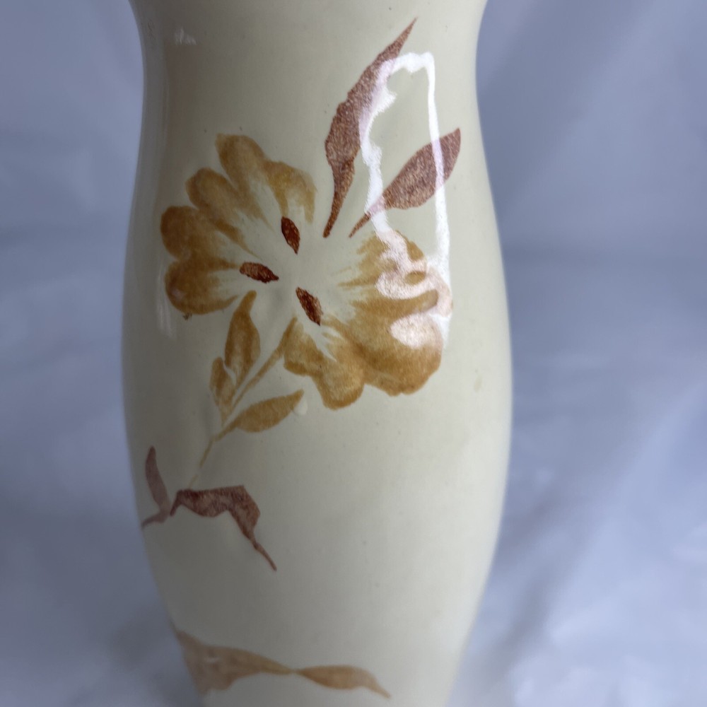 This beautiful vintage vase from Royal Haeger is a true gem for any collector or lover of Mid Century decorative pottery. The vase showcases a stunning orange, tan, and beige color combination with intricate flower and leaf designs that bring to life the Art Deco style. It is made of high-quality ceramic material and is dishwasher safe, making it not only a decorative piece but a functional one as well. One chip on rim as seen in photos.