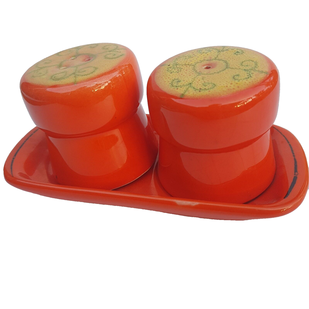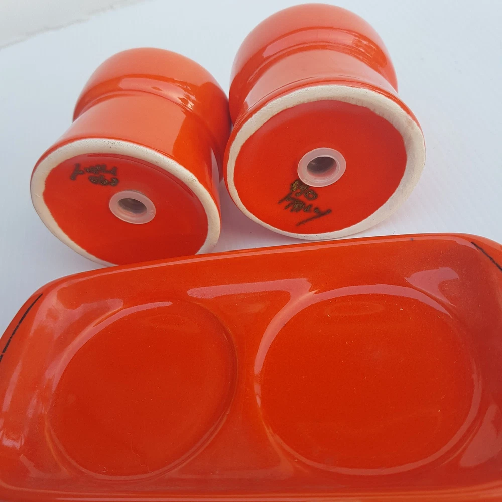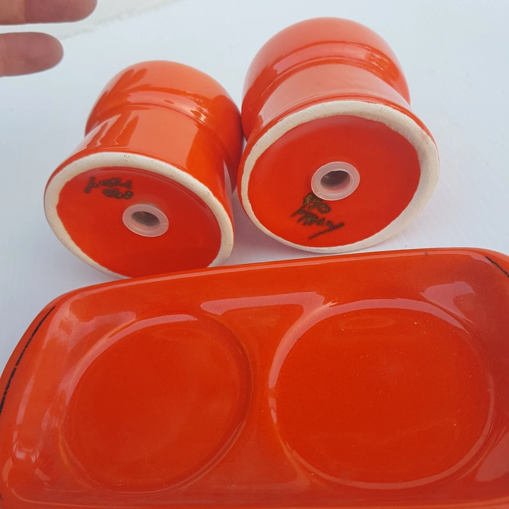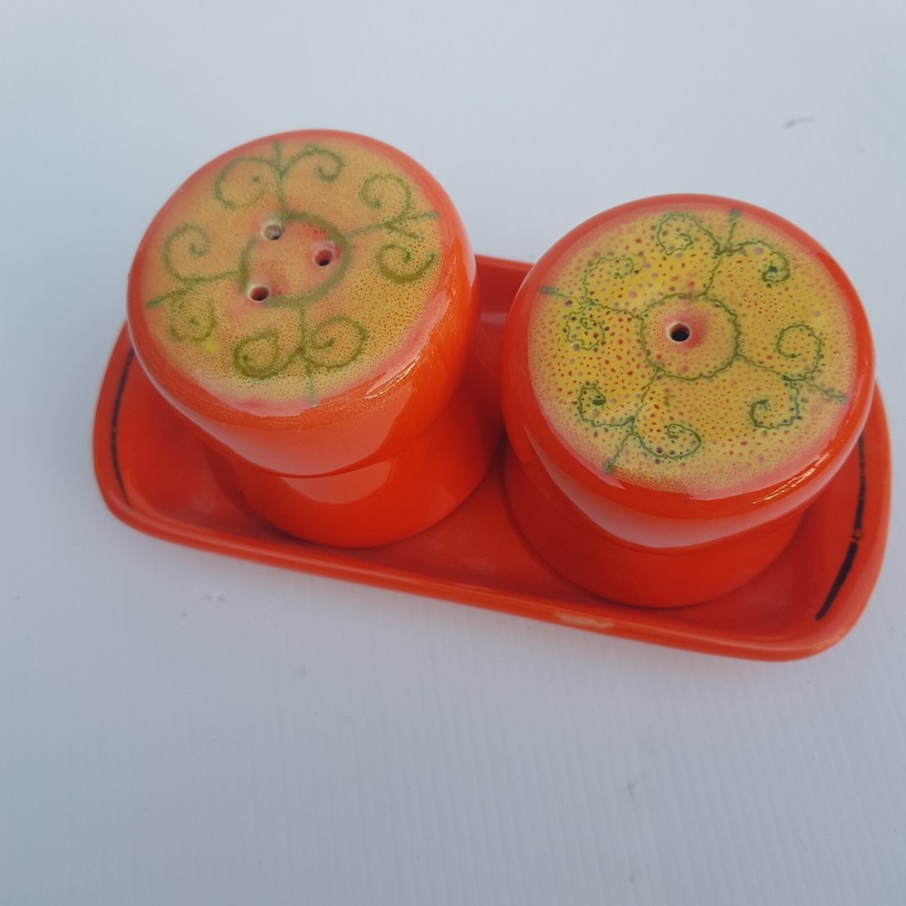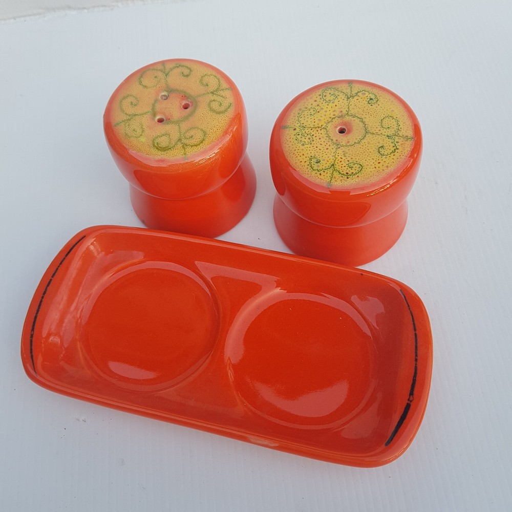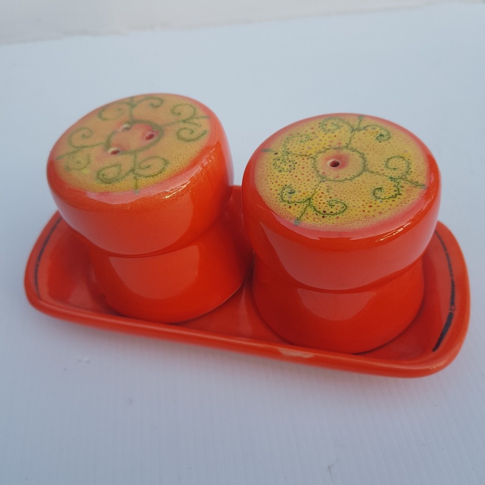 Absolutely stunning and bright with these wonderful number Italian salt and pepper shaker set complete with the tray. These are pottery and have a beautiful feature of colour on the top which is all hand made and hand painted. From the mid century these items would make a beautiful gift and would stand out with any table setting.
