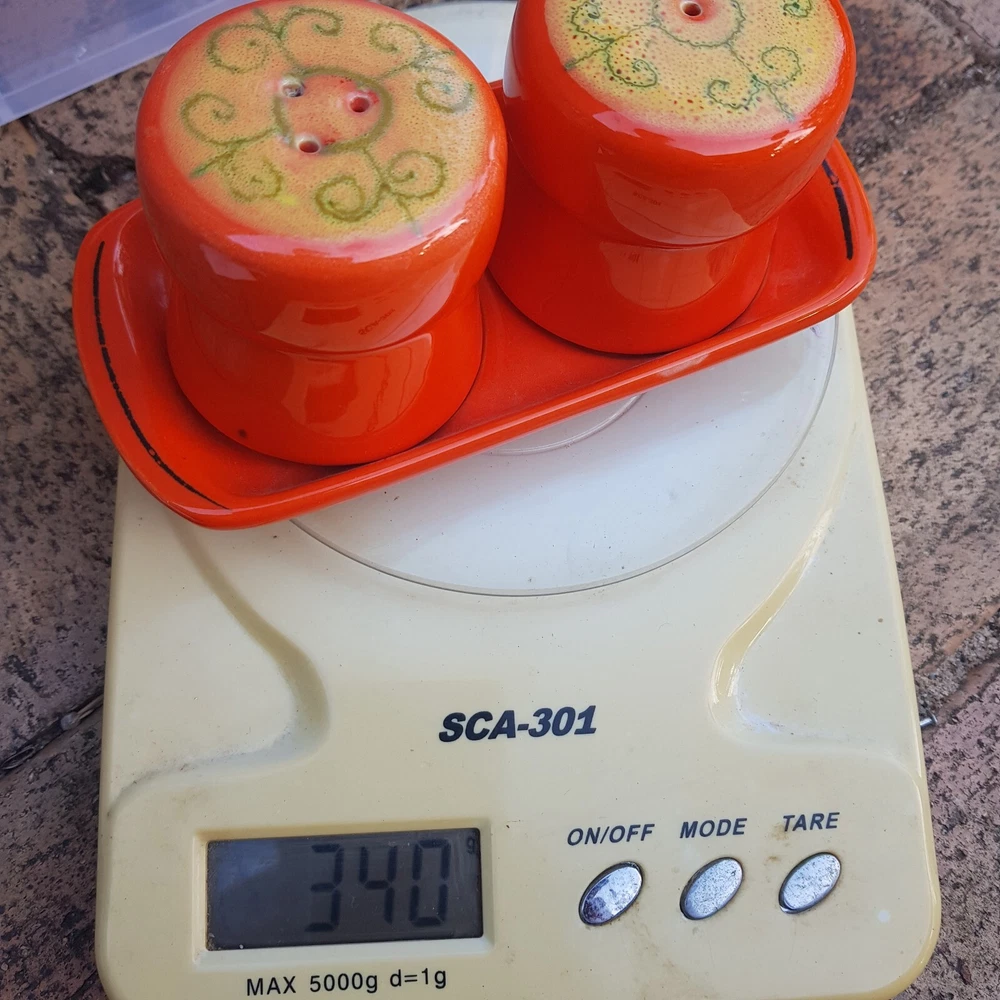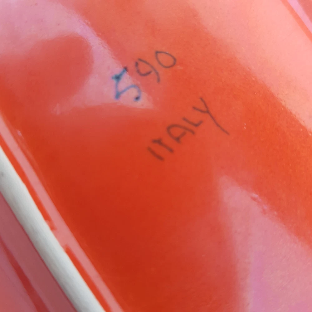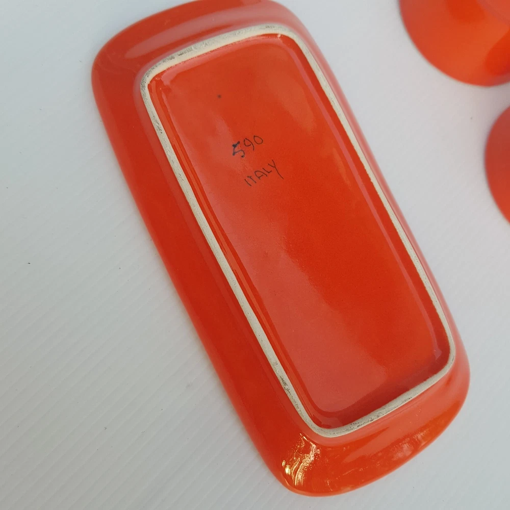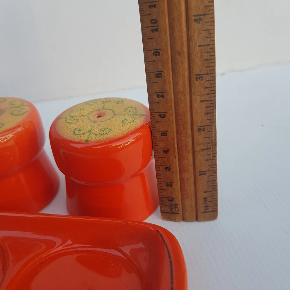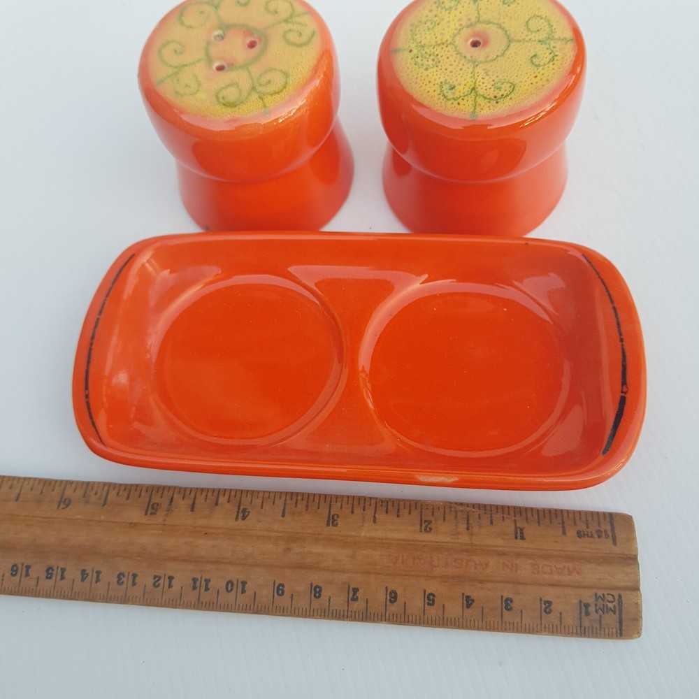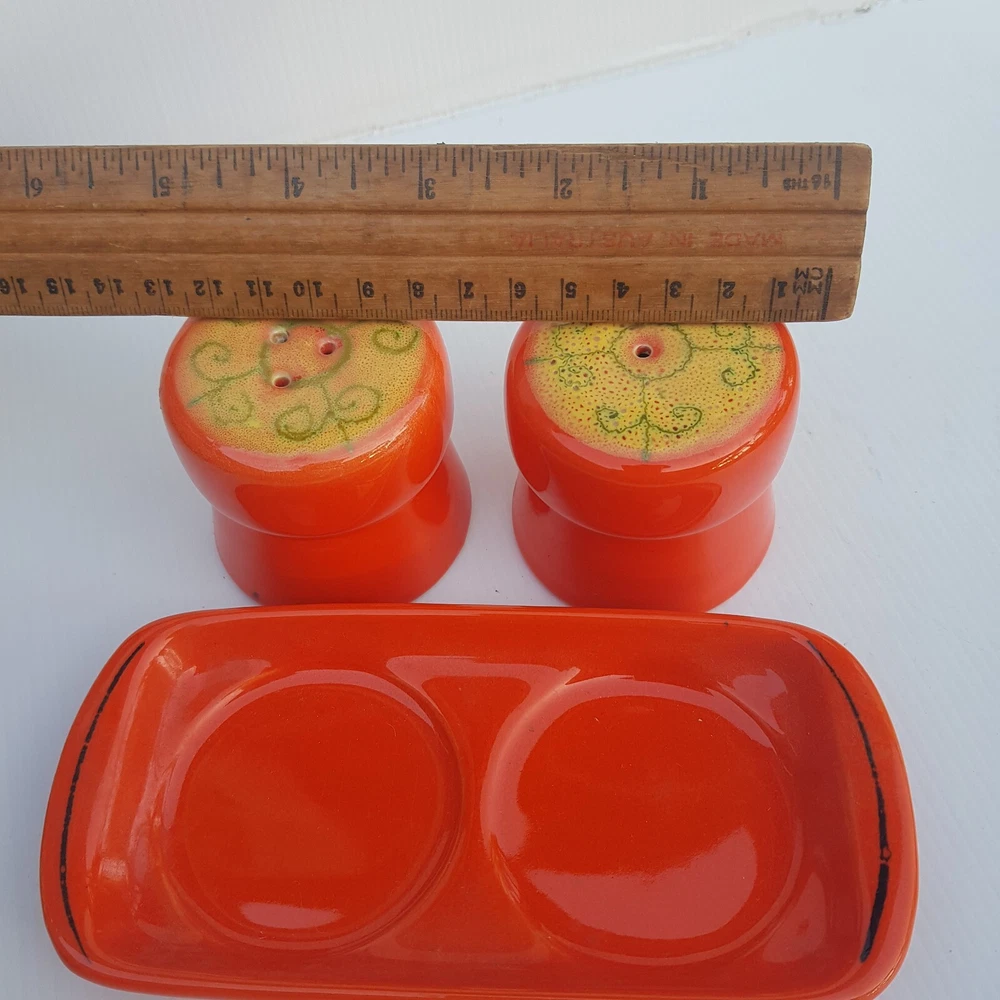 Absolutely stunning and bright with these wonderful number Italian salt and pepper shaker set complete with the tray. These are pottery and have a beautiful feature of colour on the top which is all hand made and hand painted. From the mid century these items would make a beautiful gift and would stand out with any table setting.
