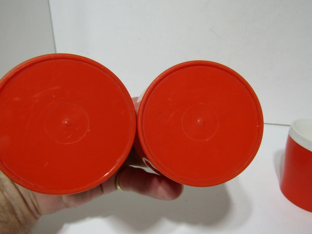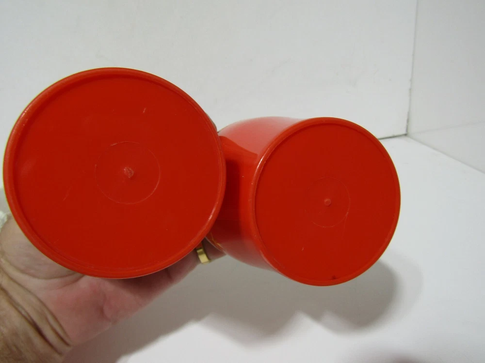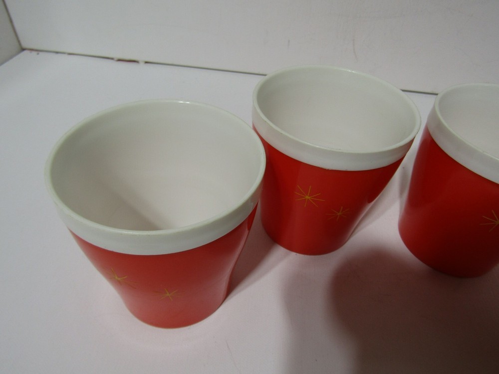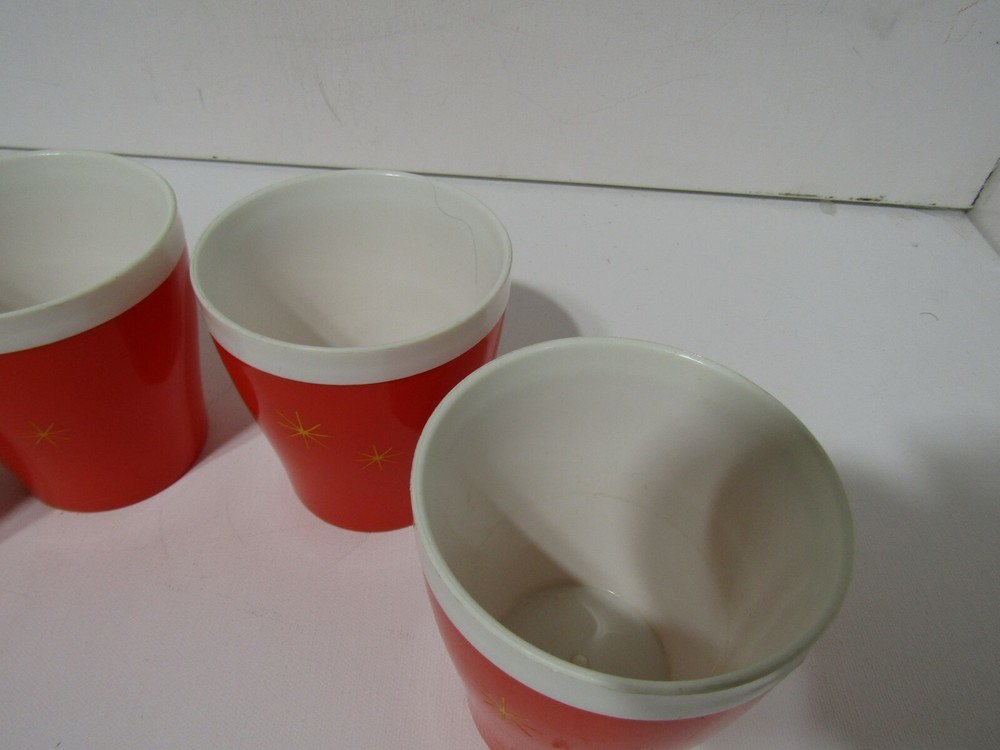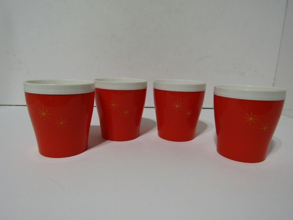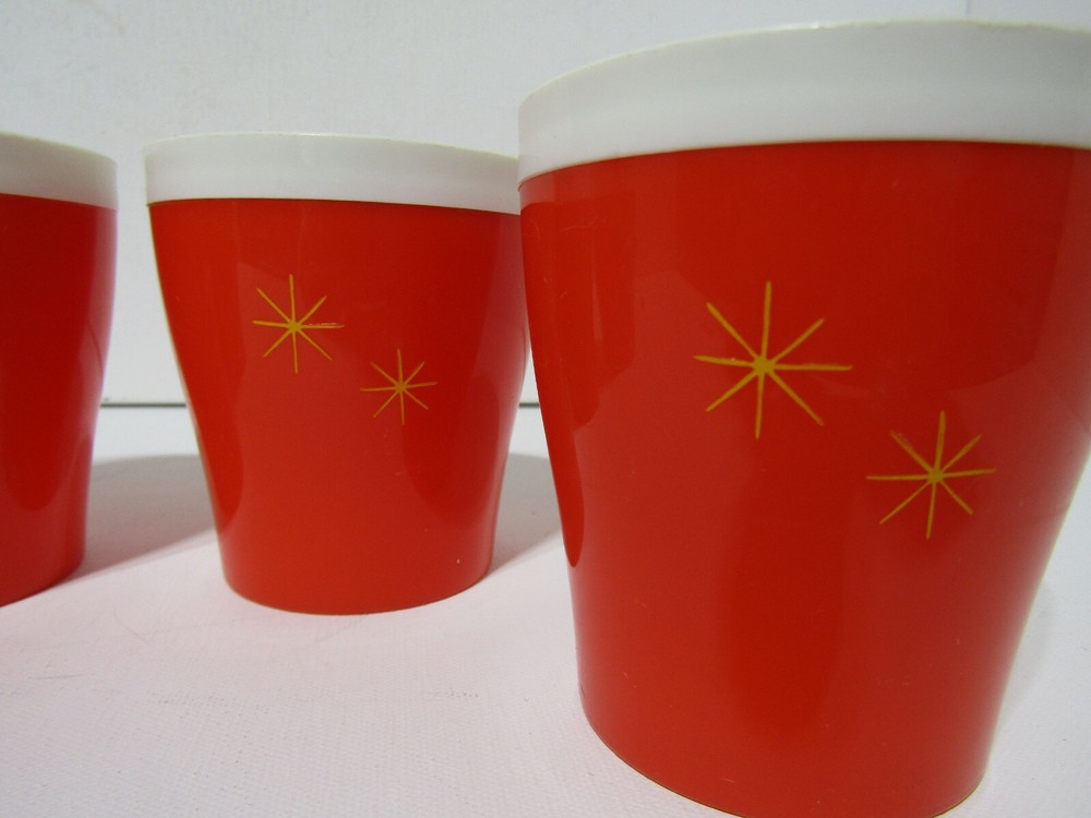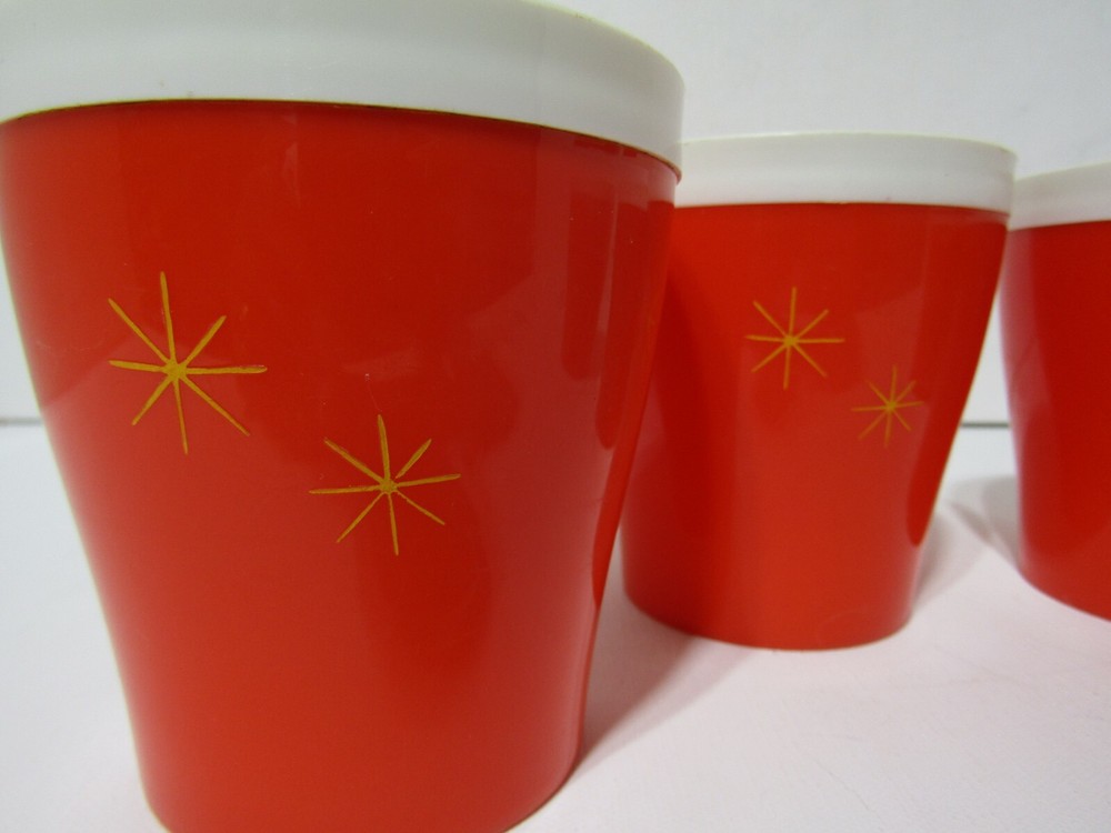 Vintage Set of 4 Mid Century Modern insulated Plastic Tumblers. Orange with Gold stars. these are in excellent preowned condition considering there age. they are orange with the gold stars. they measure approximately 3 3/4" tall and 3 3/8" in diameter they hold 8 oz capacity. Retro chic.