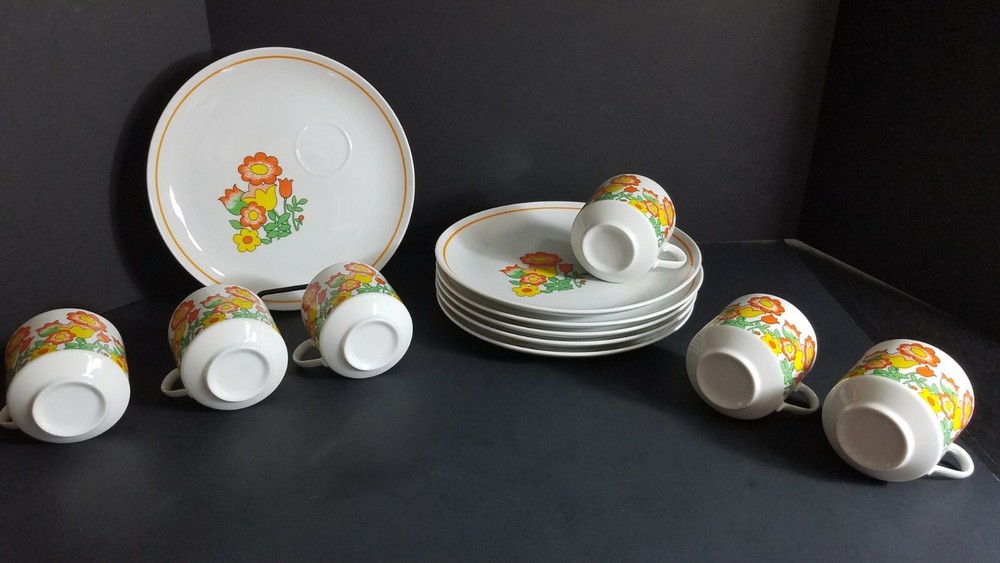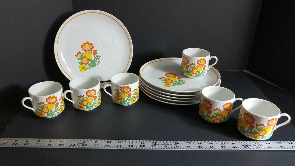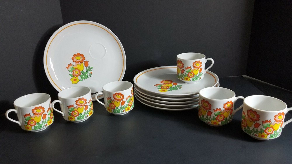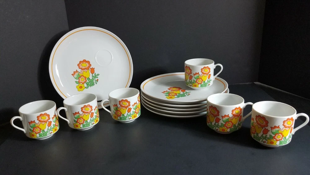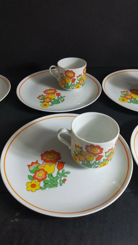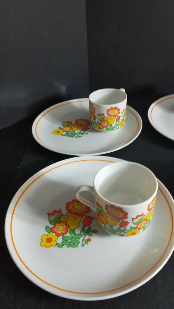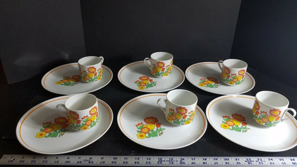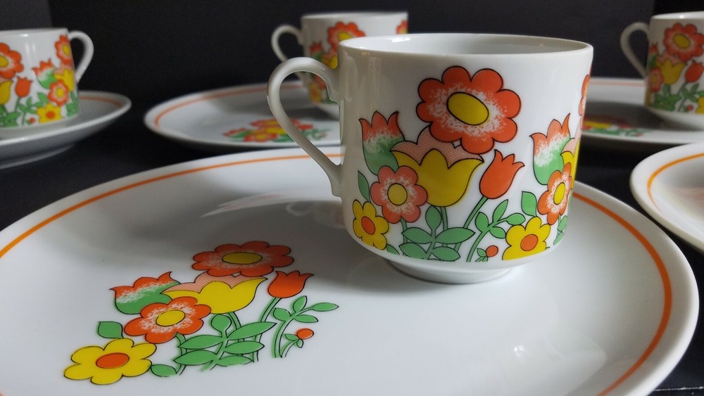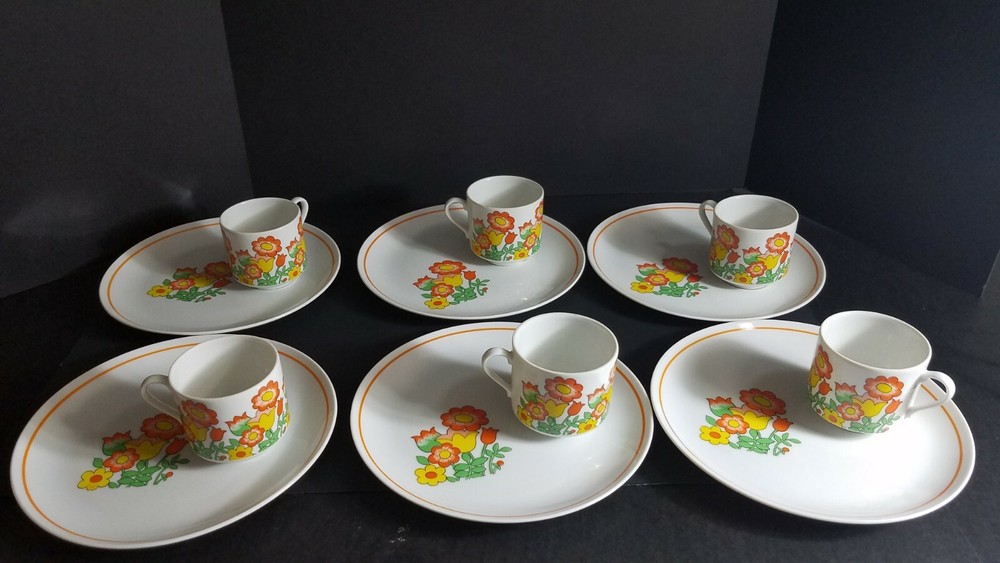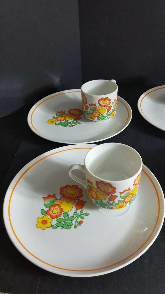 These Mid Century Modern Snack Sets are fantastic. There are 6 sets and each set includes a plate and cup. Groovy orange and yellow flowers, classic pattern in 1970's. Plates are 9 1/2" diameter and cups are 3" tall with a 3" diameter. Sets are in very good condition with very minor scratches, graphics are solid and shiny. Please see pictures for details. Perfect for your retro luncheon party. Flower Power, don't miss out!