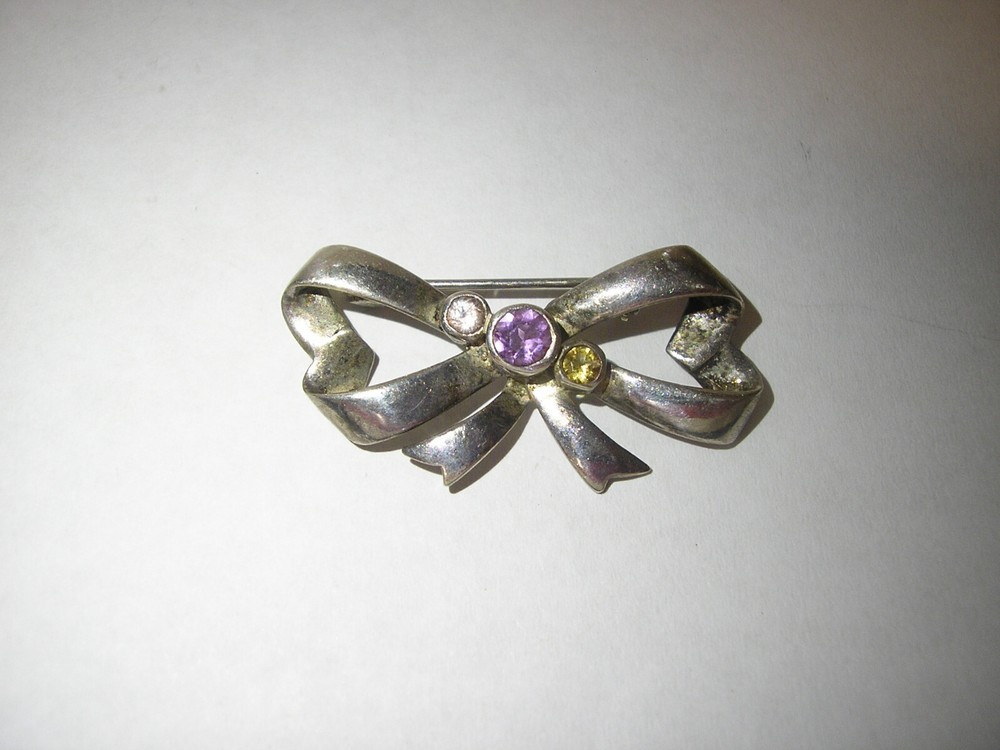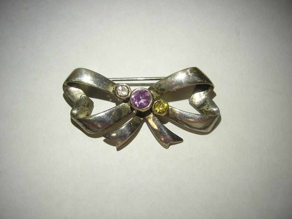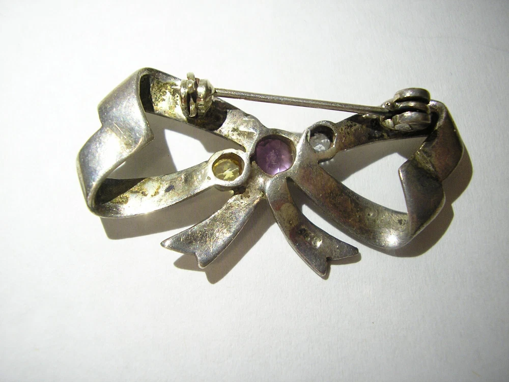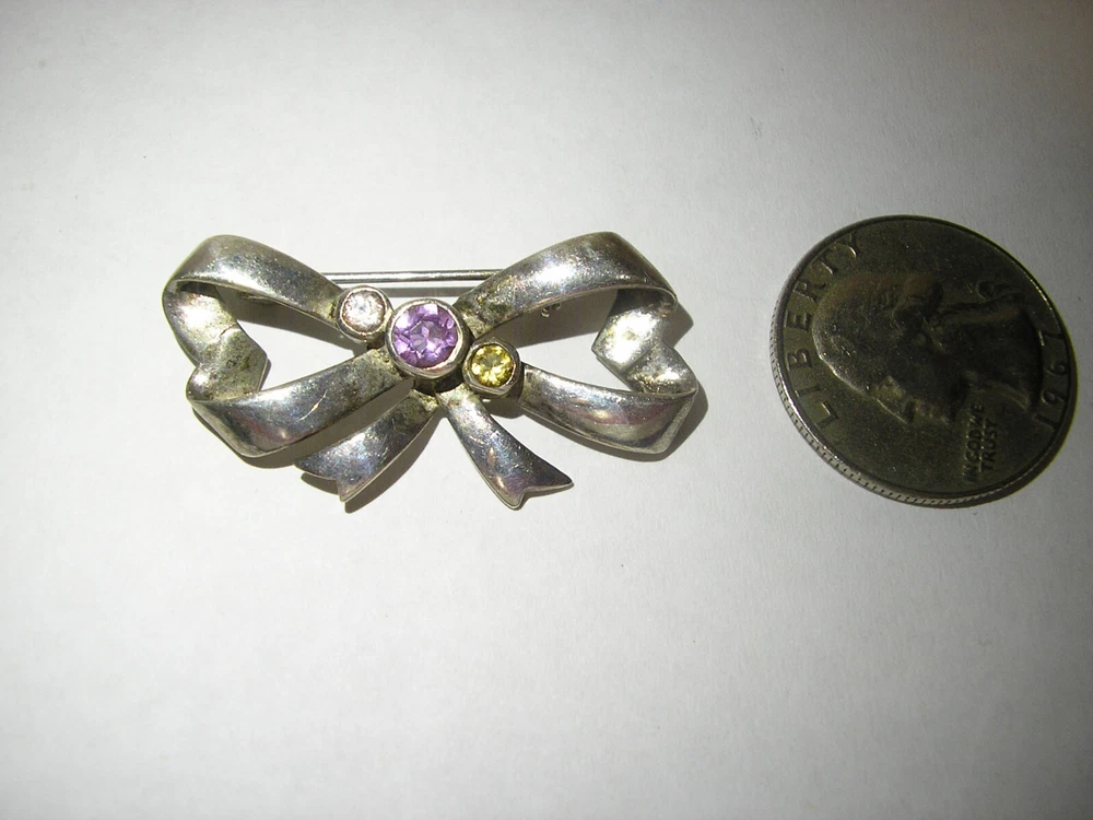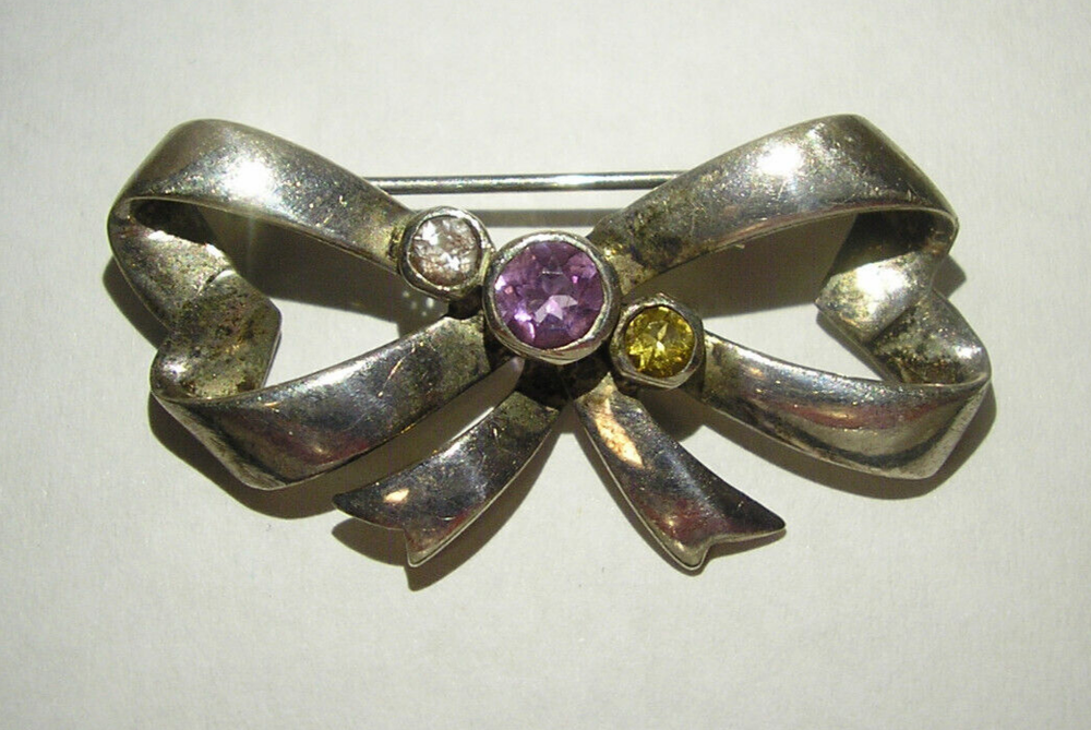 Vintage, mid 20th century sterling silver bow brooch pin with three gemstones. Brooch is marked 925. Stones appear to be a white CZ or perhaps very pale blue aquamarine, amethyst and citrine. Brooch shows some minor tarnish from age. Brooch measures 1 5/8 x 3/4 inches and weighs 6.1 grams.