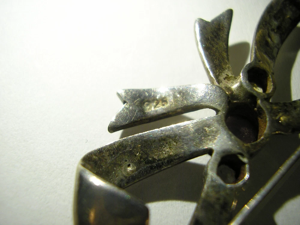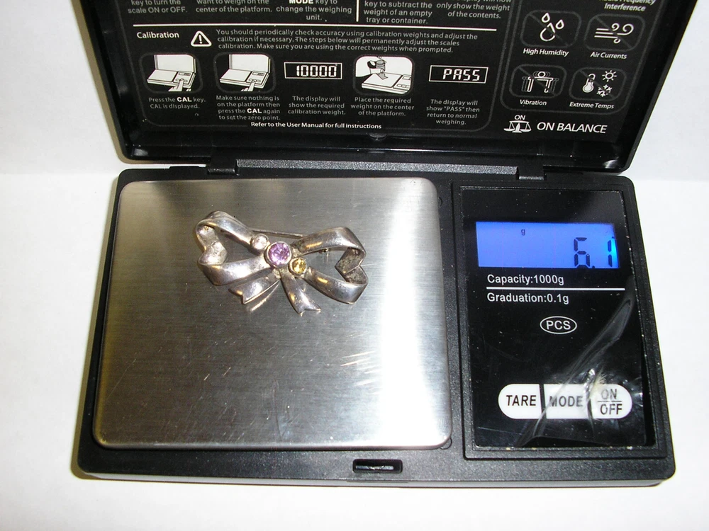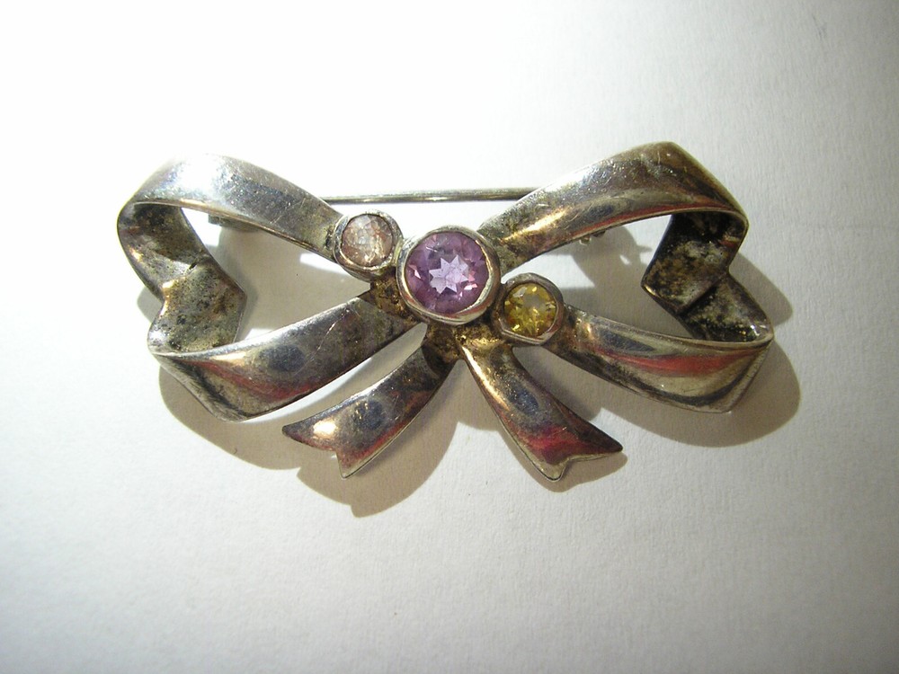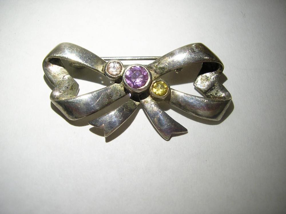 Vintage, mid 20th century sterling silver bow brooch pin with three gemstones. Brooch is marked 925. Stones appear to be a white CZ or perhaps very pale blue aquamarine, amethyst and citrine. Brooch shows some minor tarnish from age. Brooch measures 1 5/8 x 3/4 inches and weighs 6.1 grams.