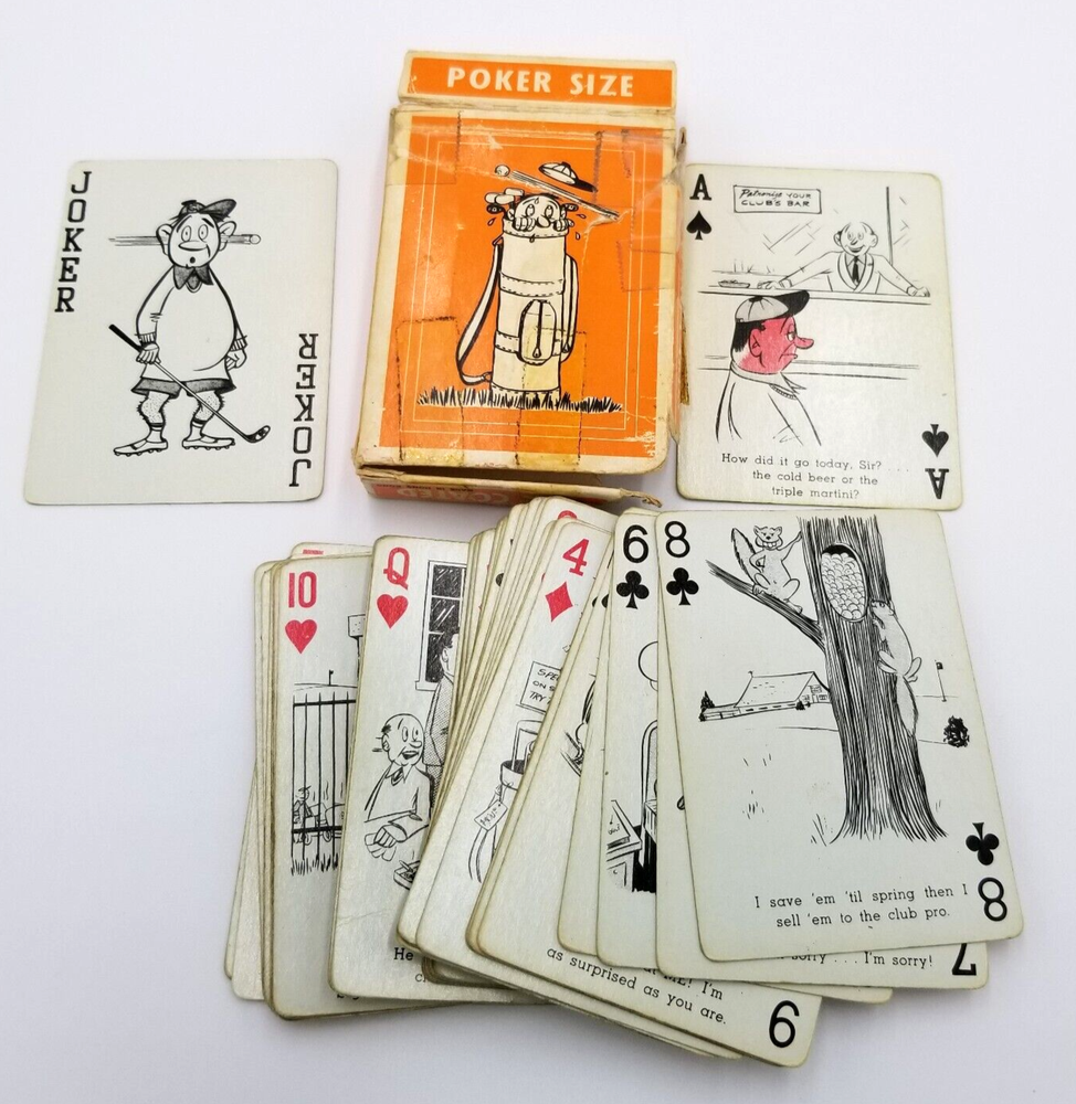 Vintage Tee-Up Playing Cards Funny Cartoon Golfing Golf by Creative Co The box is in poor condition but the cards are still in good condition. Complete set including the Jokers.