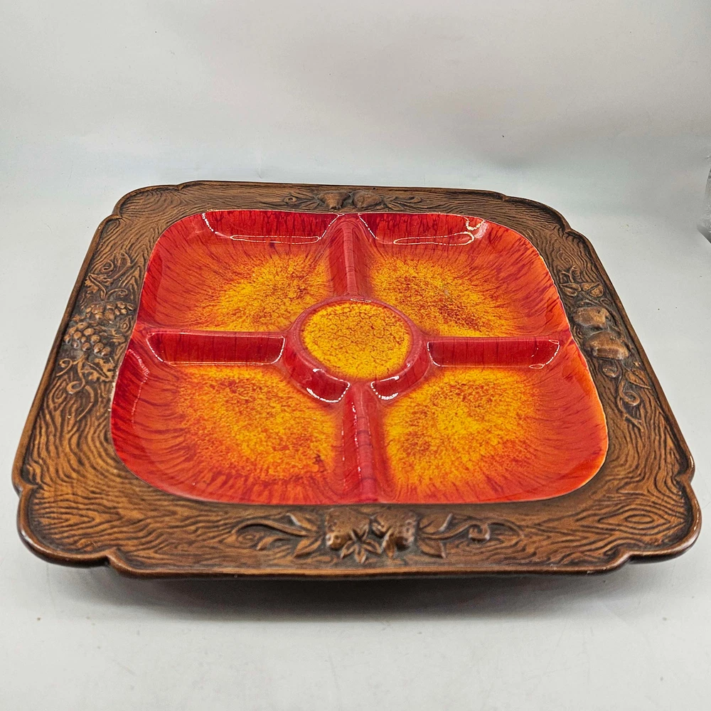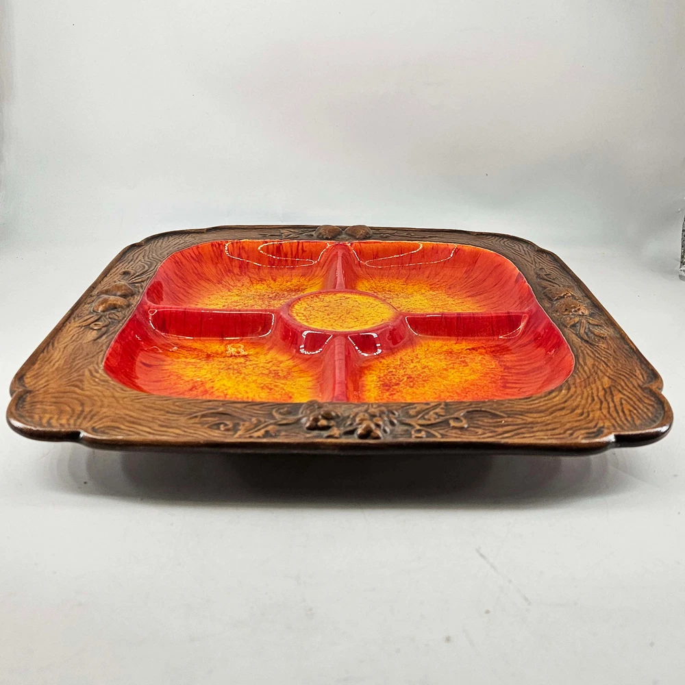 Vintage Treasure Craft USA Mid Century Orange Red Divided Candy Relish Dish. Measures about 13.5X 13.5" , 1" T. In excellent condition. Listing and template services provided by inkFrog