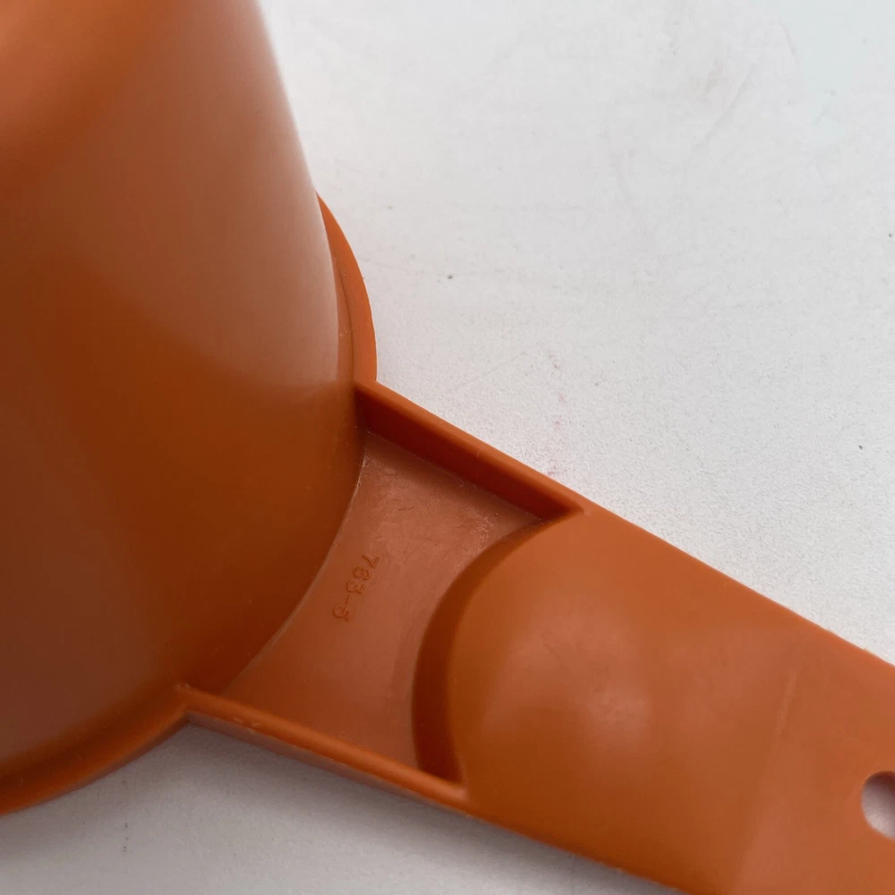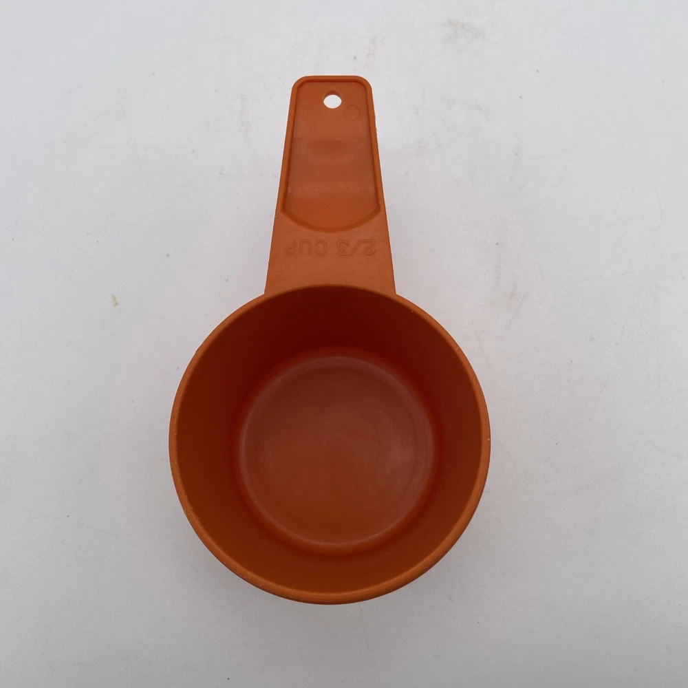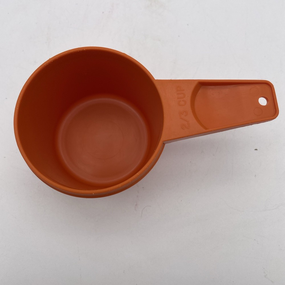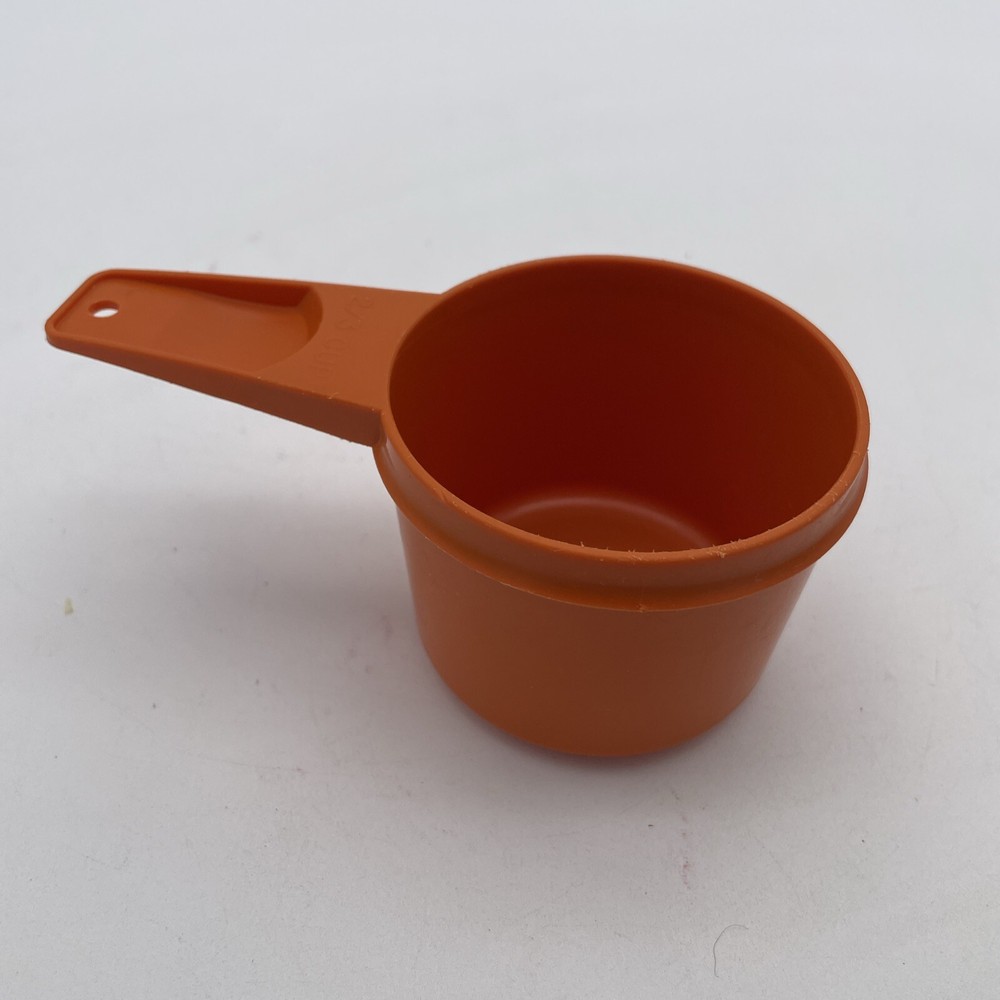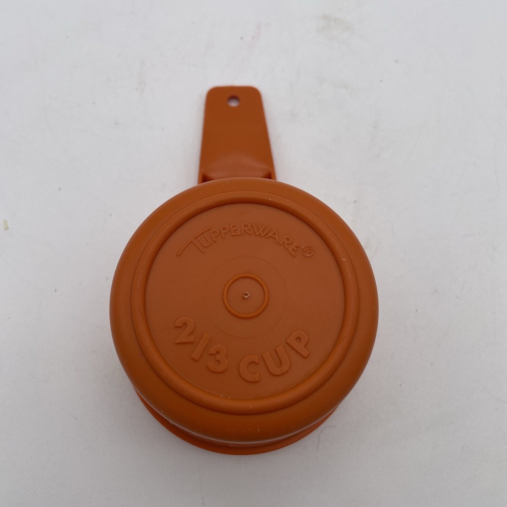 This vintage Tupperware measuring cup is a must-have for any collector or lover of mid-century modernism. The cup has a capacity of 2/3 and comes in a vibrant orange color, making it a standout addition to any kitchen. The plastic material and mid-century modern design give it a unique feel that is both stylish and functional. This original, dry measuring cup is perfect for measuring out ingredients and is a great addition to any kitchen tool collection. The cup is from the United States and was manufactured in the 1970s, making it a true antique. It is not handmade and comes from the Tupperware brand. Add this vintage gem to your collection today!