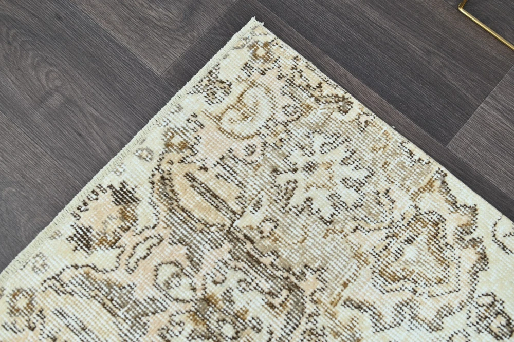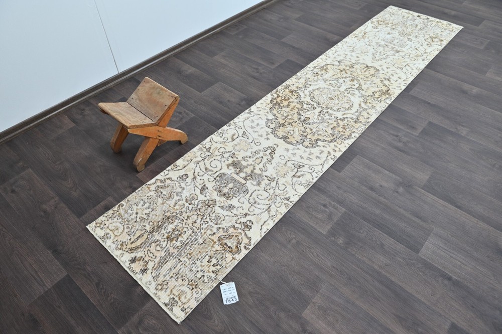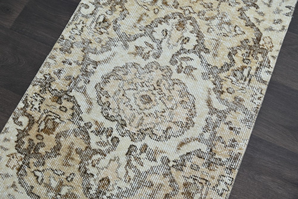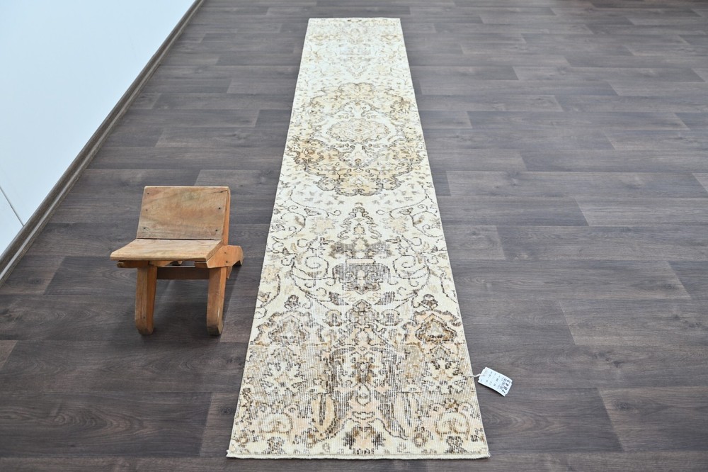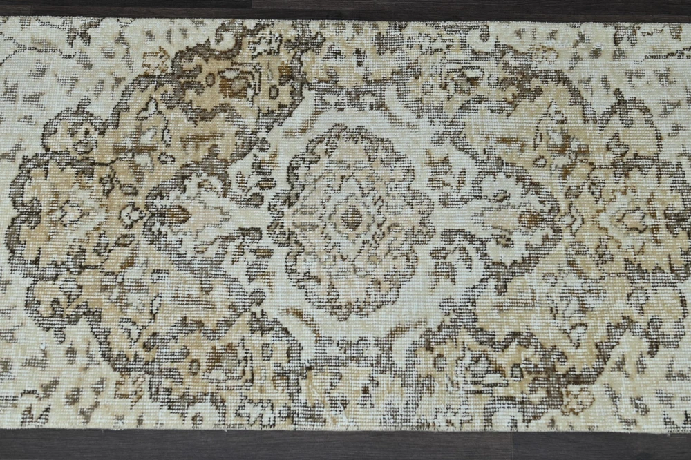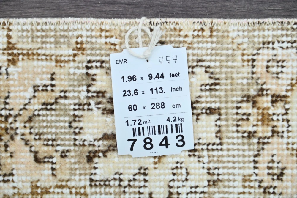 This beige 2x9 vintage rug is a timeless art piece made by artisans in the Oushak Anatolia region of Turkey. This carpet was hand woven with fine quality natural wool which extends the durability of the rug for generations. This unique Turkish vintage rug was handmade during the 1960’s and is made of 100% wool on a cotton foundation. If you’re looking for an authentic oriental carpet to invigorate your home, this oriental Turkish rug will be a great add to any decor style. This anatolian rug measures 1'9 x 9'4 feet - 23 x 113 inches - 60x288 centimeters - SKU:7843 All vintage rugs we offer are thoroughly washed and cleaned and are ready to use as soon as you receive them. Age-related wear and natural inconsistencies are inherent in all handmade vintage rugs. Each vintage rug we offer is one-of-a-kind and authentic so there's only one unit in stock! We offer free worldwide shipping for all vintage rugs in 1-2 business days. It takes 3-6 business days business days to reach North America, 3-5 for Europe and 7-10 to Australia and New Zeeland. We pay special attention to make sure that the colors of the vintage rugs are represented as accurately as possible. Still, there may be slight variations in what you see on your computer/phone depending on the screen’s color, contrast, and brightness.