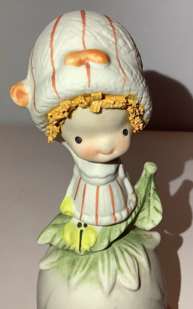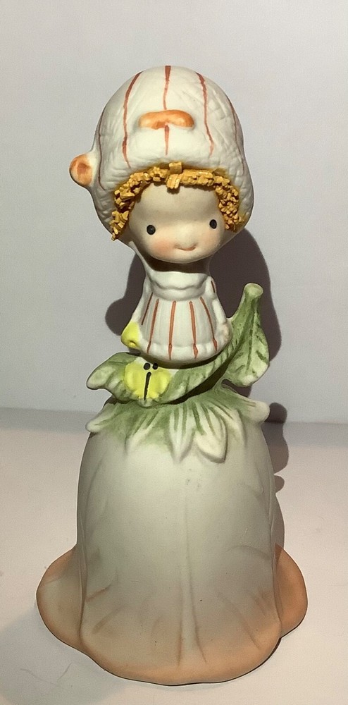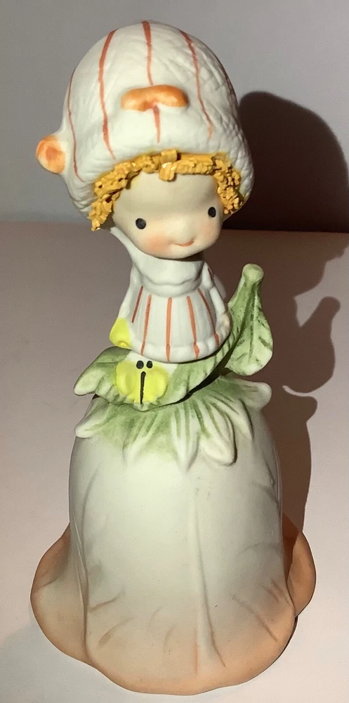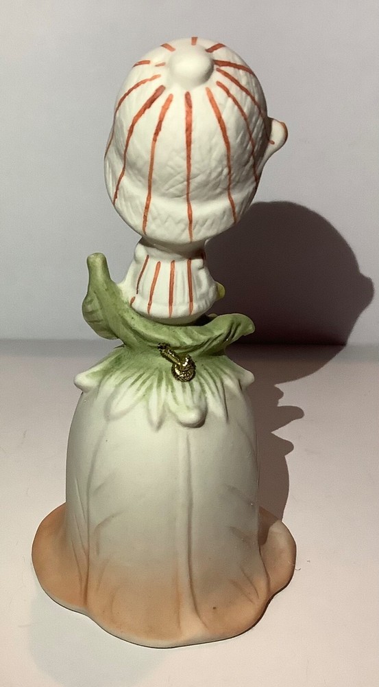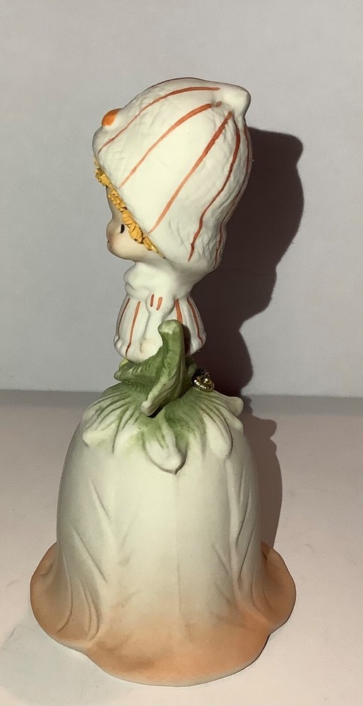 Vintage UCTCI Japan Flower Girl Orange Green Bisque Pottery Bell. Measures 5” tall x 2.5” across. Foil sticker inside bell.