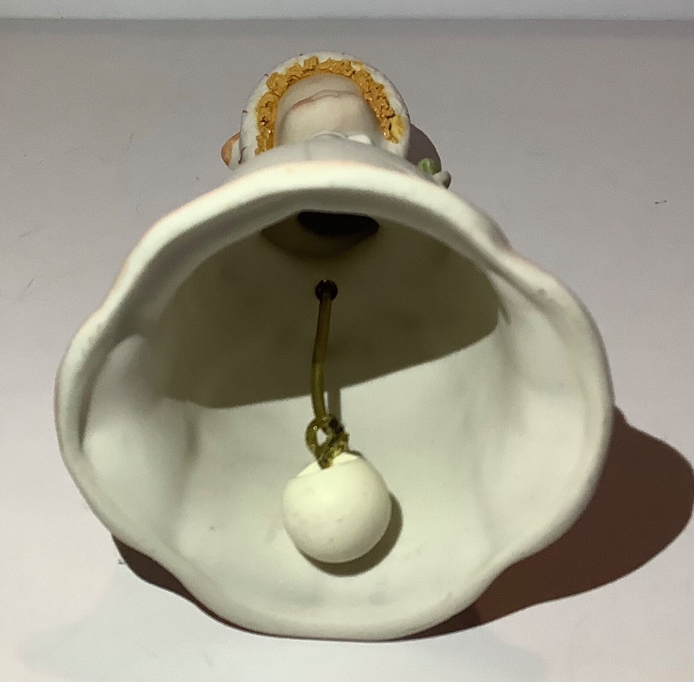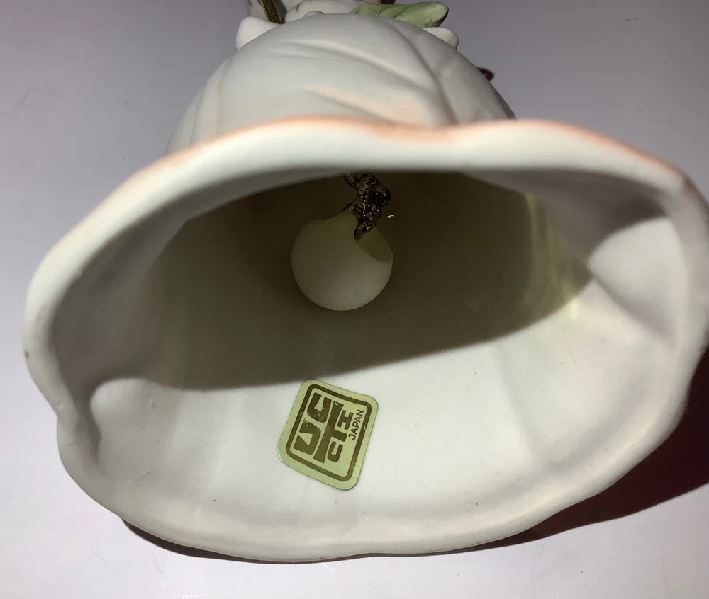 Vintage UCTCI Japan Flower Girl Orange Green Bisque Pottery Bell. Measures 5” tall x 2.5” across. Foil sticker inside bell....