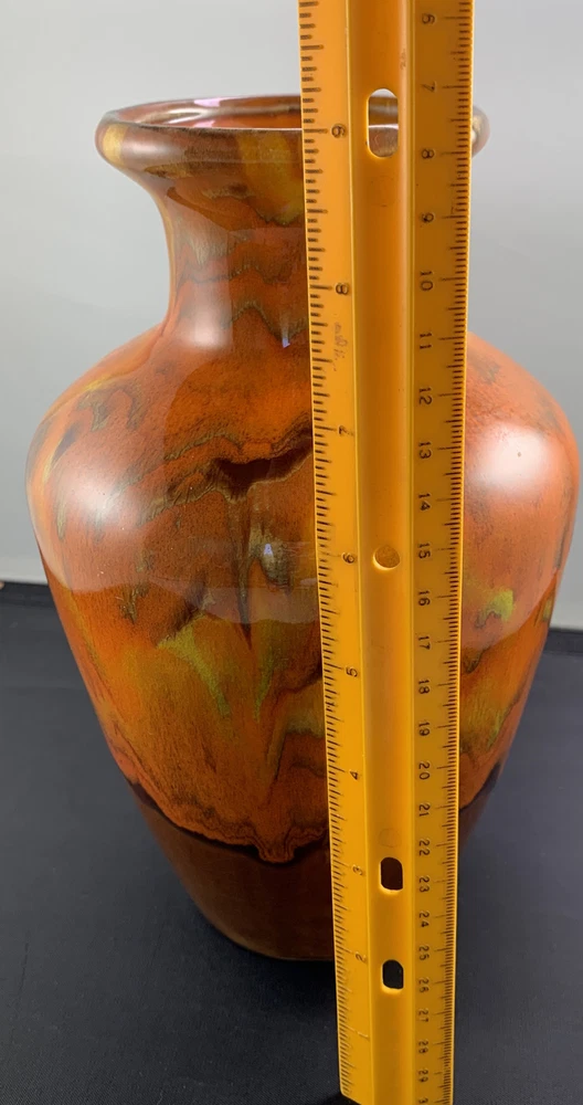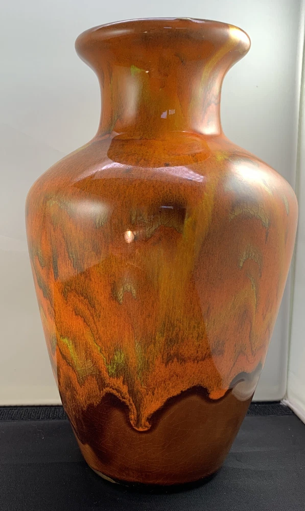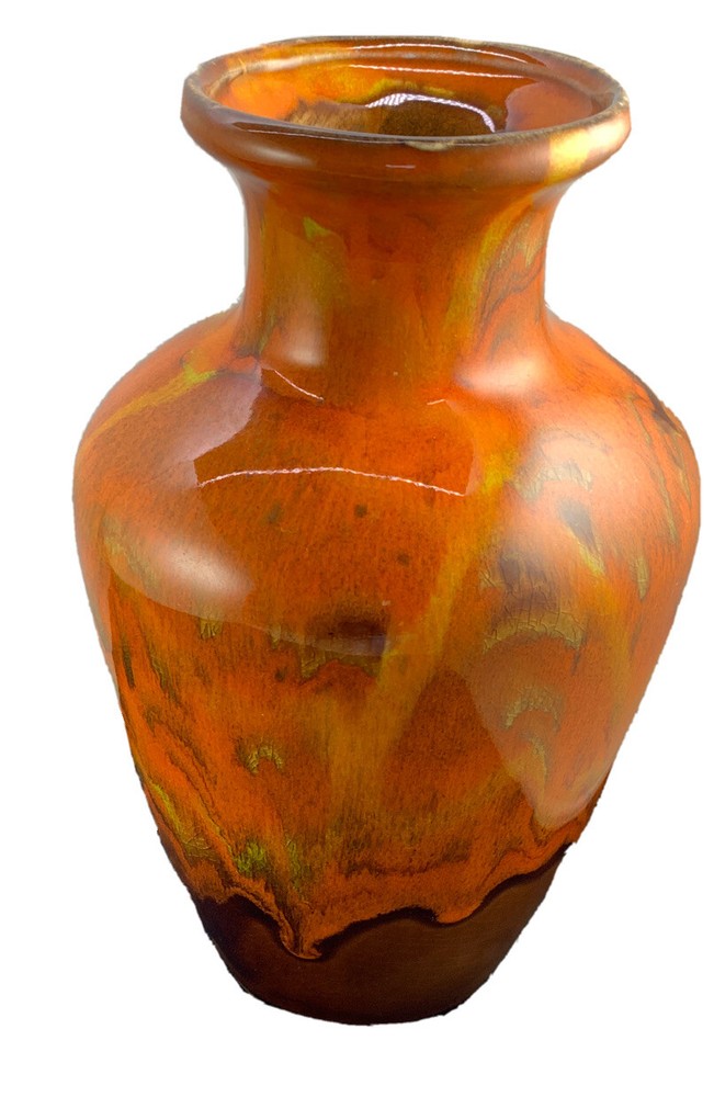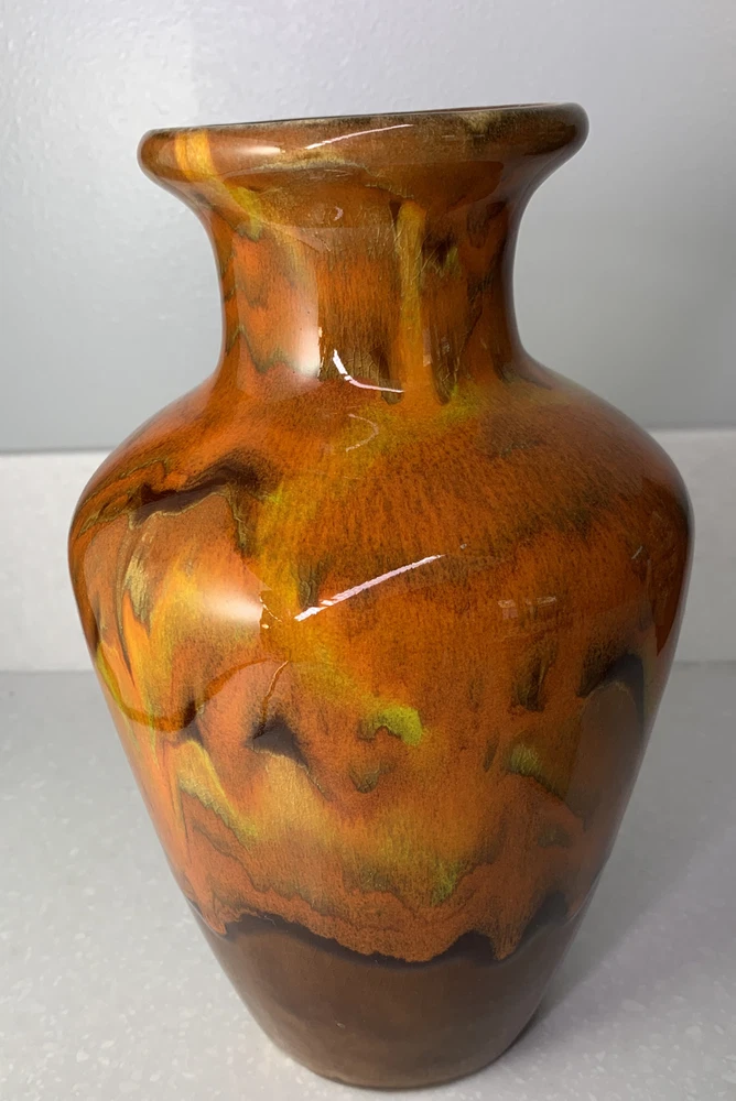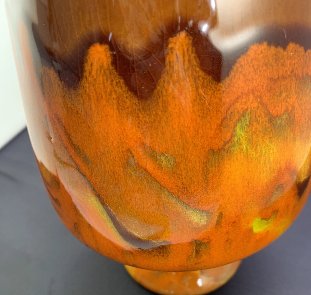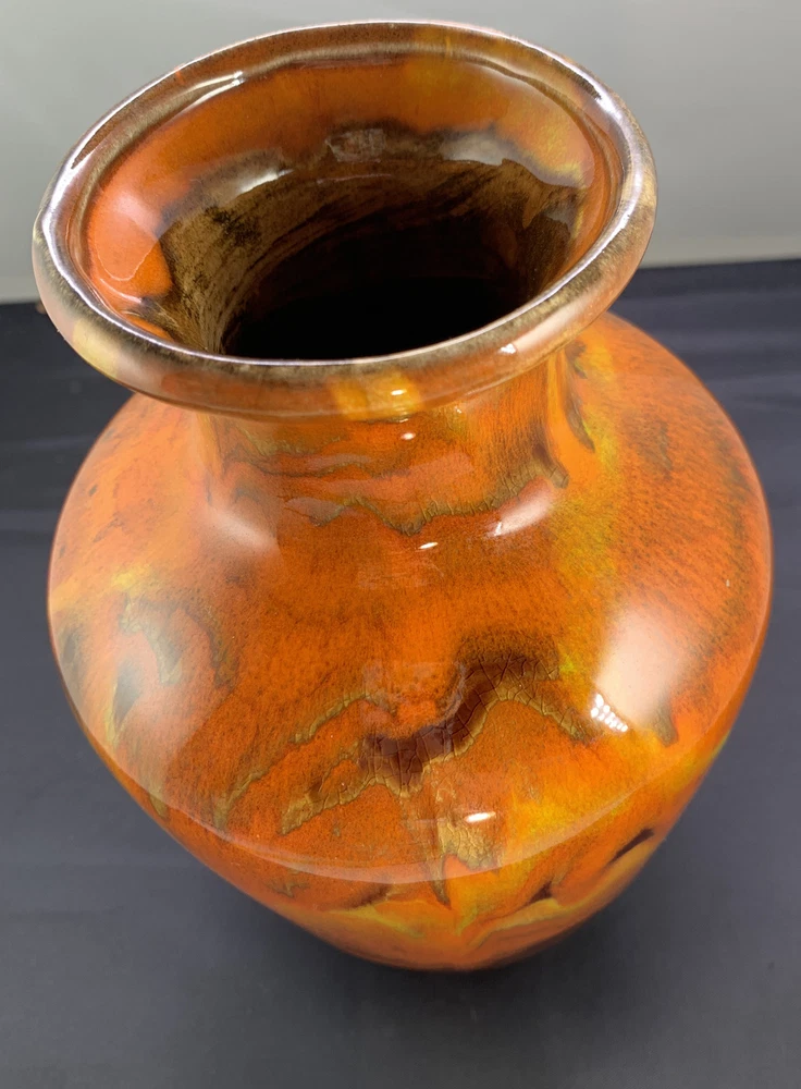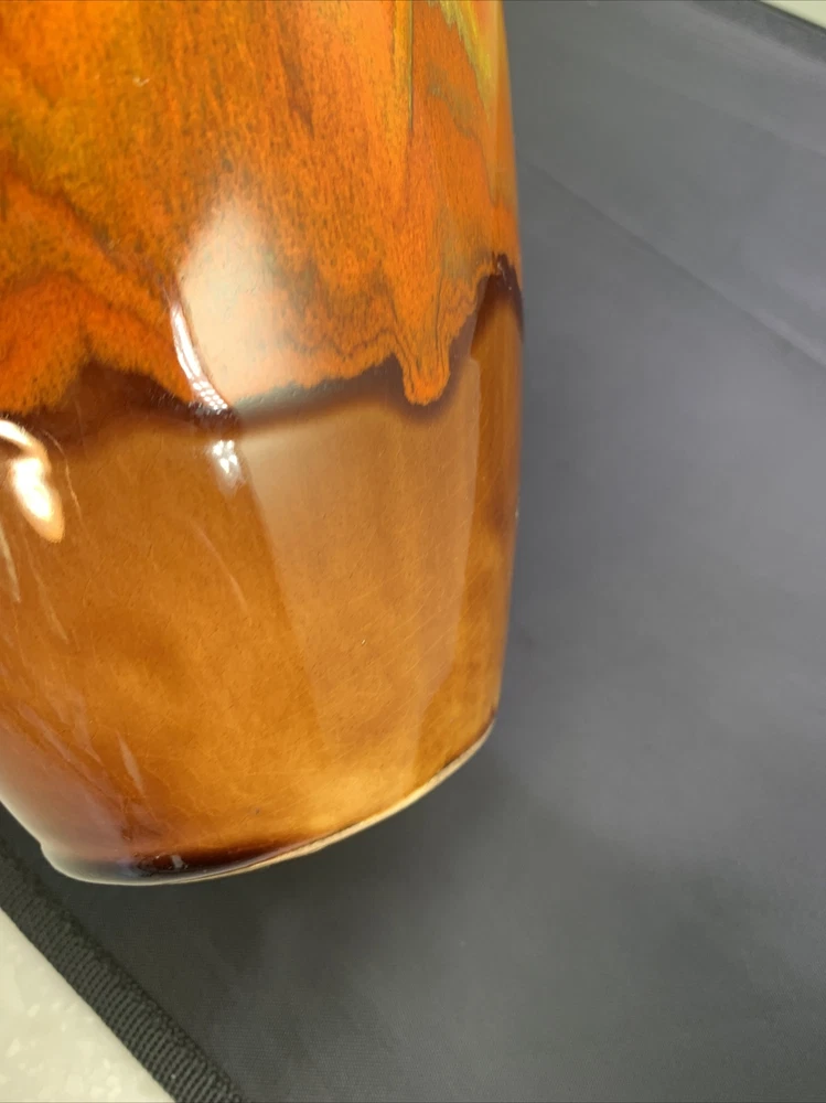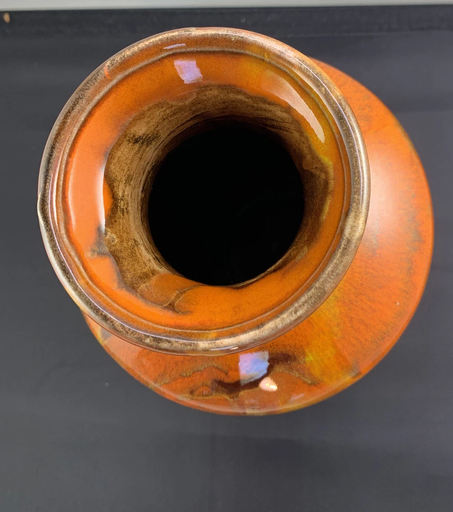 Vintage Vase Mid-Century Modern Orange, Brown Fall Color Glaze Pottery USA 467. 9” tall by 6” widest. There is crazing under the glaze and a bubble as pictured in the side...