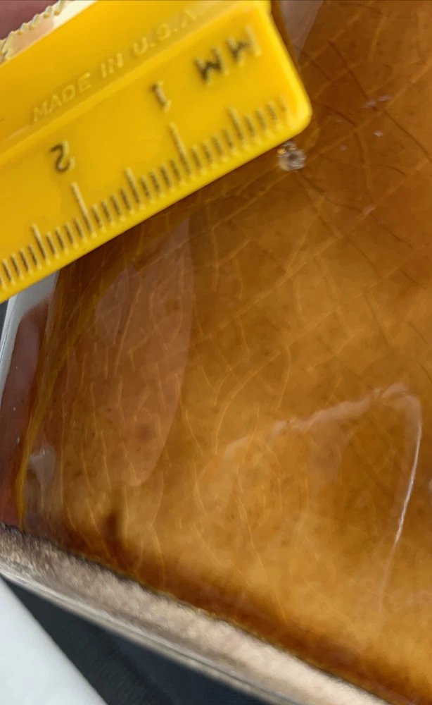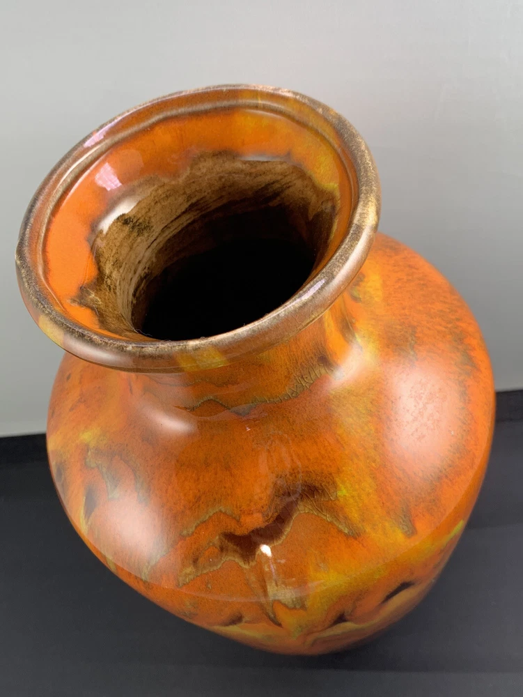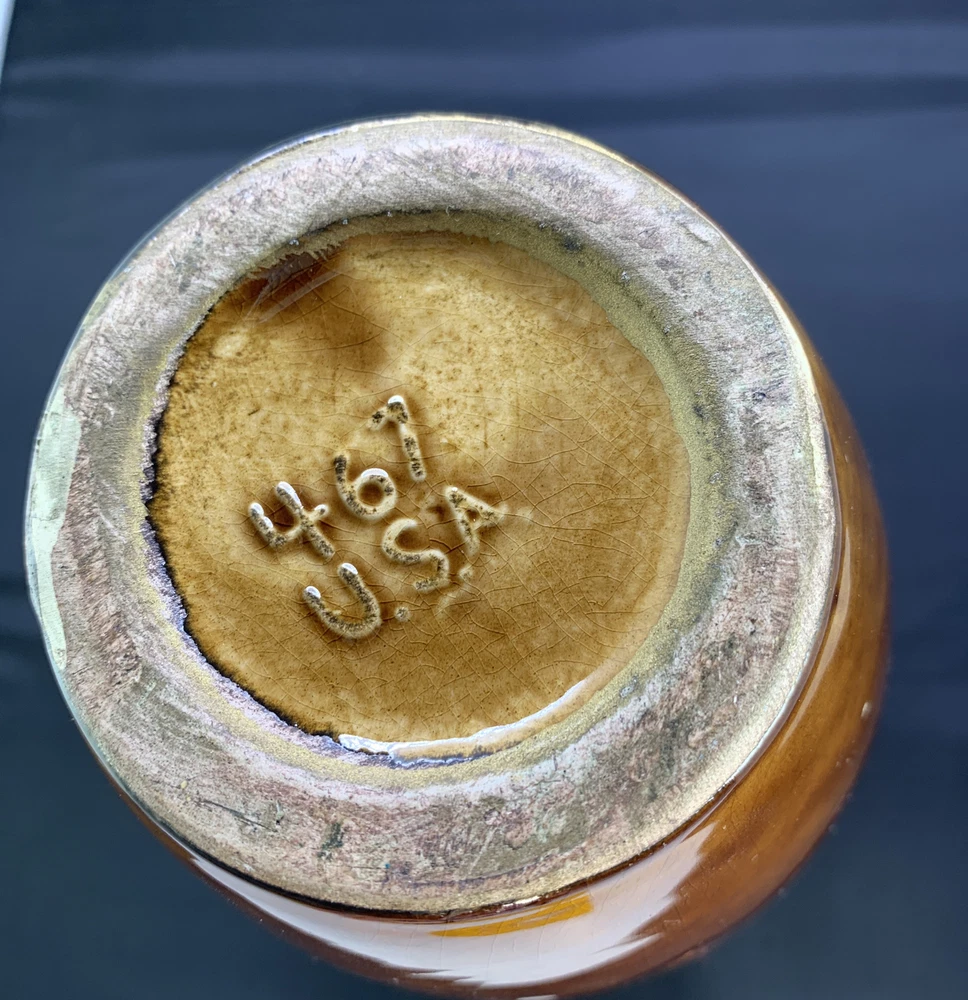 Vintage Vase Mid-Century Modern Orange, Brown Fall Color Glaze Pottery USA 467. 9” tall by 6” widest. There is crazing under the glaze and a bubble as pictured in the side
