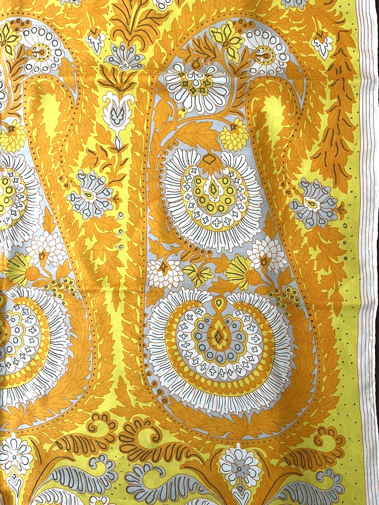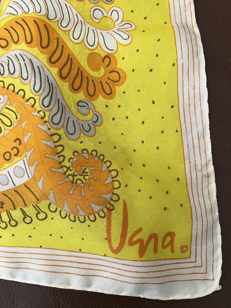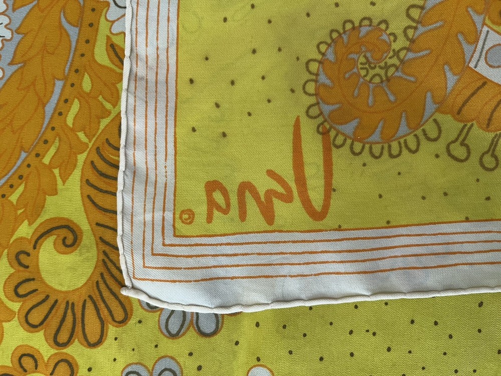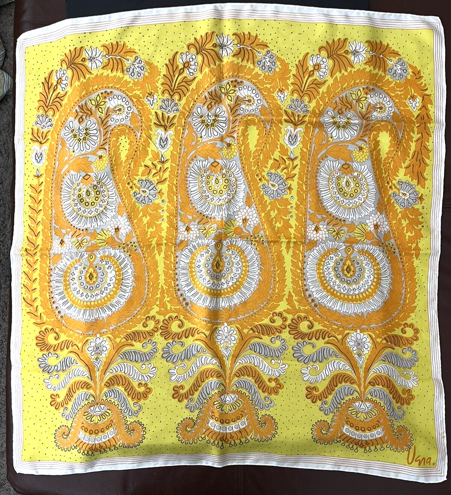 Vintage Vera Neumann Silk Scarf Mid Century Paisley Yellow Orange hand rolled edges 30 x 30 inches square condition: pre-owned - no holes or stains