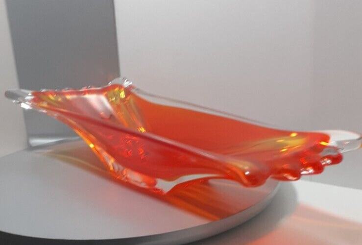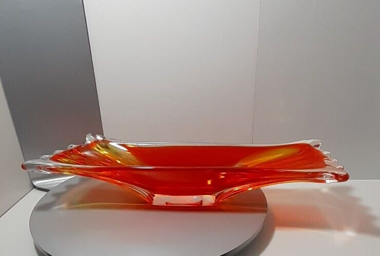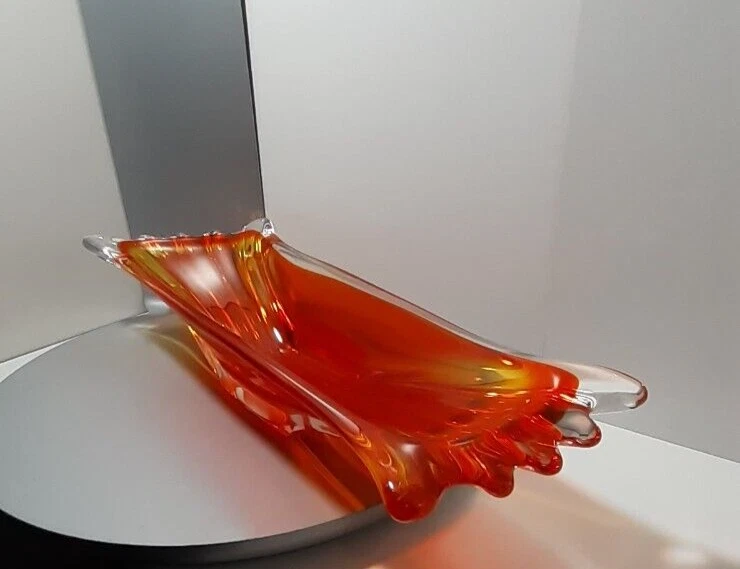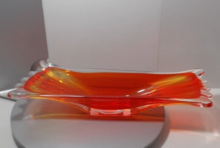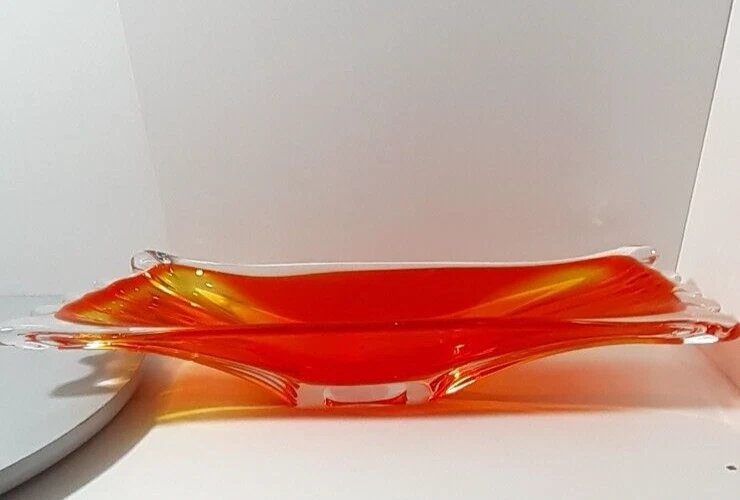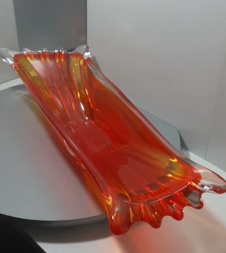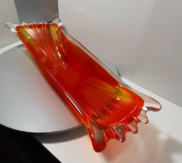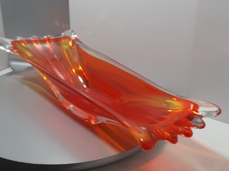 Vintage Japan Art Glass Hand Blown Orange Clear Swung Console Center Bowl A GREAT addition for your collection!!! Good Vintage Condition Please Note Before Purchase: As expected with age and been glass one dot like flea bite on top end of bowl with minor surface glass scuffs on some parts please view picture for a closer inspection Size: 40 cm Length x 11.5 to 13 cm Depth x 6.7 cm to 7.5 cm High Weight: 1.510 Kg Please excuse the glare and camera flash marks--they are not imperfections. Please note, all bright white in pictures are reflections from the camera and not chips or cracks. Unless stated otherwise Photos are as true representation as possible so please be aware that there might be slight colour variations due to the difficulty of capturing true colour and the differences between various computer monitors. Only have one available so please if you find yourself attracted to it, I highly recommend that you buy it now Purchase with confidence at vintiqueplus store Ebay Member since: 08-Sep-2004 We value our 100% positive feedback rating We disinfect all products before packing . We ensure our hands are washed and dried and/or sanitized prior to packing. “ When an item is classified as "vintage" "antique" “Retro” "old" or "pre loved", please do not expect that it will be in perfect or new condition. It has had a previous life, so it will have some signs of use/wear/dirt. Pottery and Porcelain will often have crazing. ” I HAVE BEEN COLLECTING ITEMS MYSELF FOR OVER 30 YEARS AND UNDERSTAND THE NEED FOR A GOOD AND INFORMED DESCRIPTION. While every effort is made to describe items accurately we are not infallible The items we sell are mostly vintage and antique and therefore will generally have some imperfections. All purchases are wrapped and packed well so they arrive to you safely. I do not charge for packaging and try to reuse and recycle as many boxes and packing materials as possible.