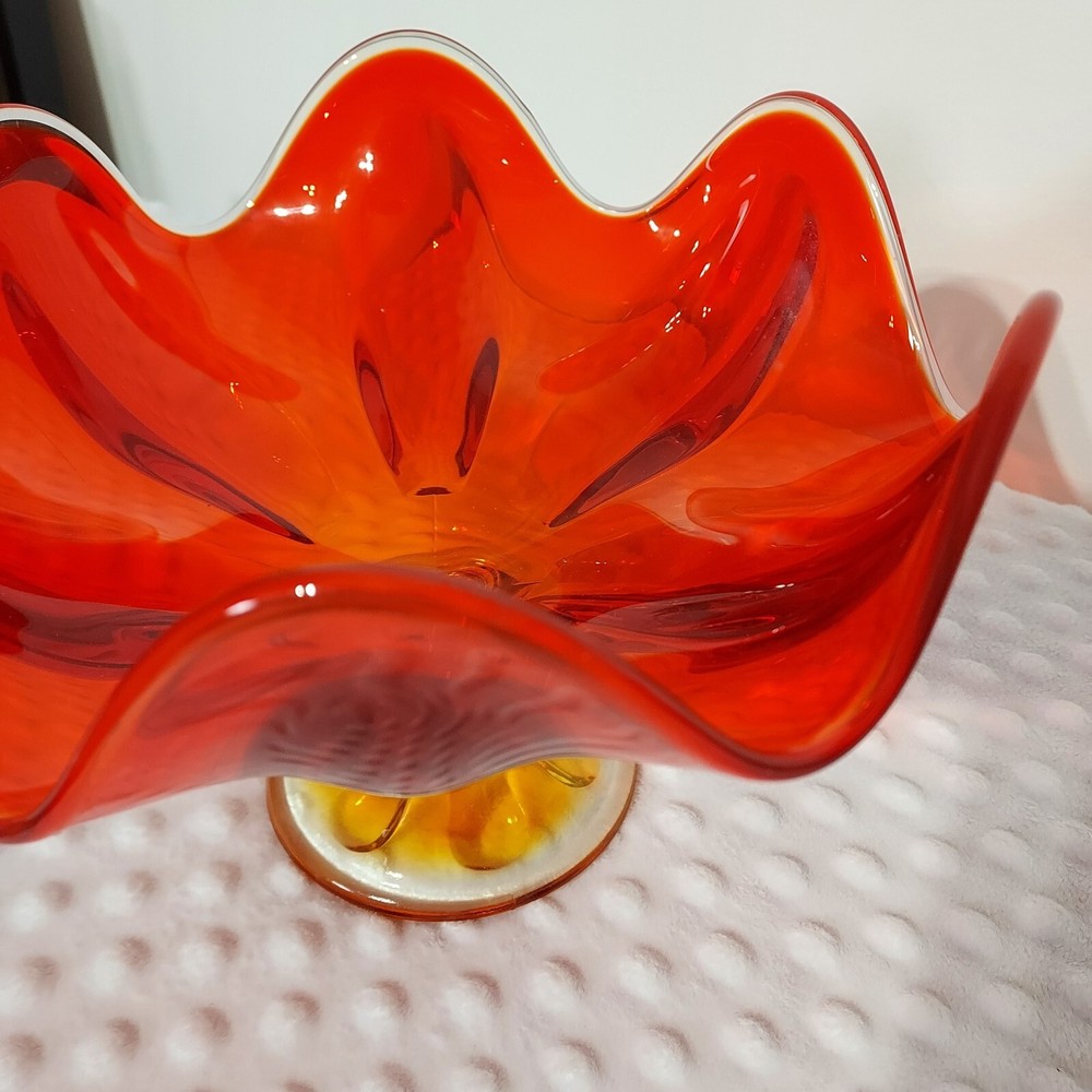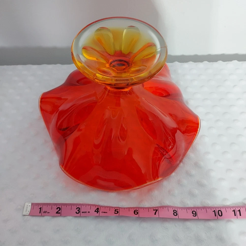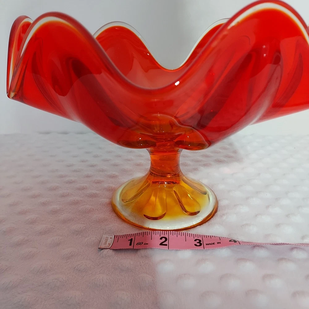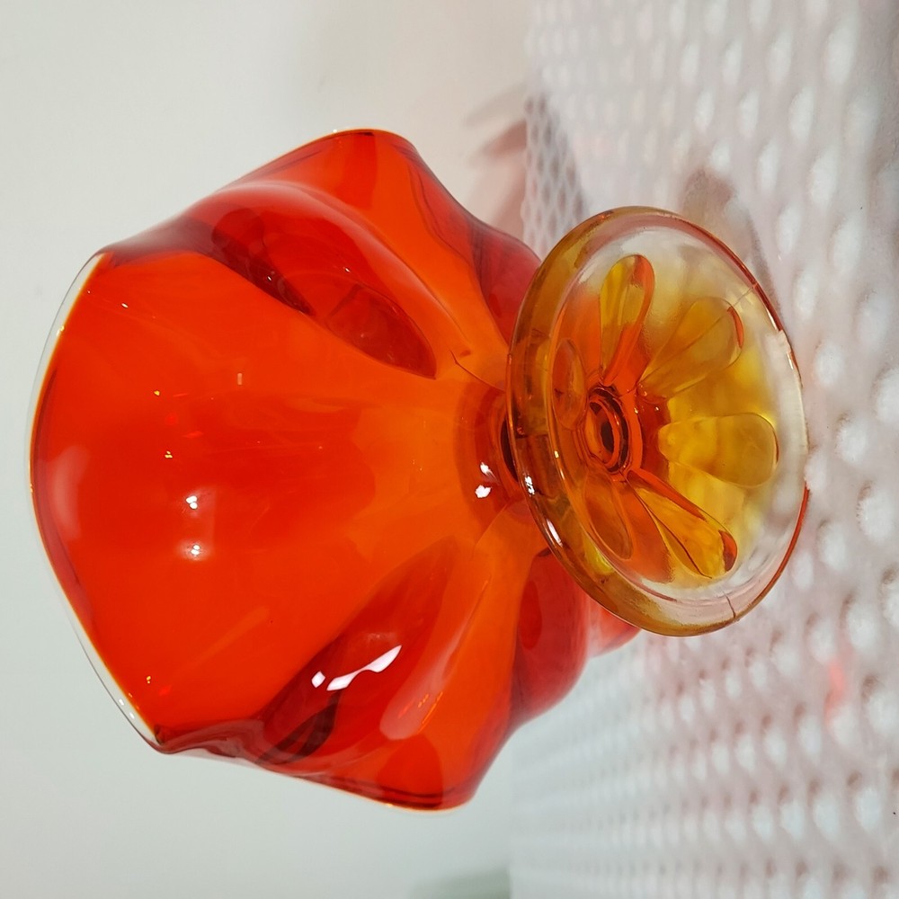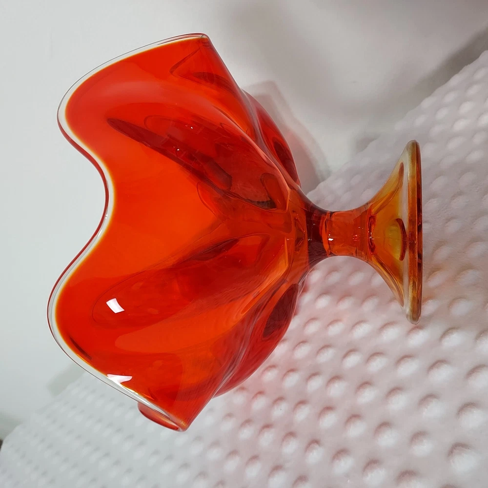 This stunning piece is an absolute showstopper! The orange amberina color shifts beautifully in the light, and the pedestal base gives it such elegant mid-century flair. It's perfect for displaying fruit or just as a gorgeous standalone decor piece. Incredible quality and true vintage charm.