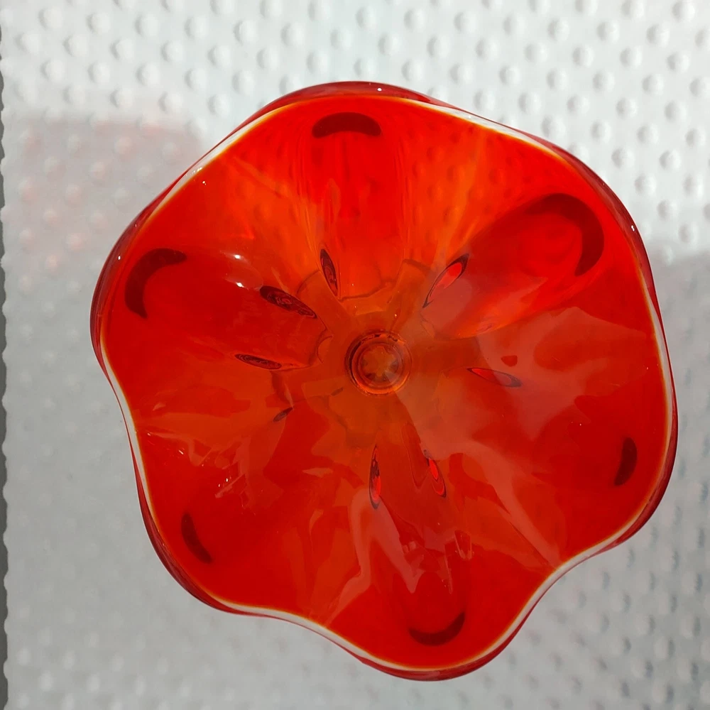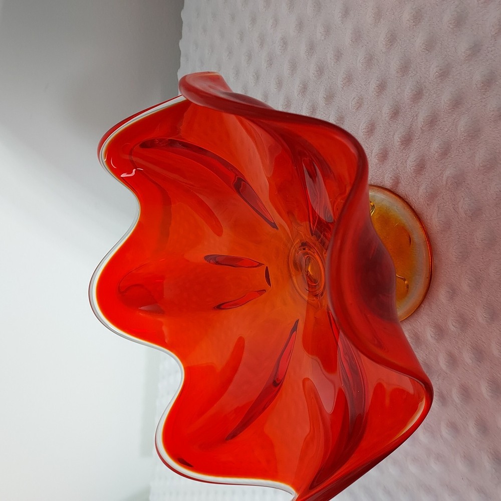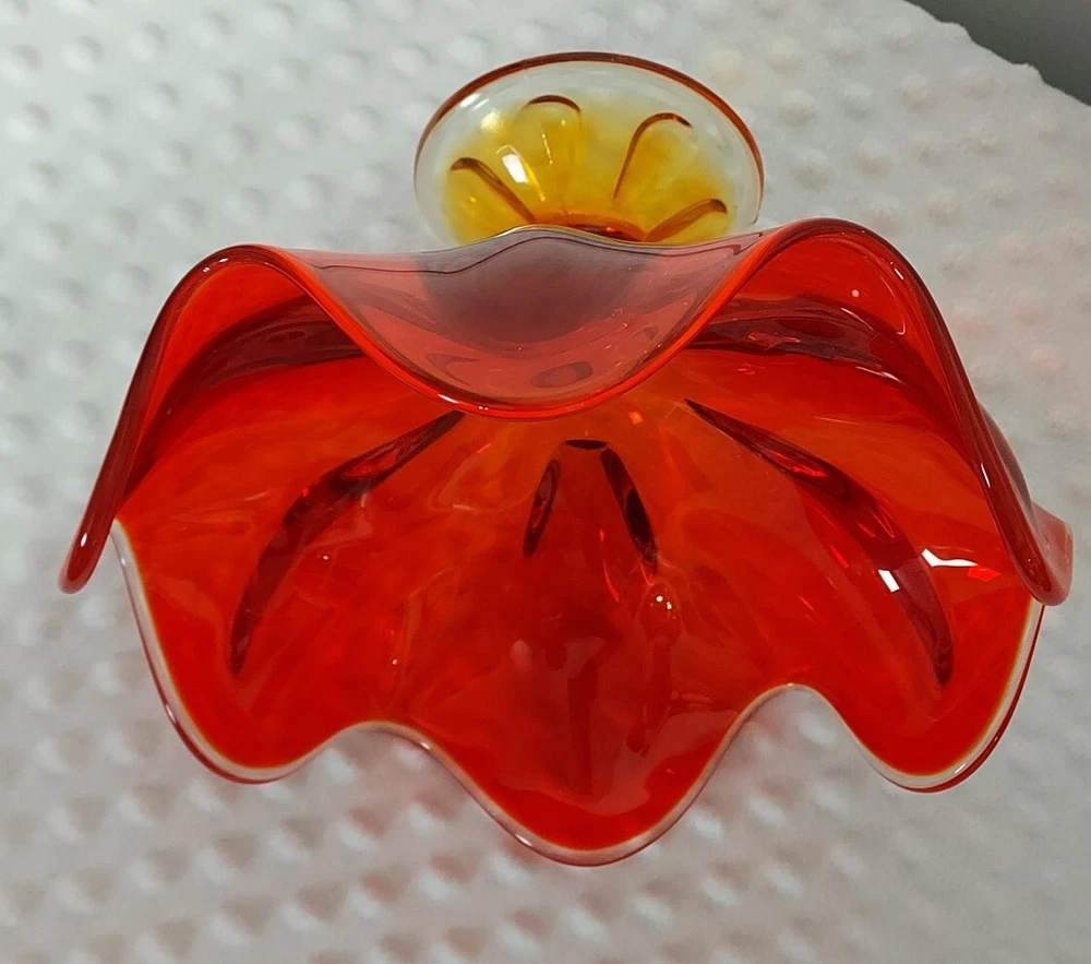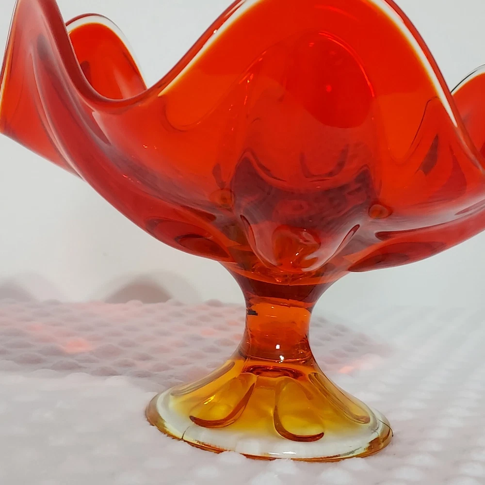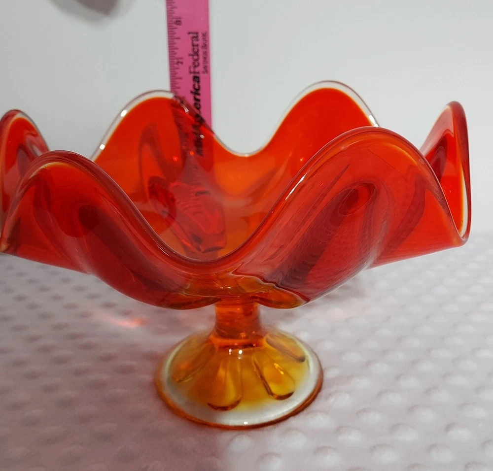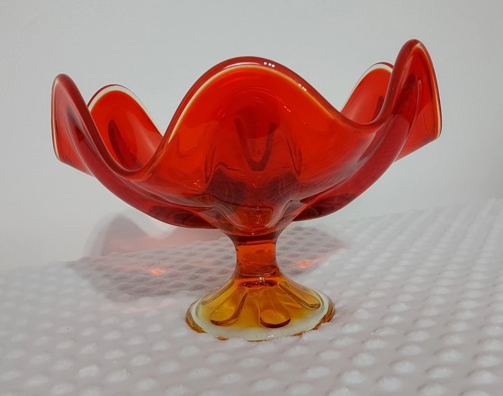 This stunning piece is an absolute showstopper! The orange amberina color shifts beautifully in the light, and the pedestal base gives it such elegant mid-century flair. It's perfect for displaying fruit or just as a gorgeous standalone decor piece. Incredible quality and true vintage charm.
