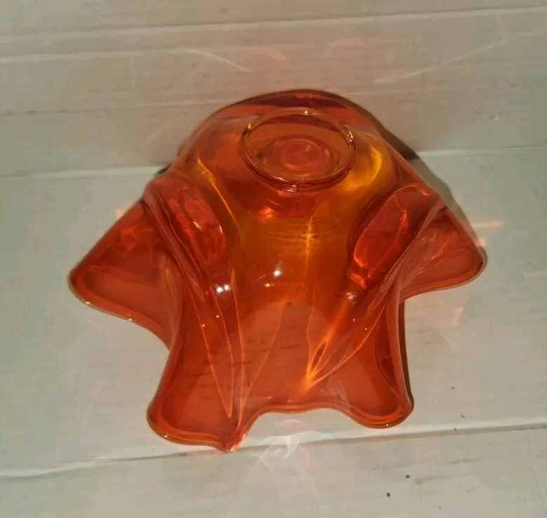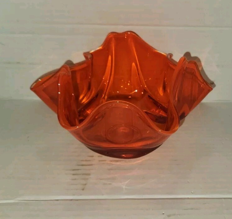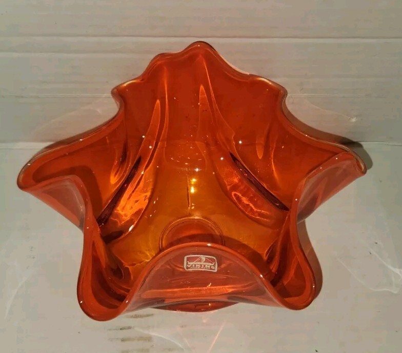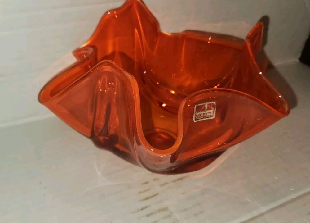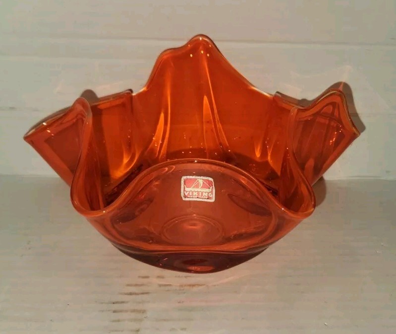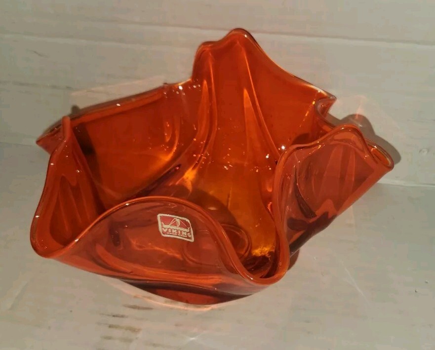 Vintage Viking glass bowl. Orange red color. Drape art glass style. Measures approx 8 inches at the widest section. Still has the sticker on the side. Don't Forget to Follow on Instagram Nevermore_Sales See photos as they are an important part of the description and will help you know what you are buying. We do our best to describe all items but Sometimes we miss things so the photos are important. . Please Please ask questions. Thanks for bidding and good luck. Check out all my items for some great finds. Lots of cool stuff at my auctions. can combine shipping on most. All clothing items are washed according to policy.