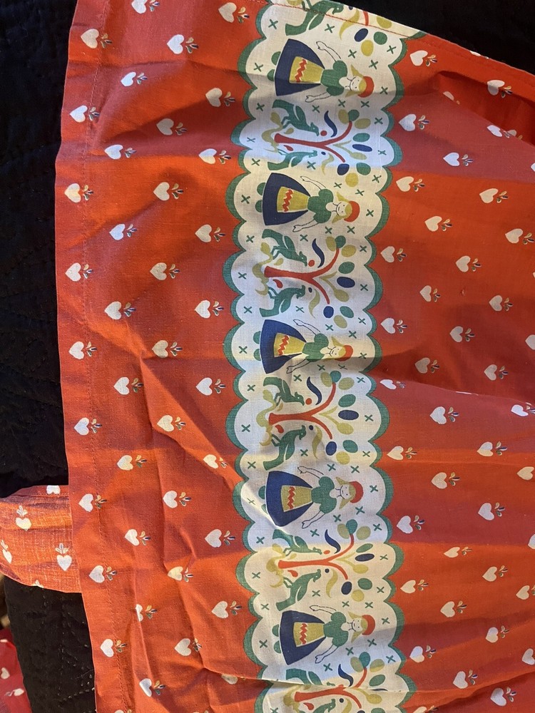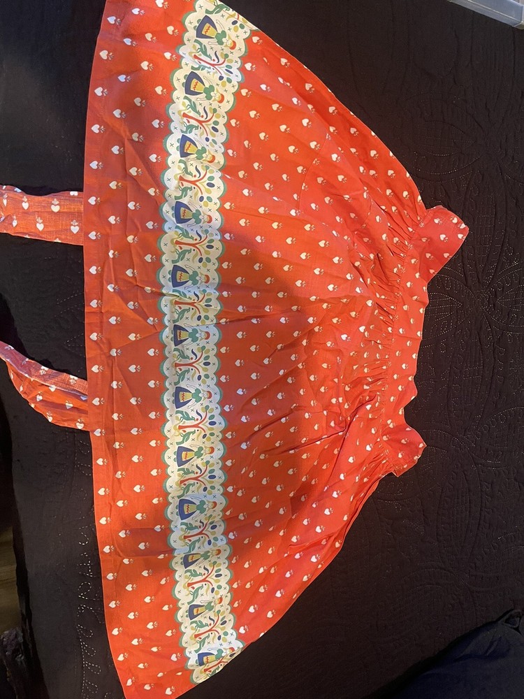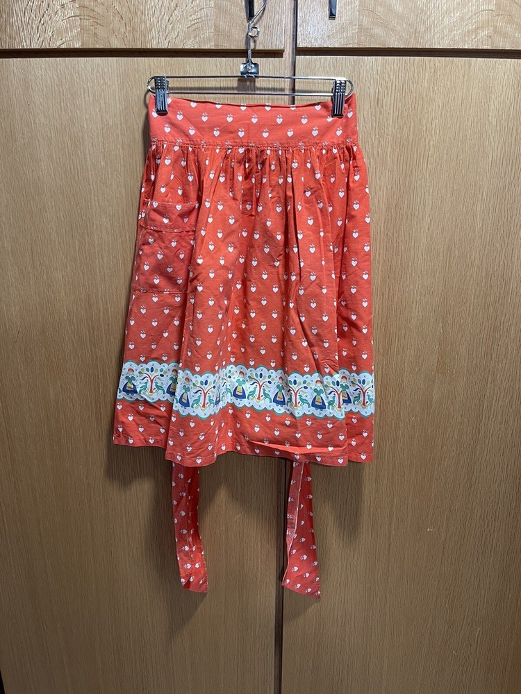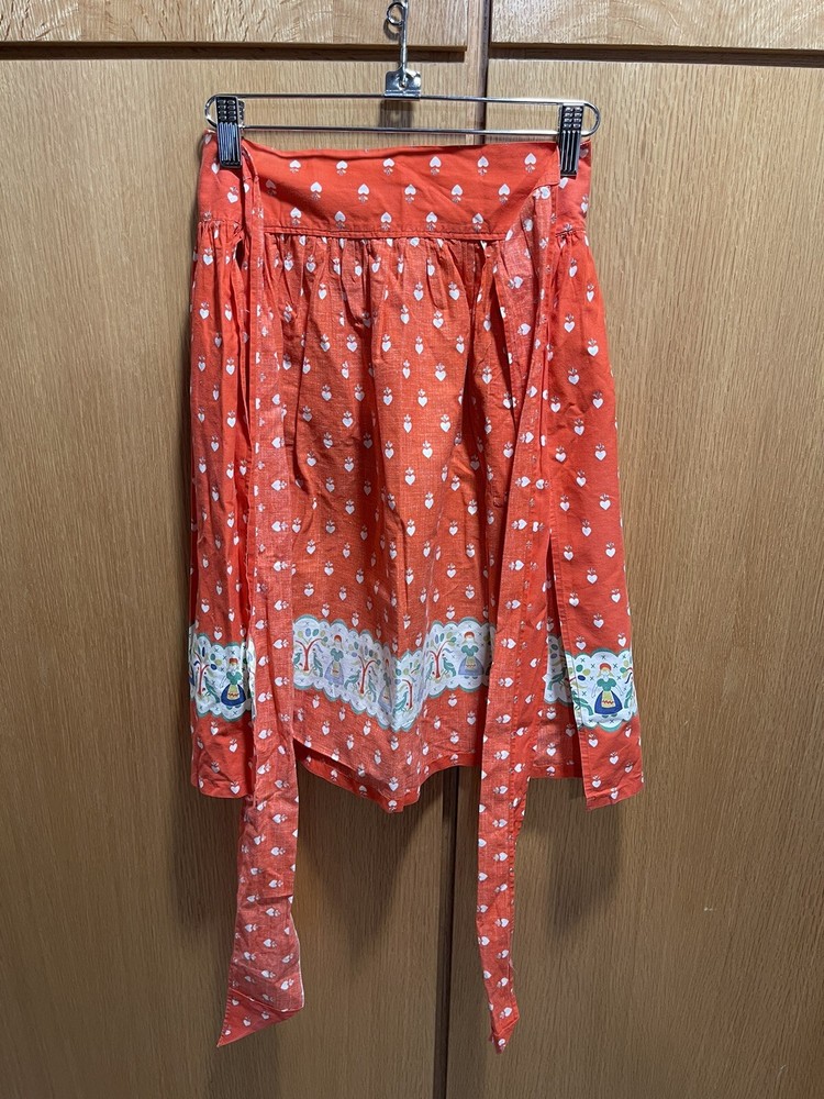 This vintage waist apron is a vibrant addition to any kitchen. The floral pattern on the orange cotton material adds a touch of 1950s charm. With a width of 16-20 inches and a length of less than 40 inches, it is perfect for any woman looking for an original, licensed reproduction apron. The apron features pockets for convenience and is washable for easy maintenance. It is a great collectible item for anyone interested in linens and textiles.