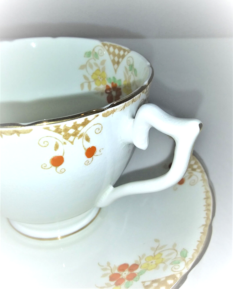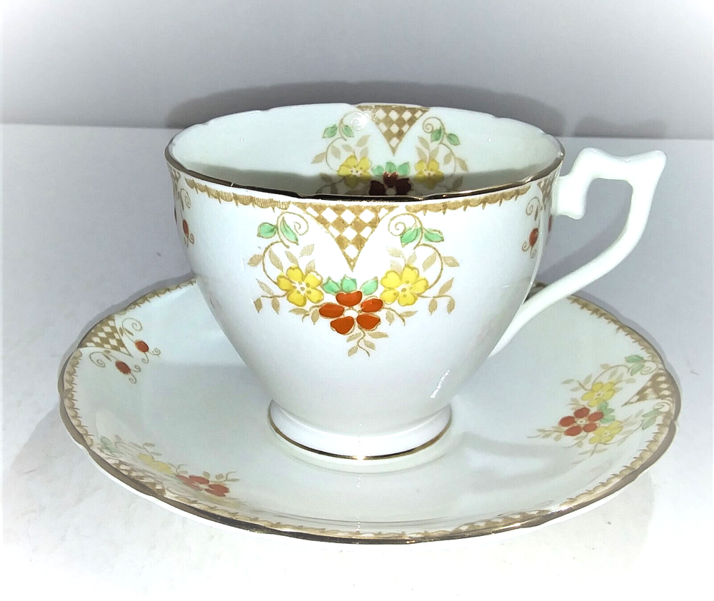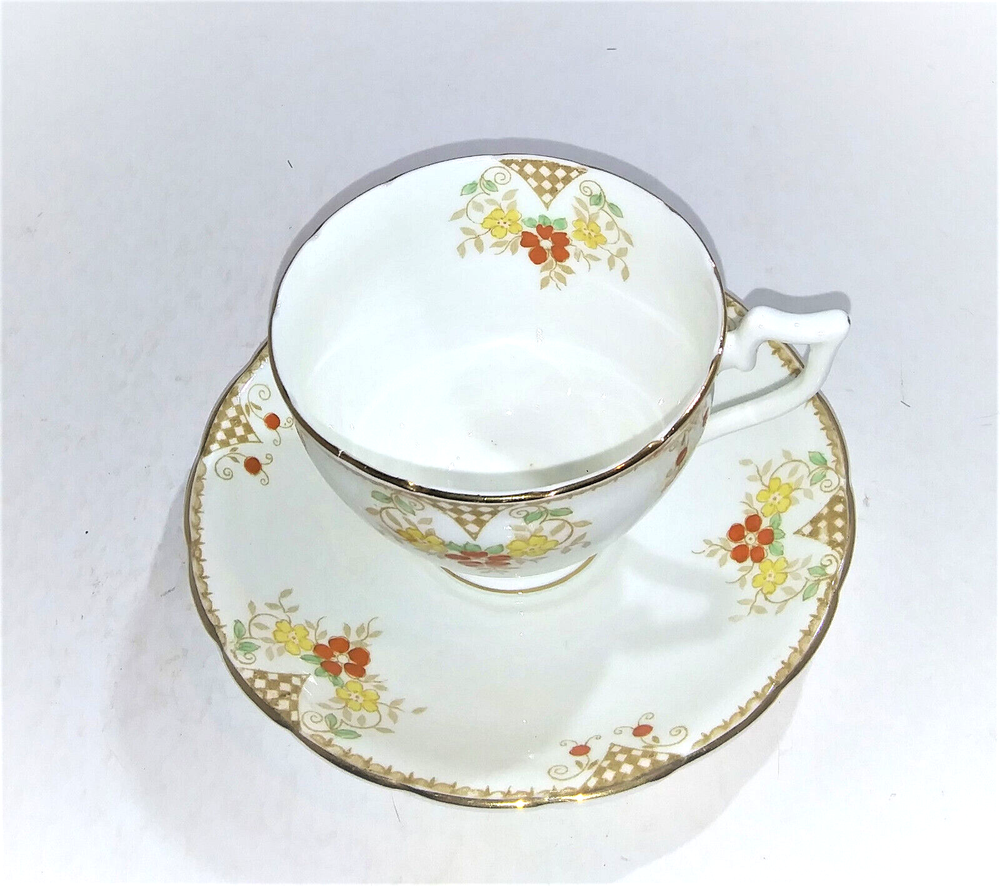 This is a very pretty Wellington teacup and saucer set with what appears to be a hand painted pattern of abstract flowers. Colors are yellow & orange. This is a very pretty Mid Century Modern set. The cup stands 2 1/2" tall by 3 1/2" wide. The saucer is 5 1/2" across. The gold trim is complete with no wear at all. Teacups make great gifts. Please go to my store to see additional items that I have. Include me as a favorite seller and get regular weekly updates when I have new items listed. All items we list are either vintage or antique and with that in mind may and probably will show signs of age and wear. We do our best to photograph every part of the item & accurately describe every item we are selling; please view all pictures carefully and read full description. We encourage you to use eBay's zoom feature for details. We welcome any additional questions, please do not hesitate to contact us. Feedback is an extremely important part of eBay. If you are happy with your purchase, please take a moment and leave feedback. Please contact me first if item did not arrive safely or if there is a problem.Please feel free to ask questions. Your satisfaction is my main concern. I will be happy to combine shipping. Check out my other listings. All items are sold AS IS and buyers remorse is not a valid reason for a return. Returns will be accepted only if item was not as described. We charge what we feel the post office will charge us for shipping. The amount we pay to the post office does not include insurance. Shipping of glassware can present problems since glass is fragile. I pack very carefully but advise that insurance be considered, especially for more costly items. We usually ship via U.S. Mail. In order to save money on shipping we usually use Parcel Post to minimize shipping costs. The post office has been taking 12-14 days to deliver some Ebay items that we have shipped. If you need quicker delivery on larger packages, their rates increase dramatically. If you prefer to pay Priority Mail, we will be glad to accomodate you and include insurance on glassware over $50.00 at no charge to you.