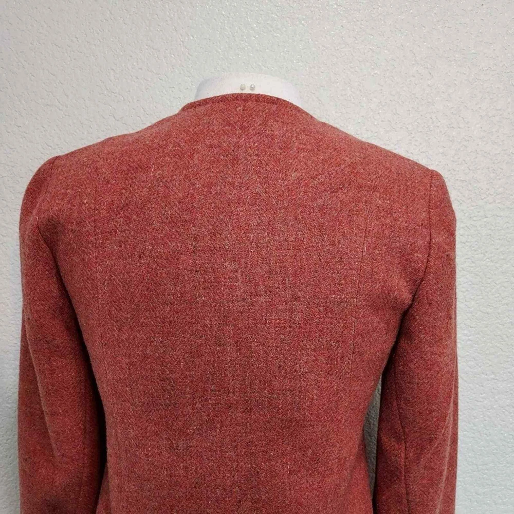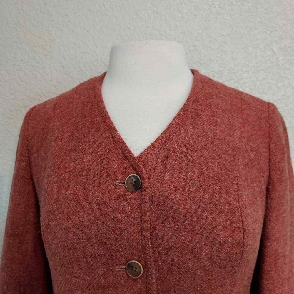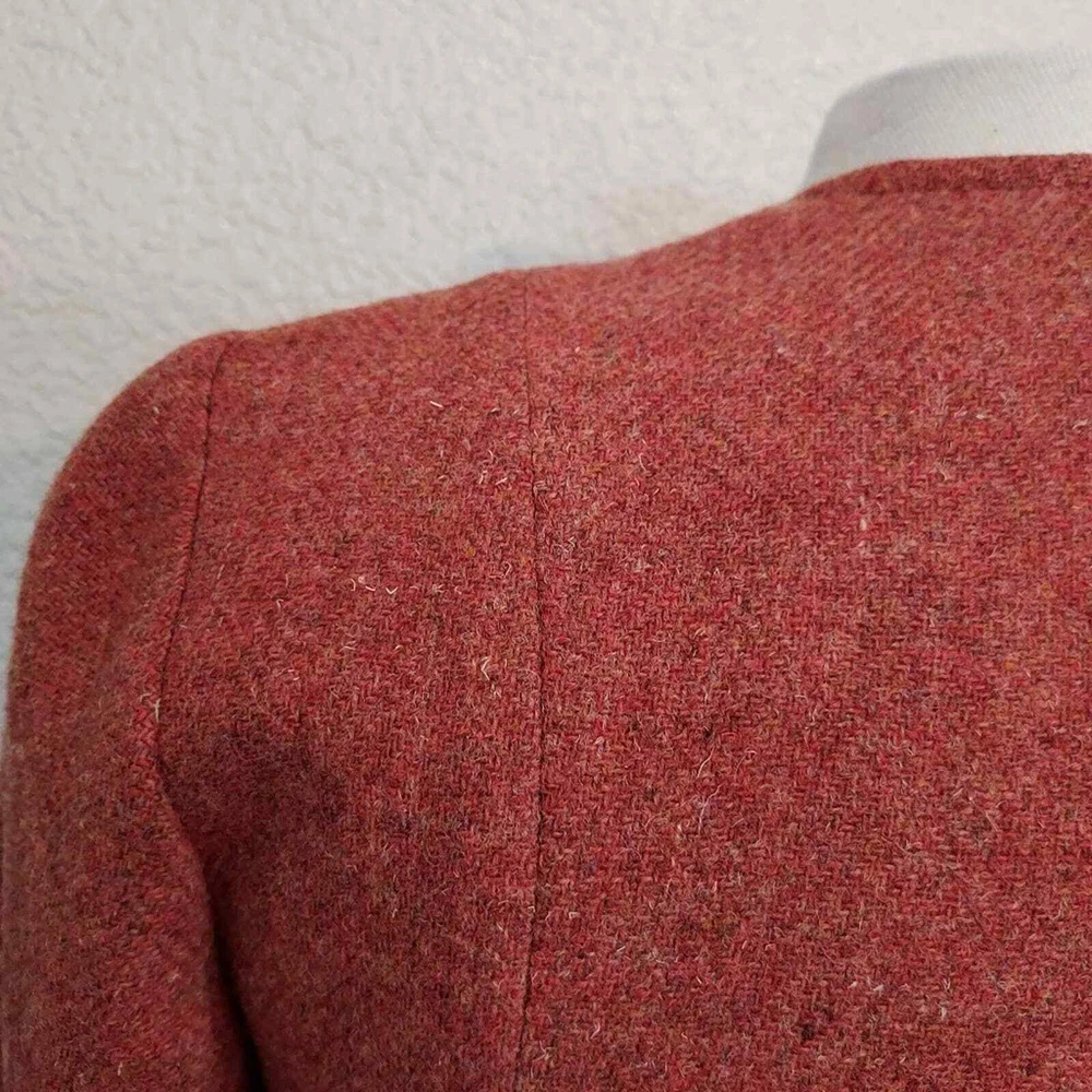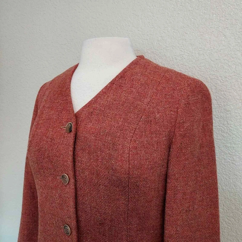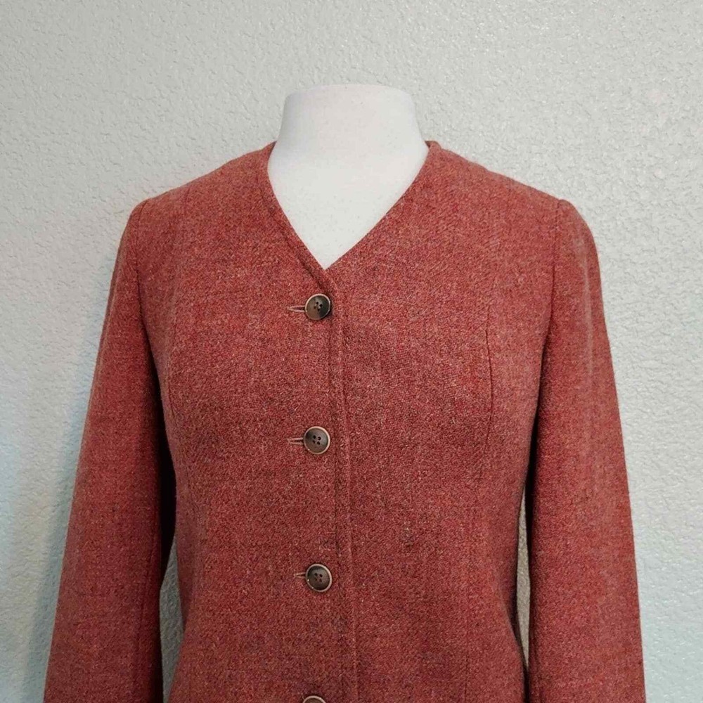 <![CDATA[<div>Excellent vintage condition 100% Virgin Wool Actual color is more fire orange than red Tweed fabric 5 Button closure Fully lined Collarless - short v-neck Size 9-10 Measurements are Approximate: 26.5" Long, 17.5" Wide armpit to armpit