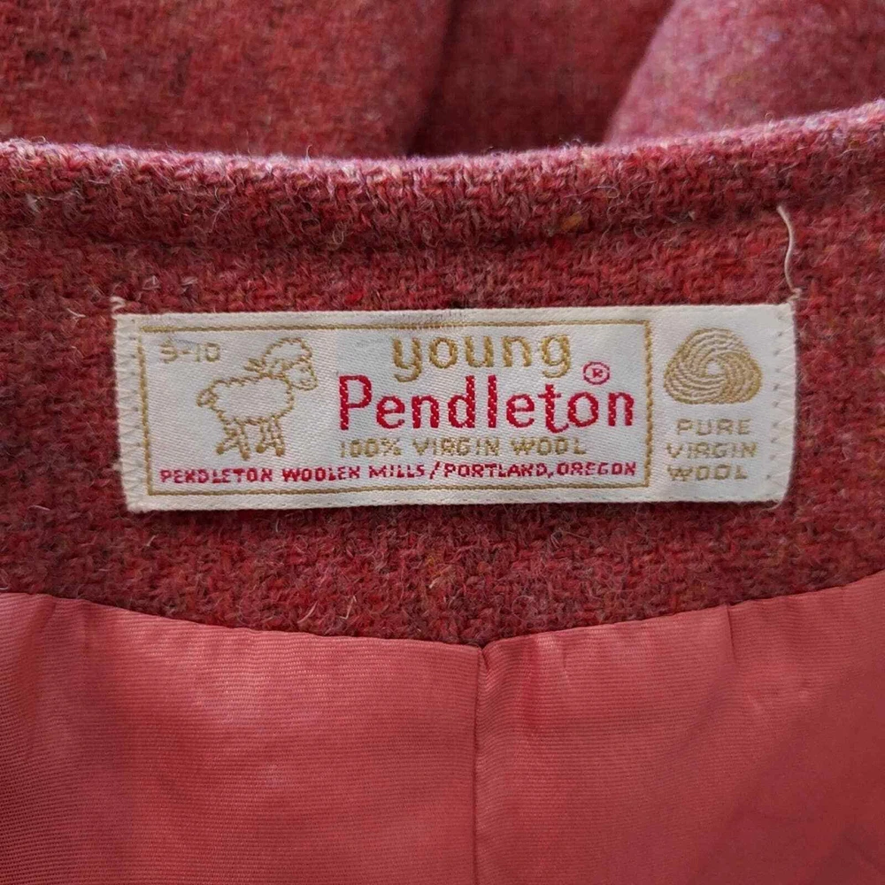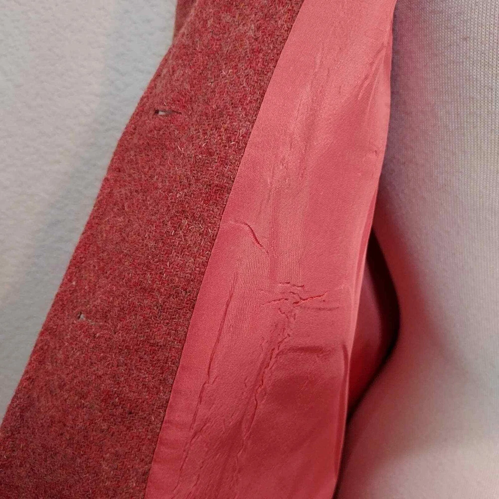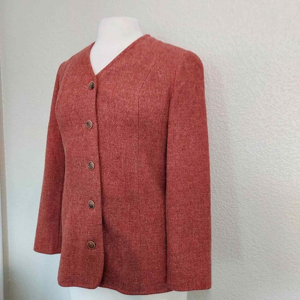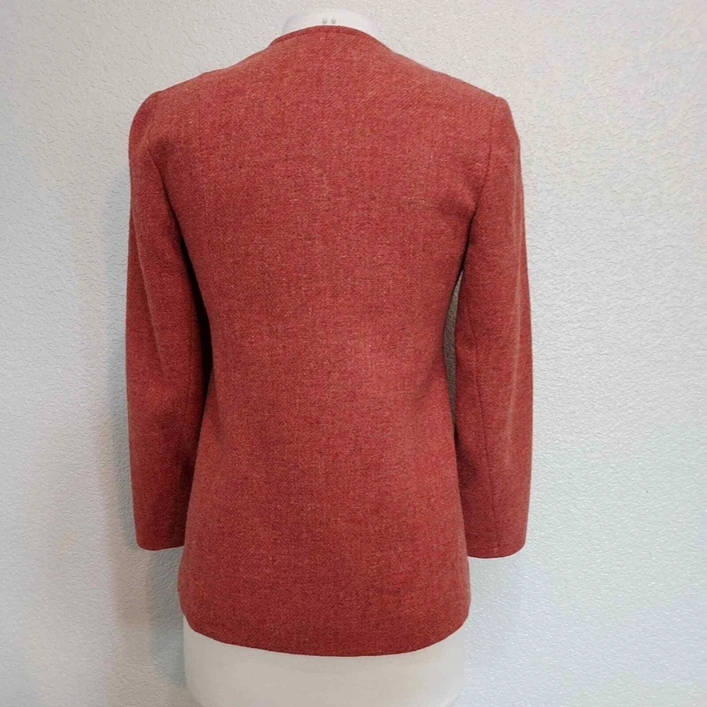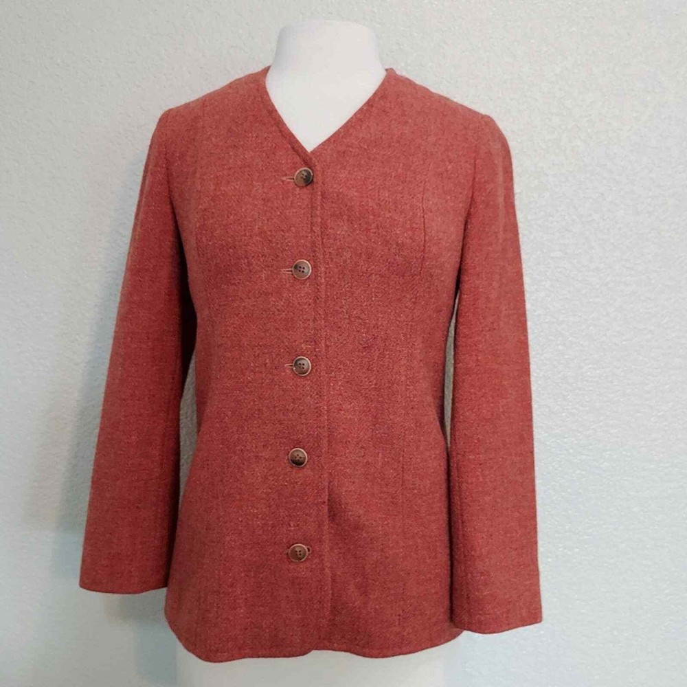 <![CDATA[<div>Excellent vintage condition 100% Virgin Wool Actual color is more fire orange than red Tweed fabric 5 Button closure Fully lined Collarless - short v-neck Size 9-10 Measurements are Approximate: 26.5" Long, 17.5" Wide armpit to armpit