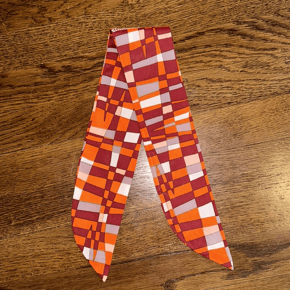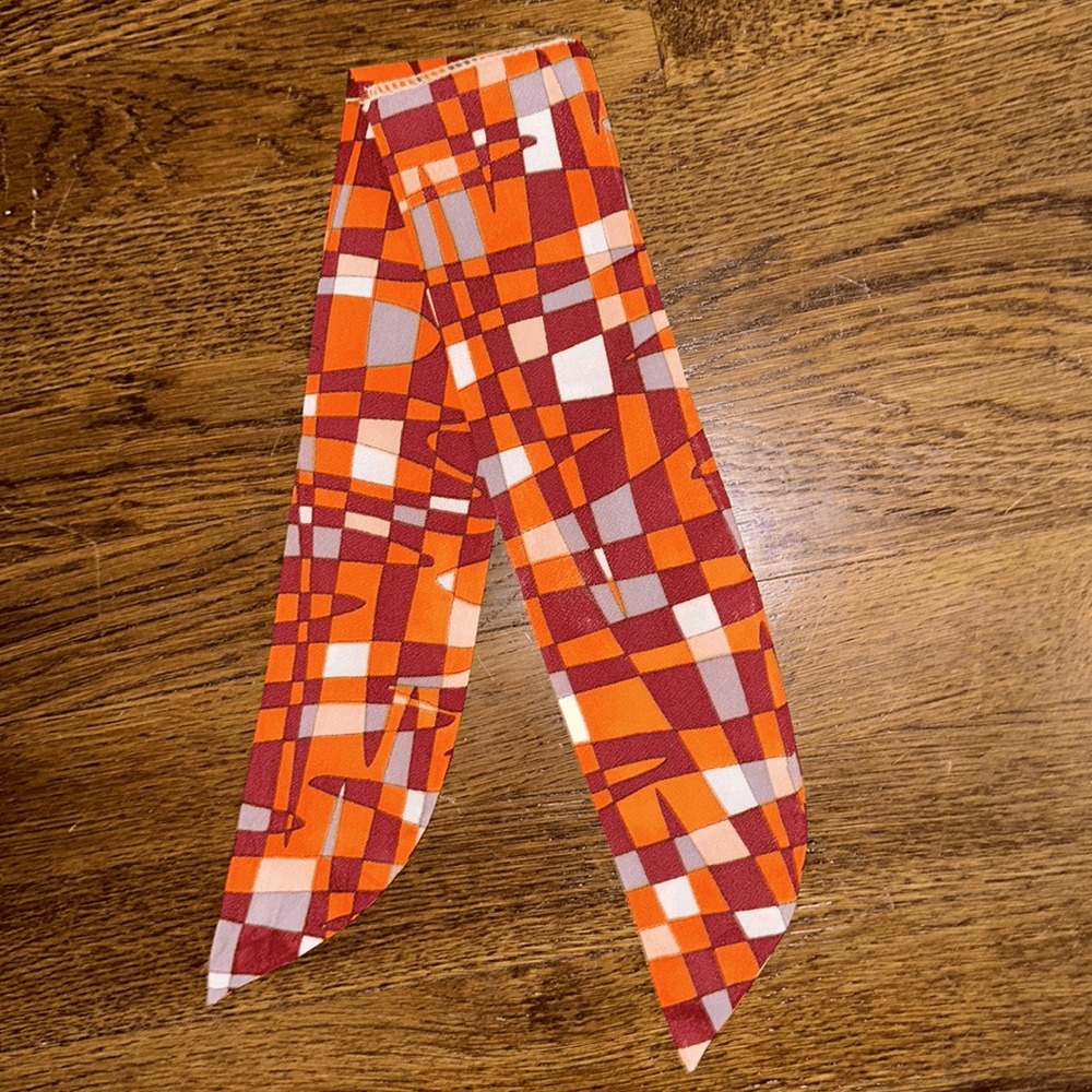 Vintage mid century funky orange, maroon, white & gray short polyester scarf Excellent vintage condition No tags 28” long 3” wide