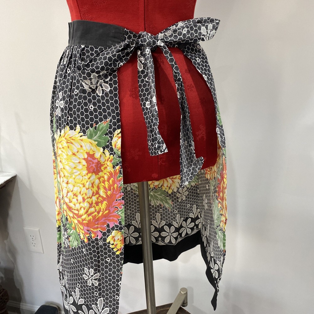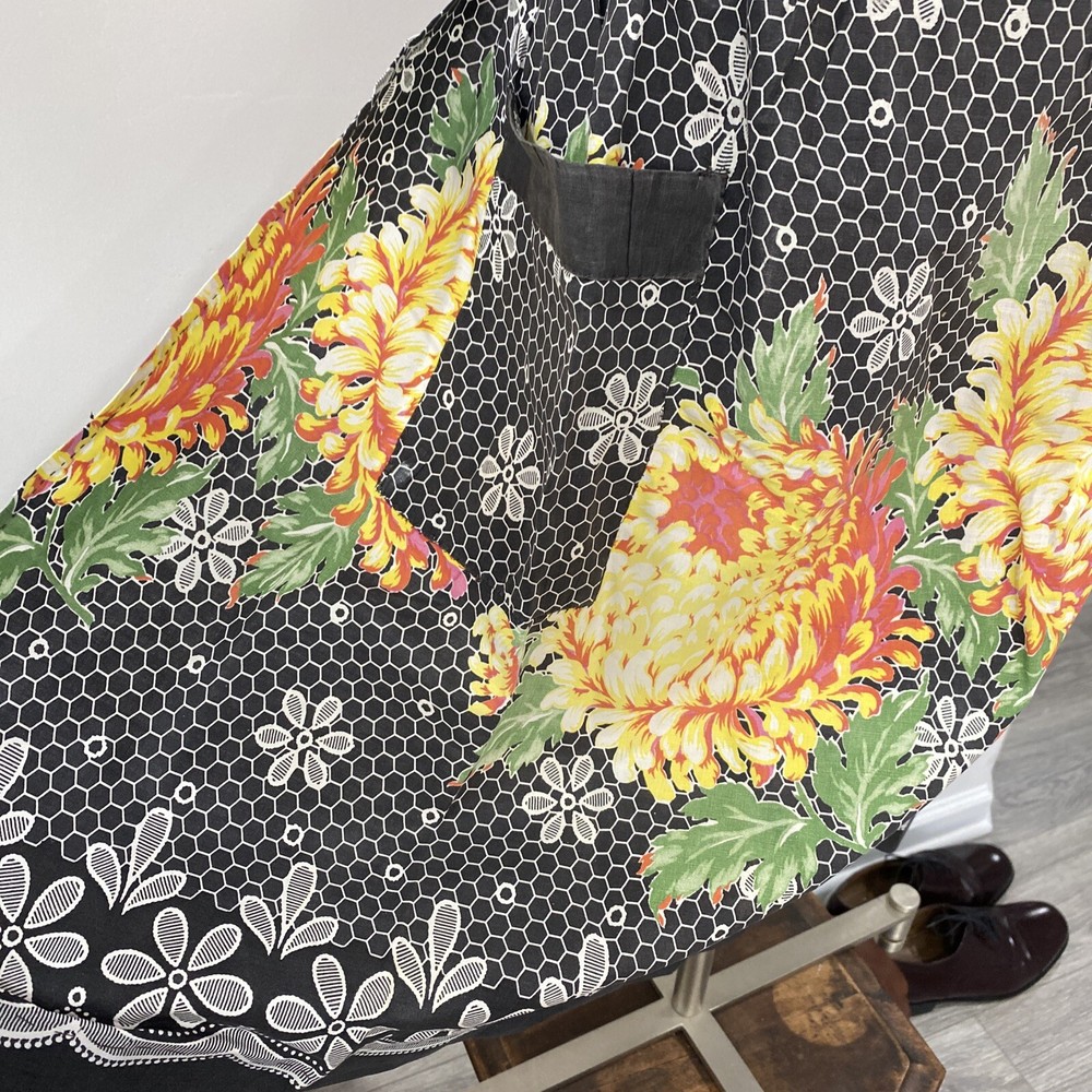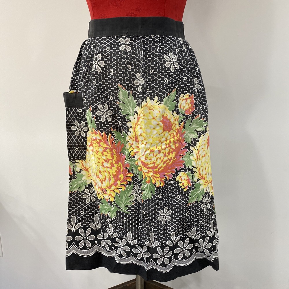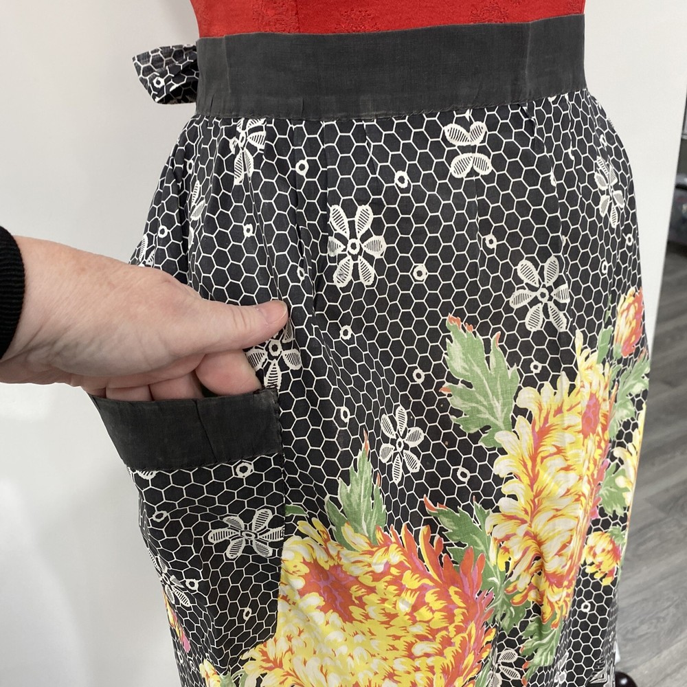 Vintage printed cotton half apron - this is a fantastic retro mid century design and appears to be handmade. Black & white print with a bold splash of color from the yellow/orange/green floral band running across the print. One front patch pocket. One size will fit most. Slightly faded - well cared for - no damage or flaws. Size: The waistband/tie is approximately 72" end to end / apron is 25" long. Check out our selection of vintage and chic thrift treasures - bundle your purchases and save on combined shipping! Questions, please ask. Thank you for looking! Purchasing from us? Wonderful! We take great care in preparing your selection for shipment. We ship USPS First Class or Priority Mail only - tracking and insurance is provided. Please check out our other items and b e sure to add our store to your favorites list !