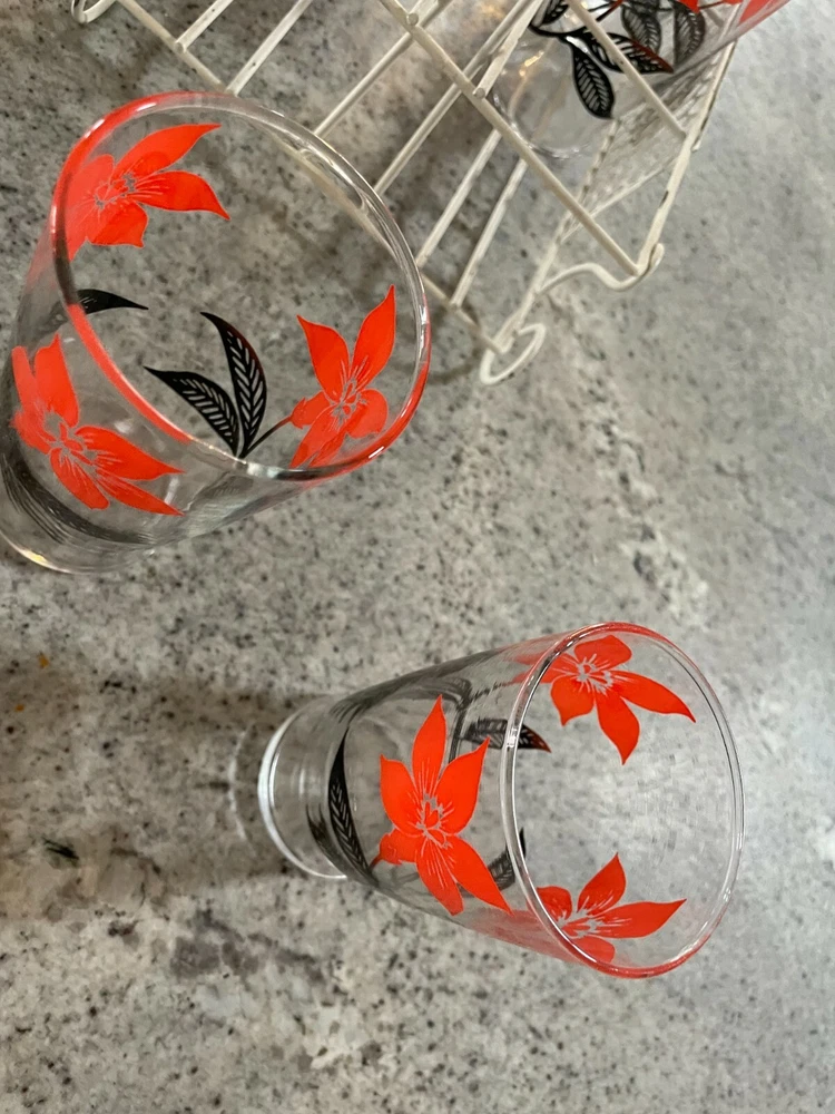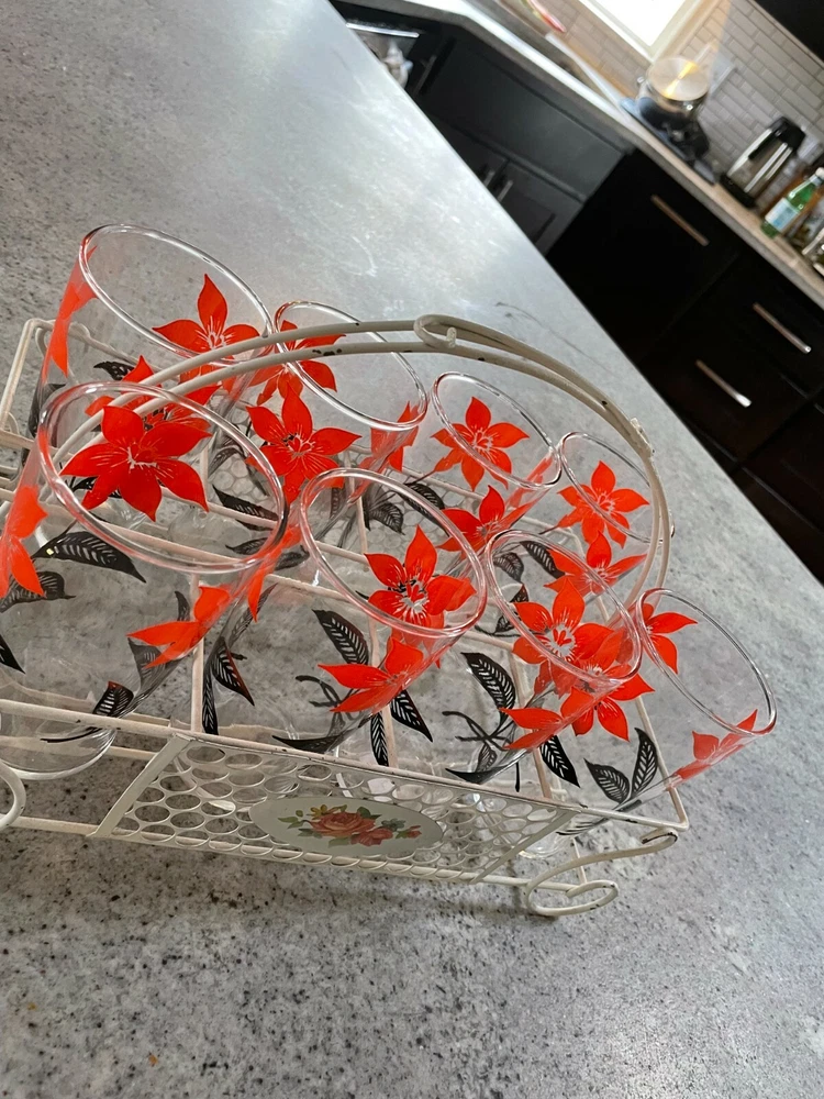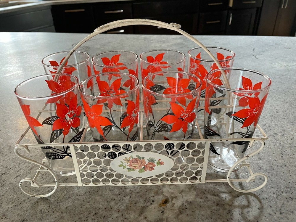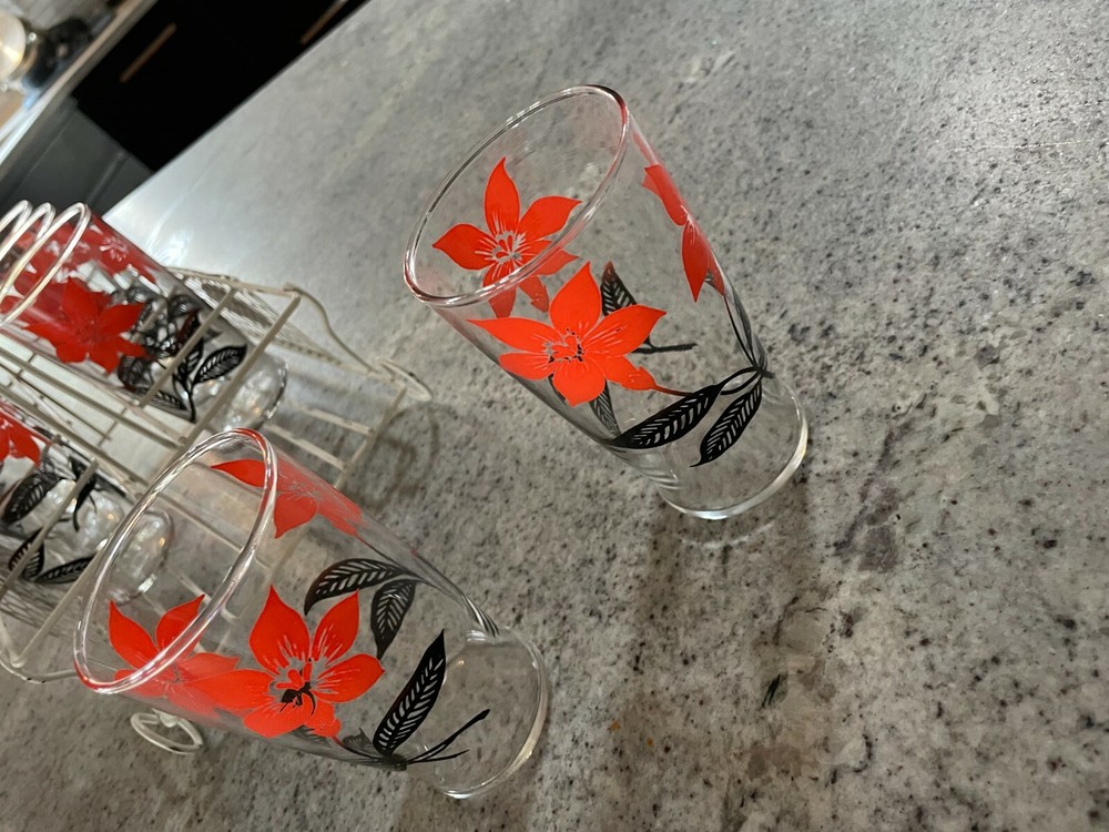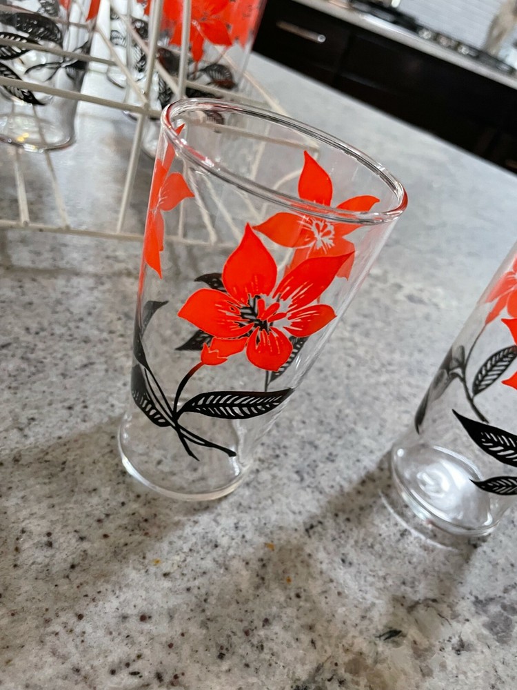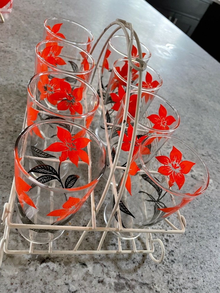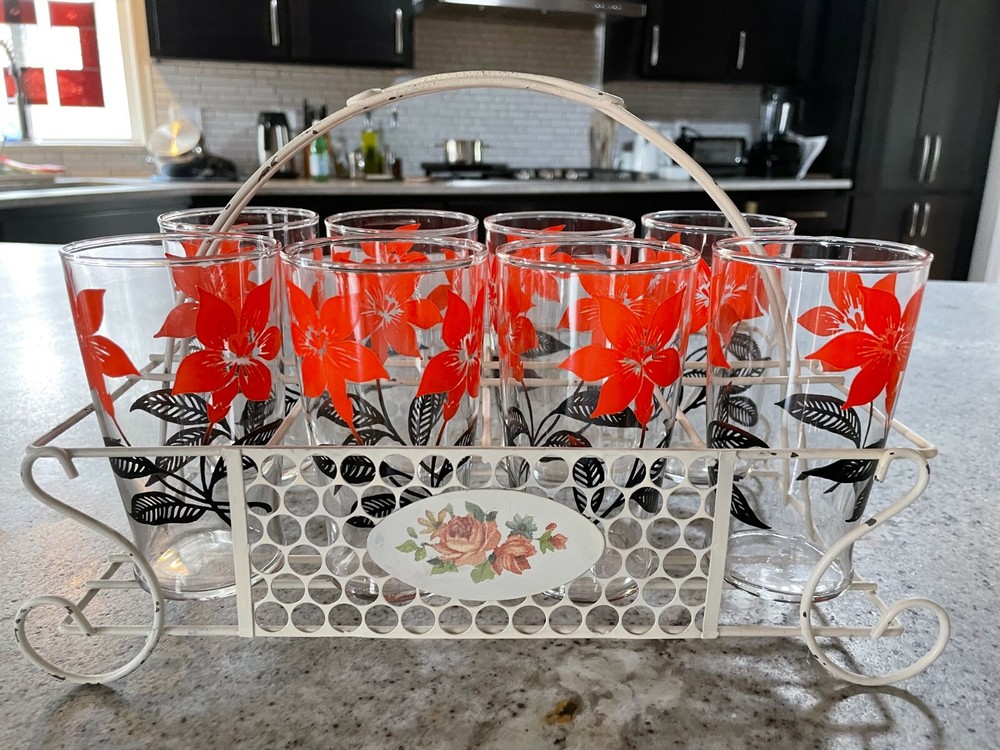 Set of 8 midcentury modern drinking glasses - Capacity 8oz delightfully decorated with an orange flower /black stem and leaves. Caddy is white with floral picture Good condition...