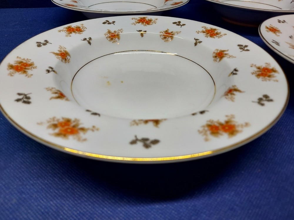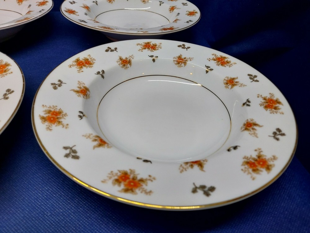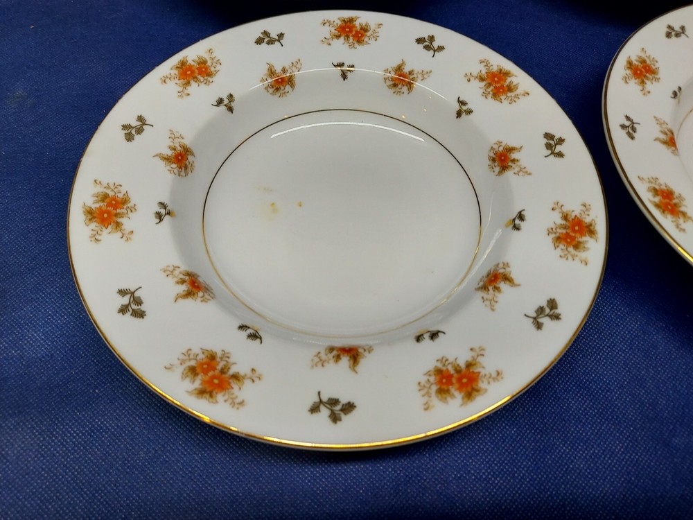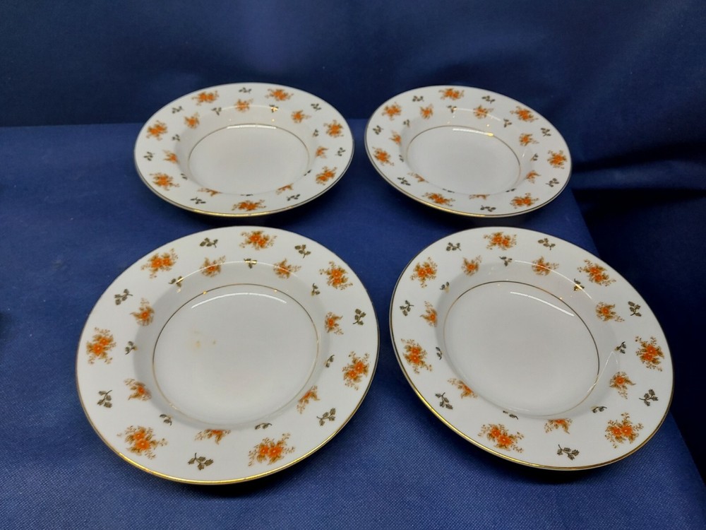 Vintzge Mid-century Noritake Dulcey Set/4 Wide Rimmed Soup/Salad Bowls. White with orange flower sprays. Bowls measure 8 1/4" in diameter and are 1 3/8" high. Pre-owned in excellent condition without any chips or cracks. Shipped with USPS Priority Mail.