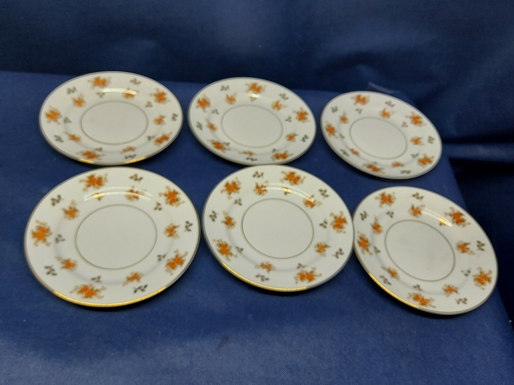 Vintzge Mid-century Noritake Dulcey Set/6 Bread/Salad Plates. White with orange flower sprays. Plates measure 6 3/8" in diameter and are pre-owned in excellent condition without any chips or cracks. Shipped with USPS Priority Mail.