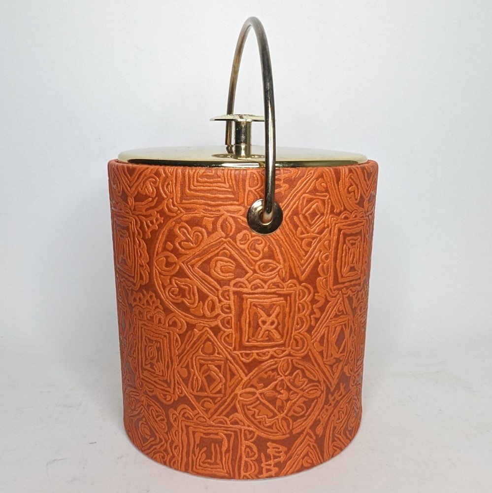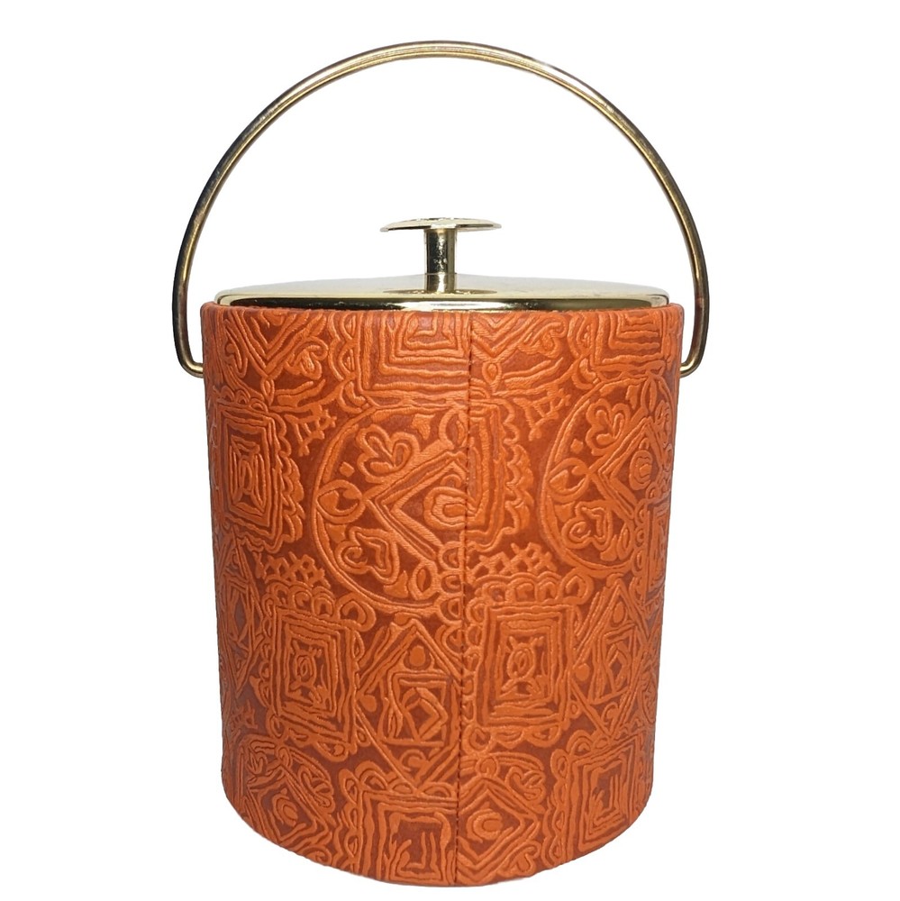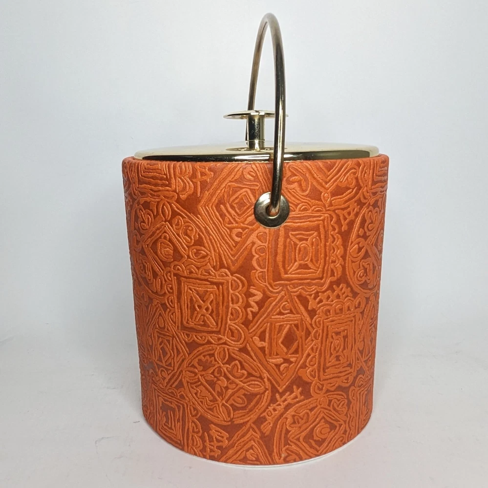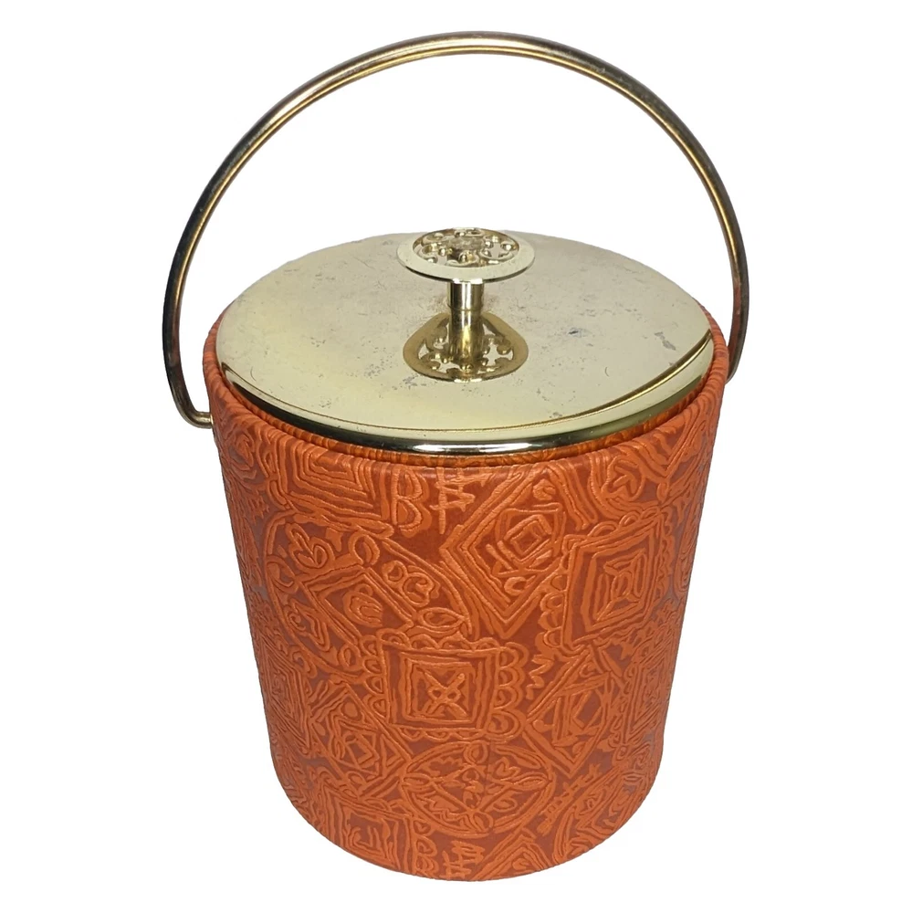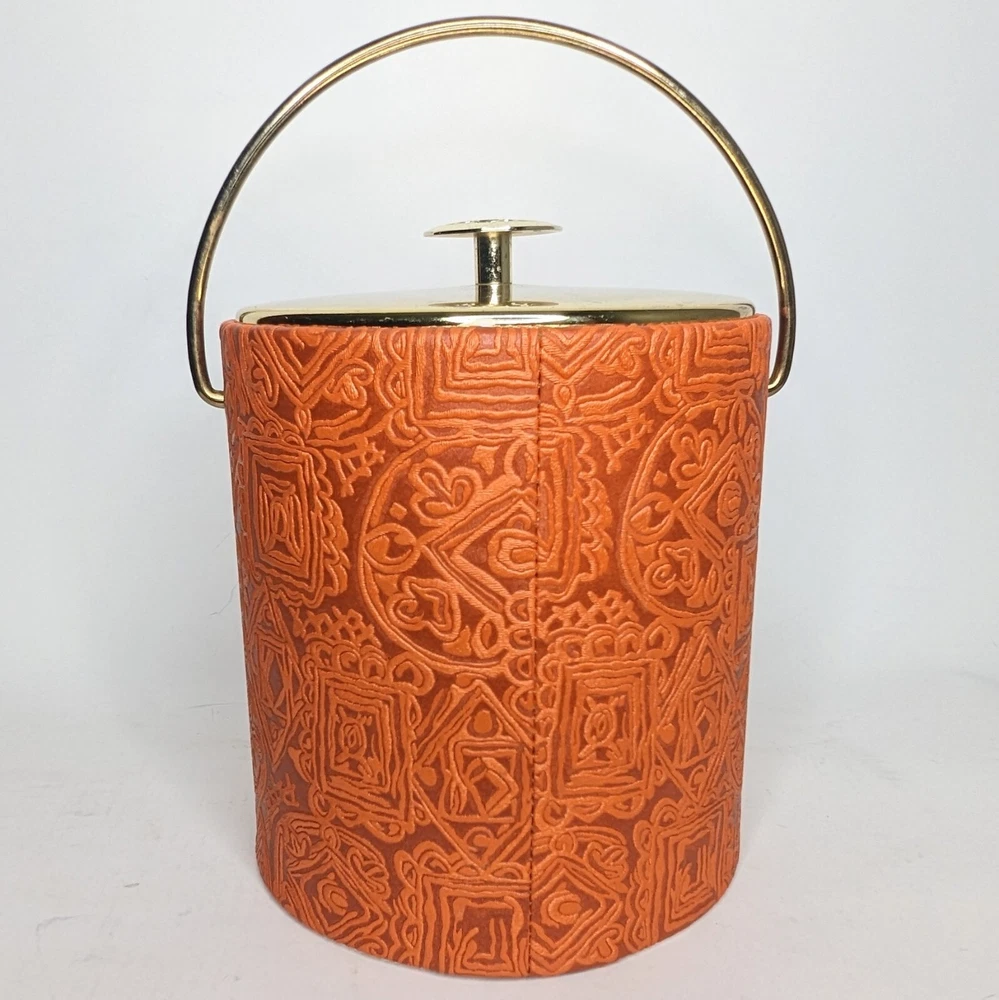 Vnt 70s West Bend Ice Bucket Mid Century Modern Faux Tooled Leather Barware Vintage 70s Ice Bucket Mid century Modern Orange Faux Tooled Leather Barware. Top has some tarnish and a couple of scratches. Inside has a couple small stains. Manufacturing flaw on the faux tooled leather as shown in the photos.