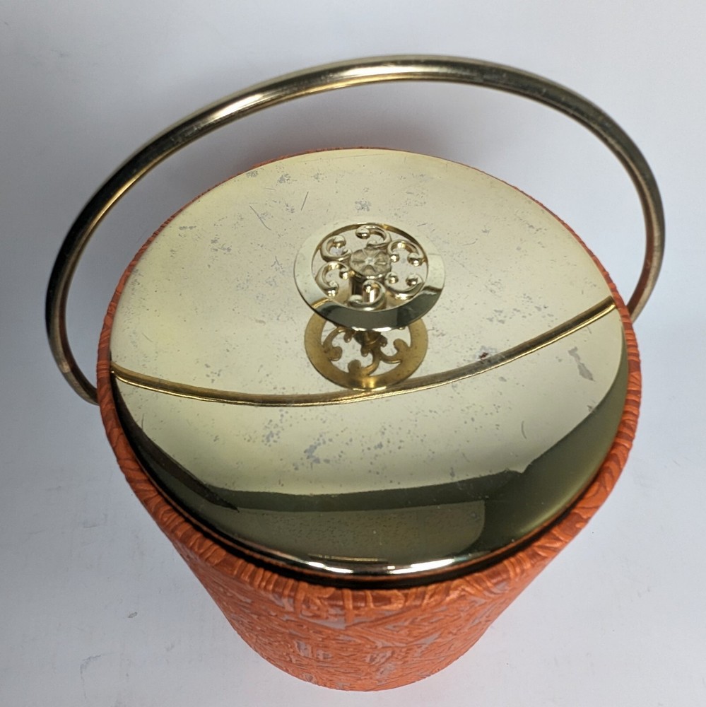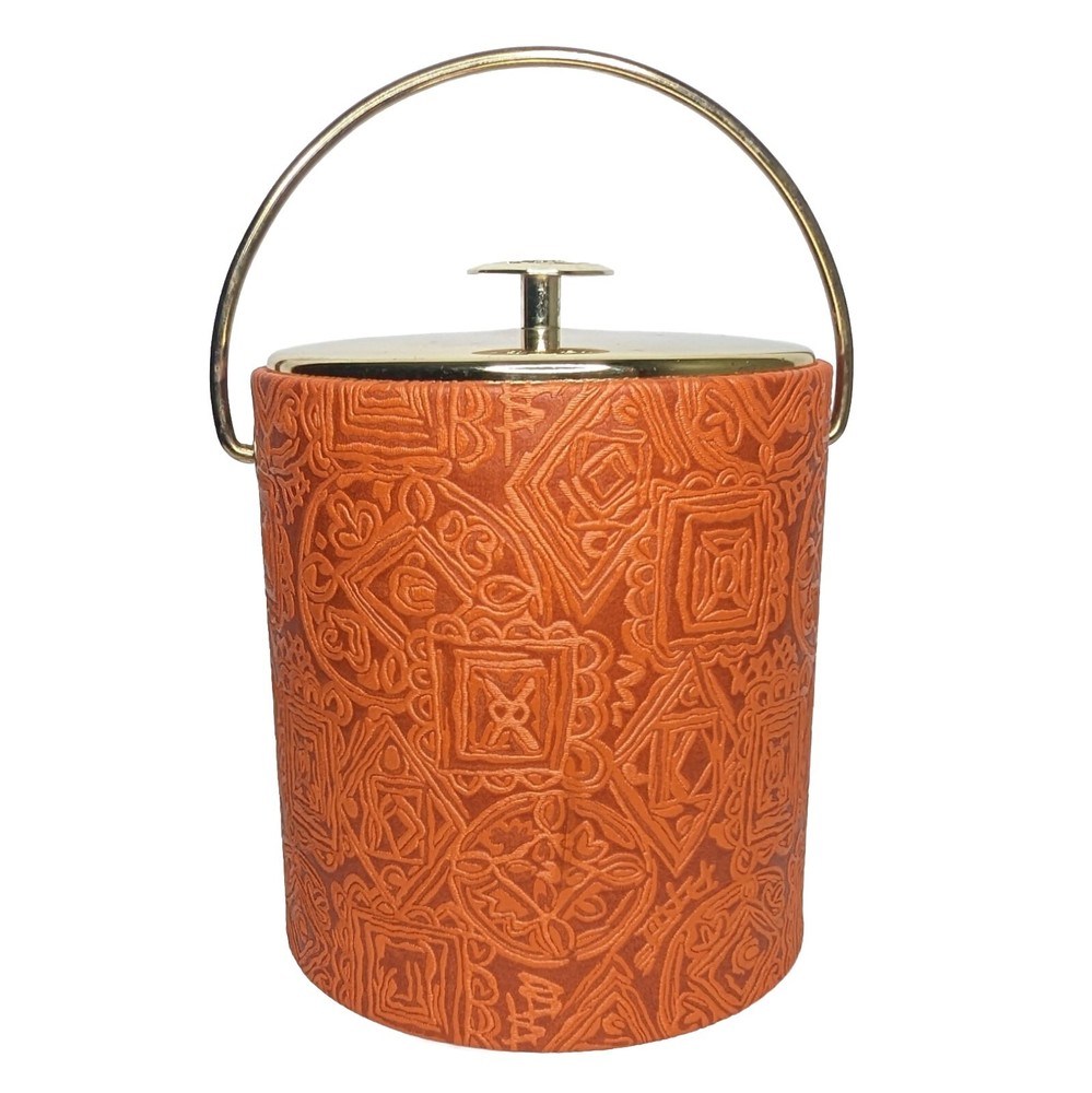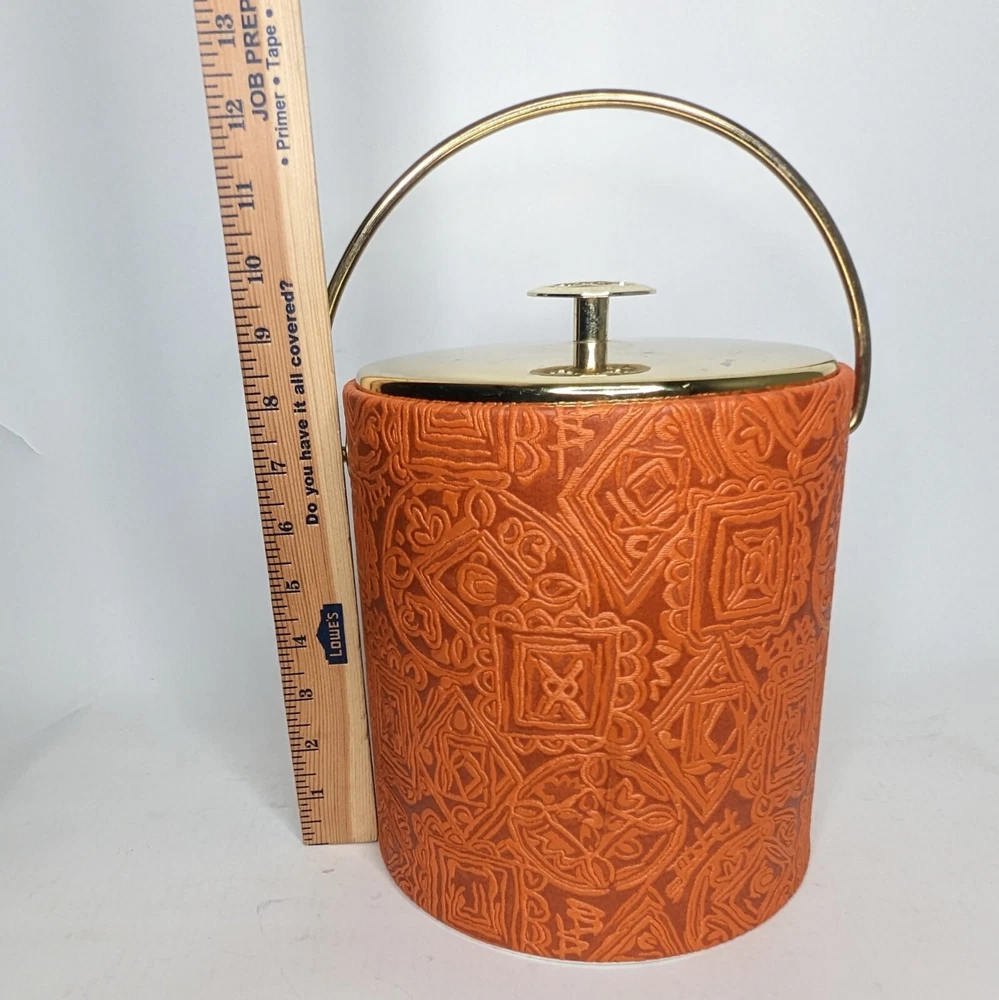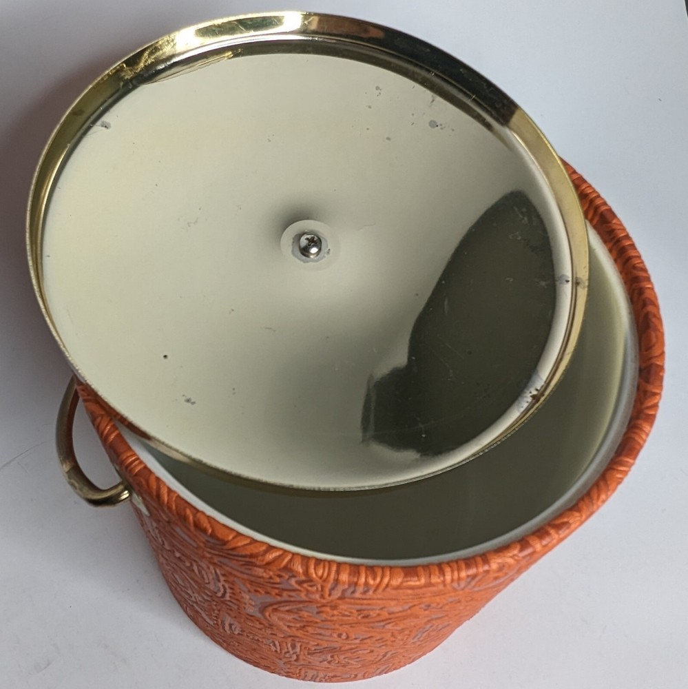Vnt 70s West Bend Ice Bucket Mid Century Modern Faux Tooled Leather Barware Vintage 70s Ice Bucket Mid century Modern Orange Faux Tooled Leather Barware. Top has some tarnish and a couple of scratches. Inside has a couple small stains. Manufacturing flaw on the faux tooled leather as shown in the photos.