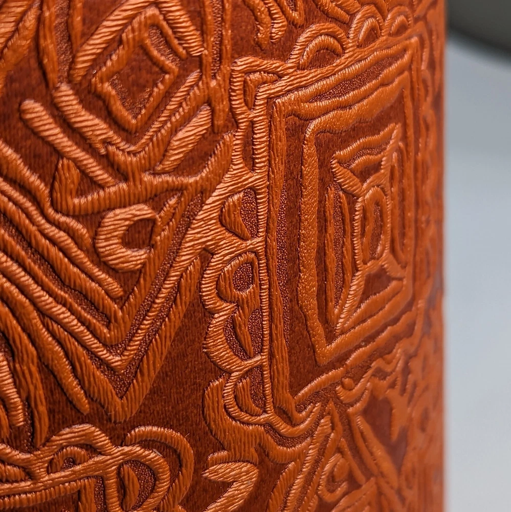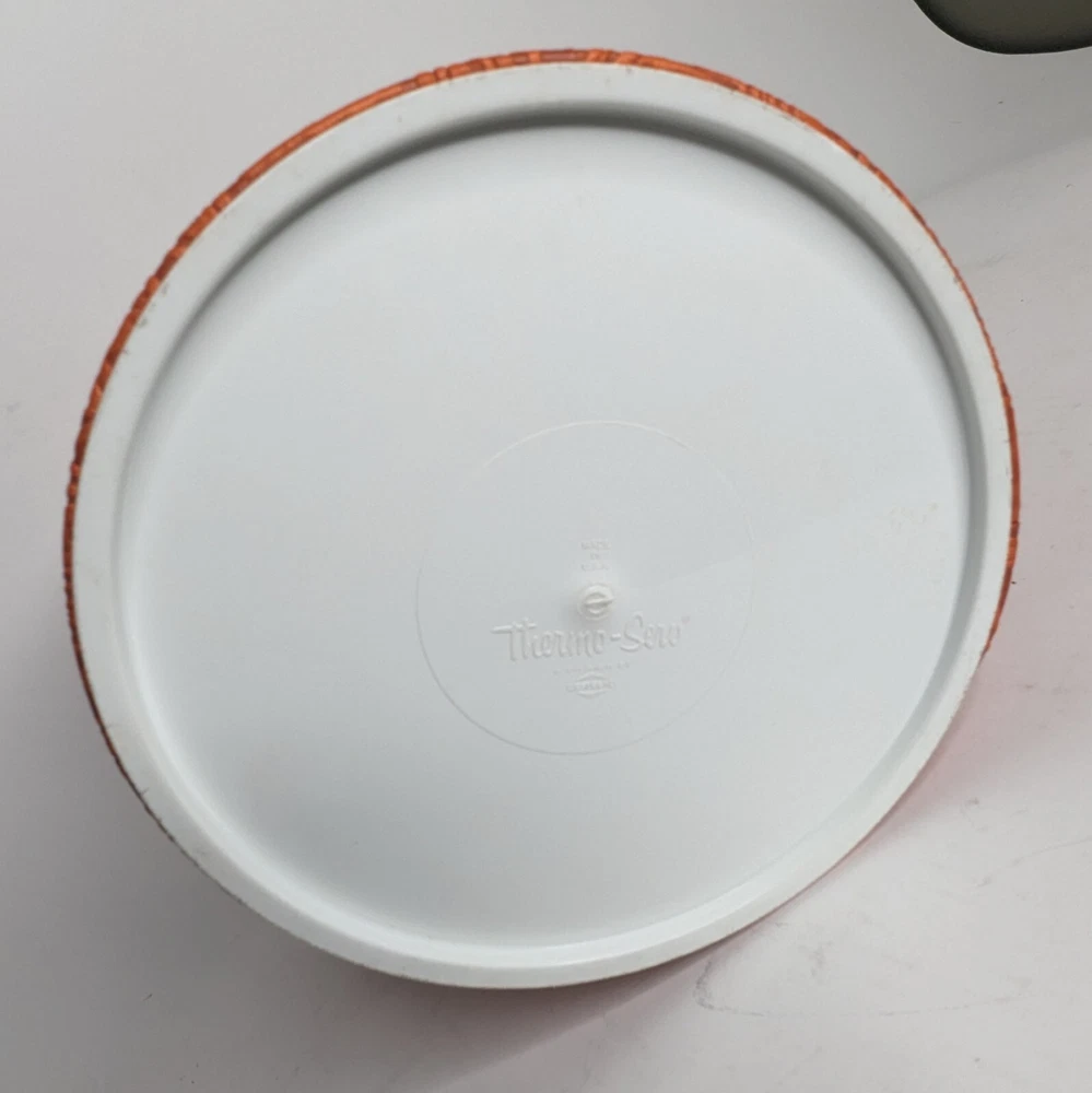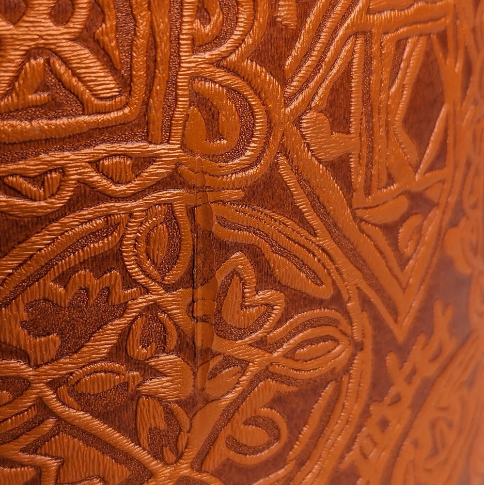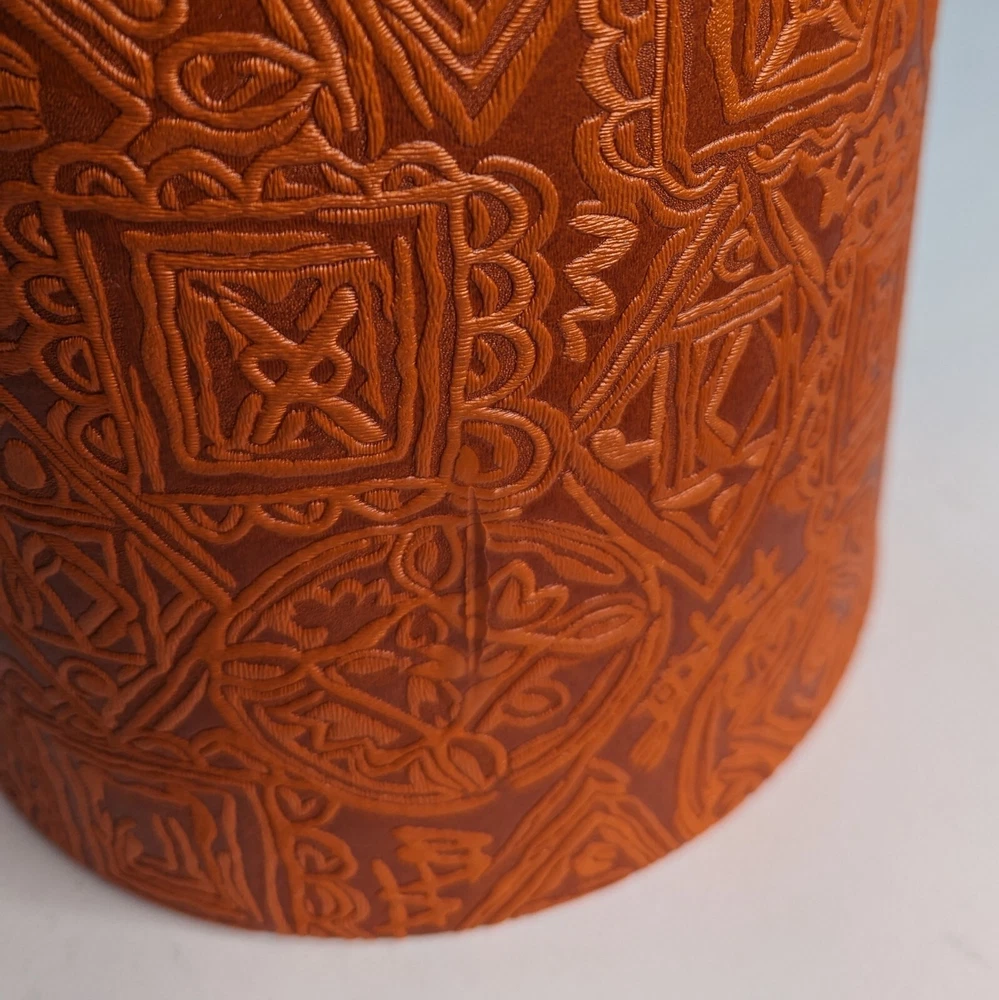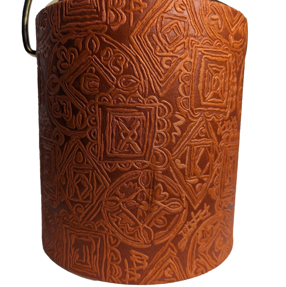 Vnt 70s West Bend Ice Bucket Mid Century Modern Faux Tooled Leather Barware Vintage 70s Ice Bucket Mid century Modern Orange Faux Tooled Leather Barware. Top has some tarnish and a couple of scratches. Inside has a couple small stains. Manufacturing flaw on the faux tooled leather as shown in the photos.