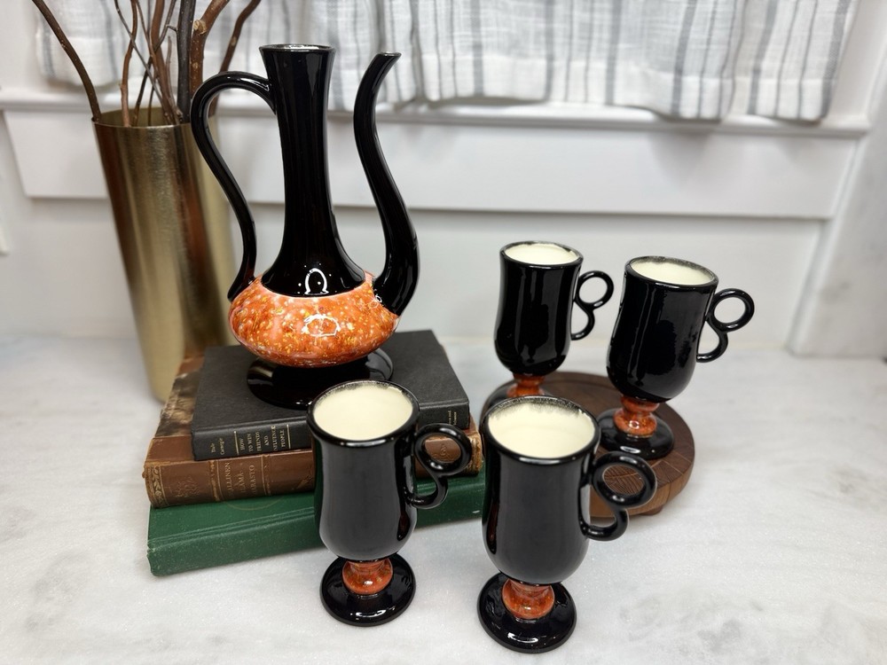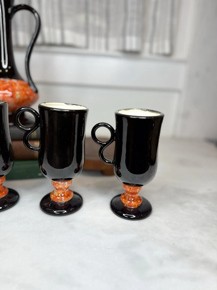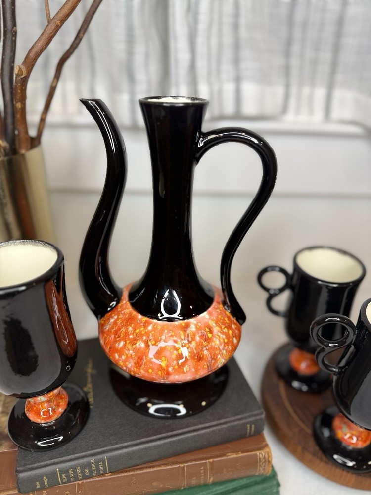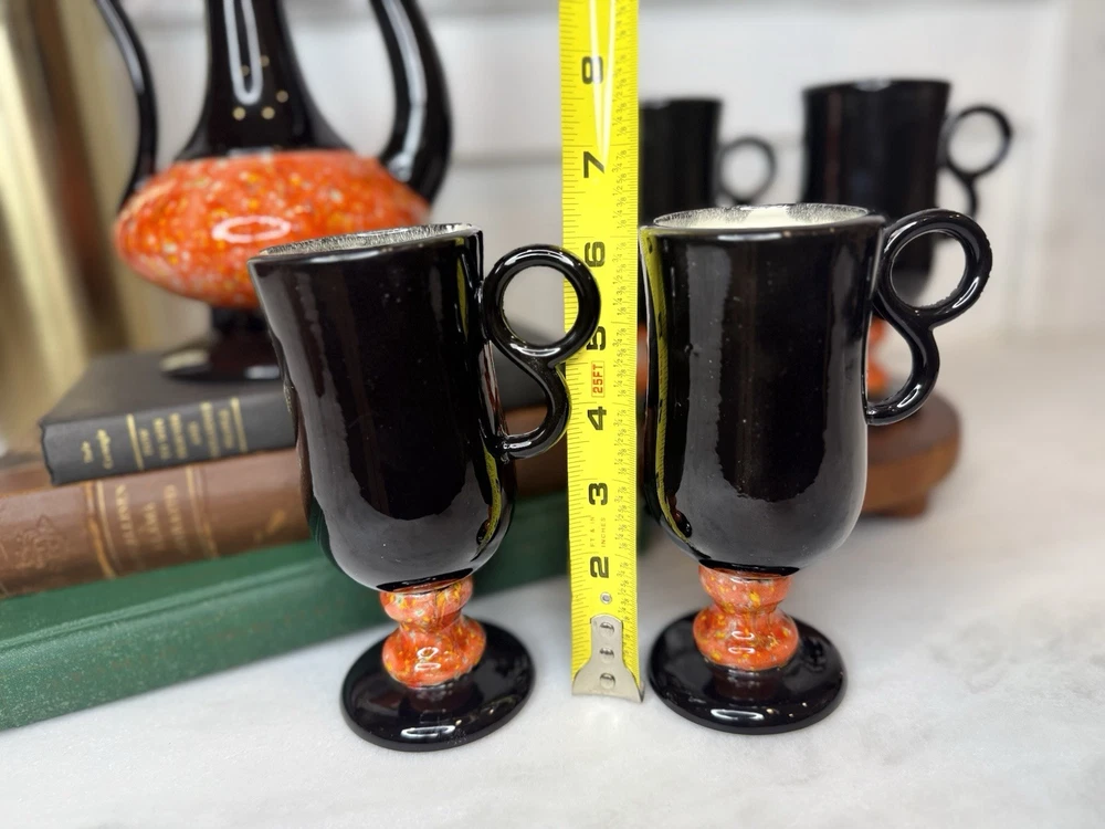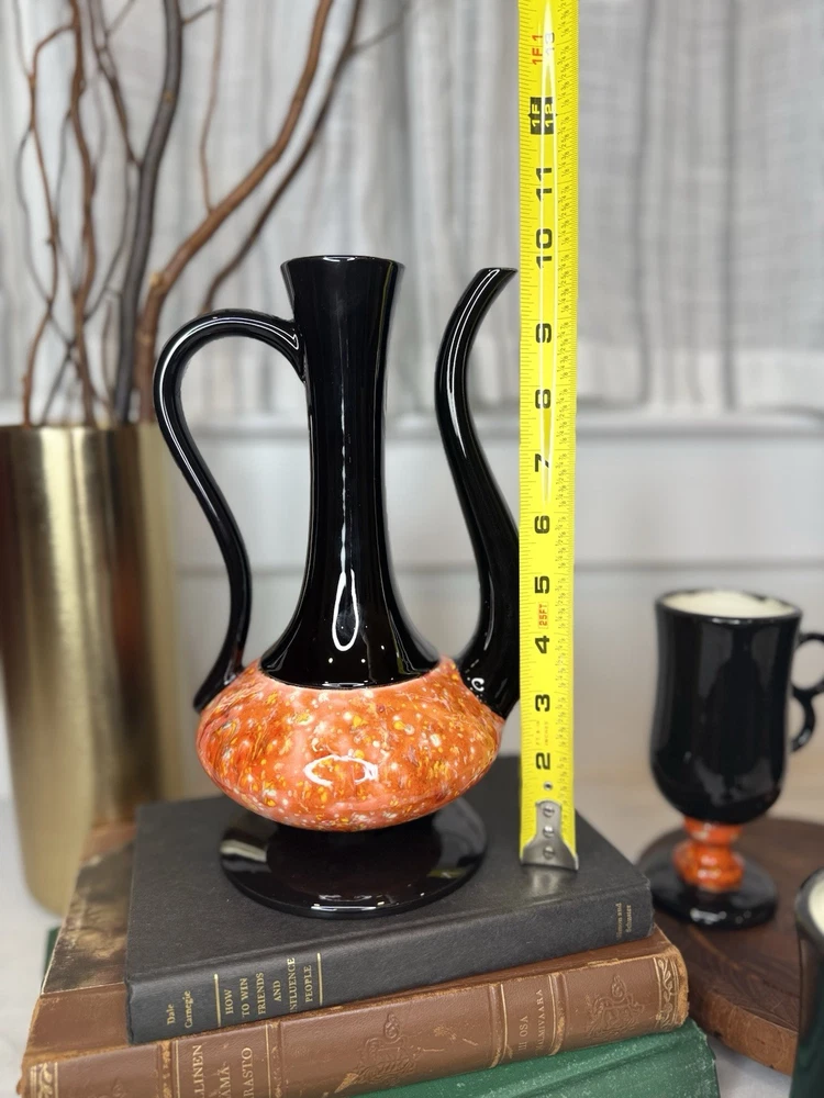 Note: This amazing set is offered across several platforms and at a local antique booth. It may sell elsewhere at any moment. Vintage treasures tend to disappear quickly — if it's meant for you, don't let it slip away! Vintage 1970s MCM ceramic pitcher and cups set features a five-piece collection with a splatter pattern design in orange and black colors. Handmade in 1976, this set includes a pitcher made of ceramic and porcelain, perfect for collectors of unique glassware and drinkware items from the 1970s era. The set also includes drinking glasses that are sure to add a fun and retro touch to any kitchen or home decor. The pitcher measures almost 10” tall & the cups measure 6” tall. The cups hold 8oz. Pieces are signed: JC 1976. Excellent vintage condition-no chips but one cup has a hairline crack-see last picture.