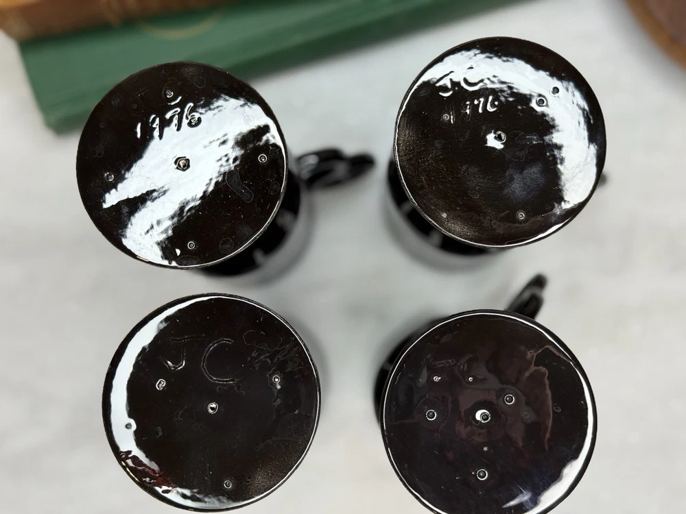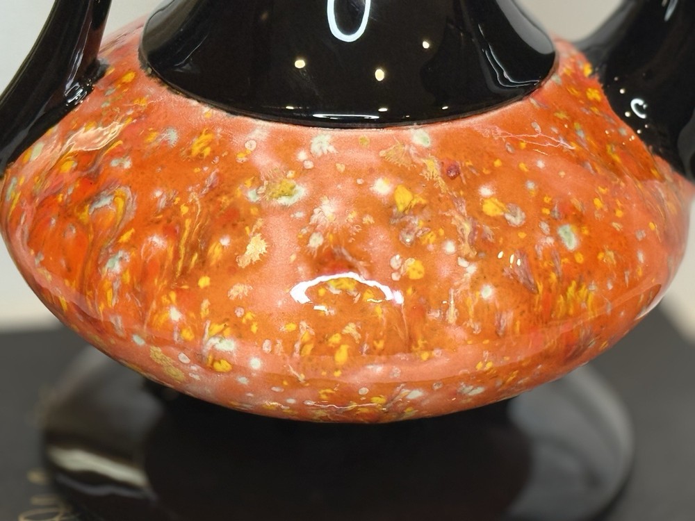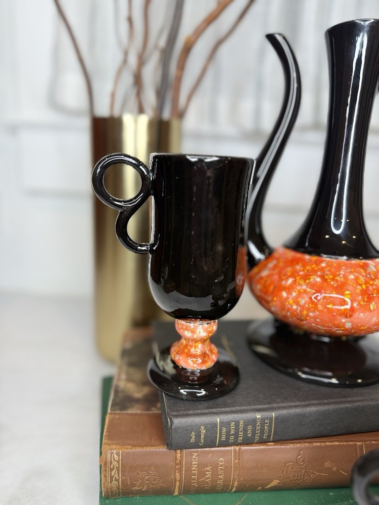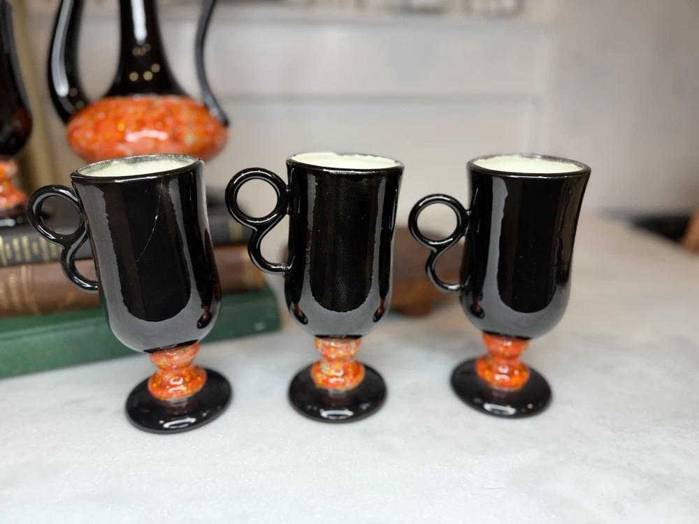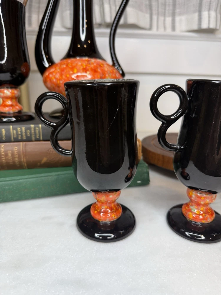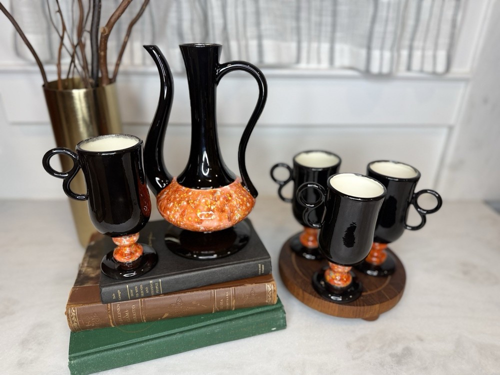 Note: This amazing set is offered across several platforms and at a local antique booth. It may sell elsewhere at any moment. Vintage treasures tend to disappear quickly — if it's meant for you, don't let it slip away! Vintage 1970s MCM ceramic pitcher and cups set features a five-piece collection with a splatter pattern design in orange and black colors. Handmade in 1976, this set includes a pitcher made of ceramic and porcelain, perfect for collectors of unique glassware and drinkware items from the 1970s era. The set also includes drinking glasses that are sure to add a fun and retro touch to any kitchen or home decor. The pitcher measures almost 10” tall & the cups measure 6” tall. The cups hold 8oz. Pieces are signed: JC 1976. Excellent vintage condition-no chips but one cup has a hairline crack-see last picture.