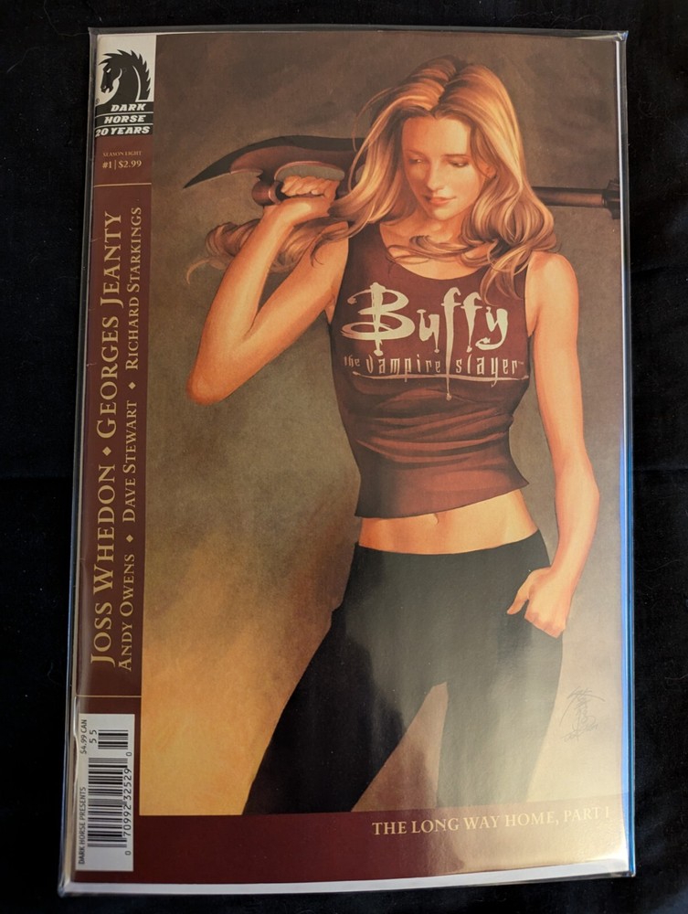This is a must-have comic book for any fan of Buffy the Vampire Slayer. The first issue of the eighth season, written by Joss Whedon and various artists, features the beloved characters Angel, Xander, and Buffy in their superhero team, the Scooby Gang. The comic is near Mint- grade and is a first printing, boarded, and 1st edition. The story is in English and takes place in the Buffy the Vampire Slayer universe, created by Joss Whedon. The comic is published by Dark Horse Comics and was released in 2007. This item is a collectible and is perfect for any fan of action, fantasy, horror & sci-fi, and US Comics.