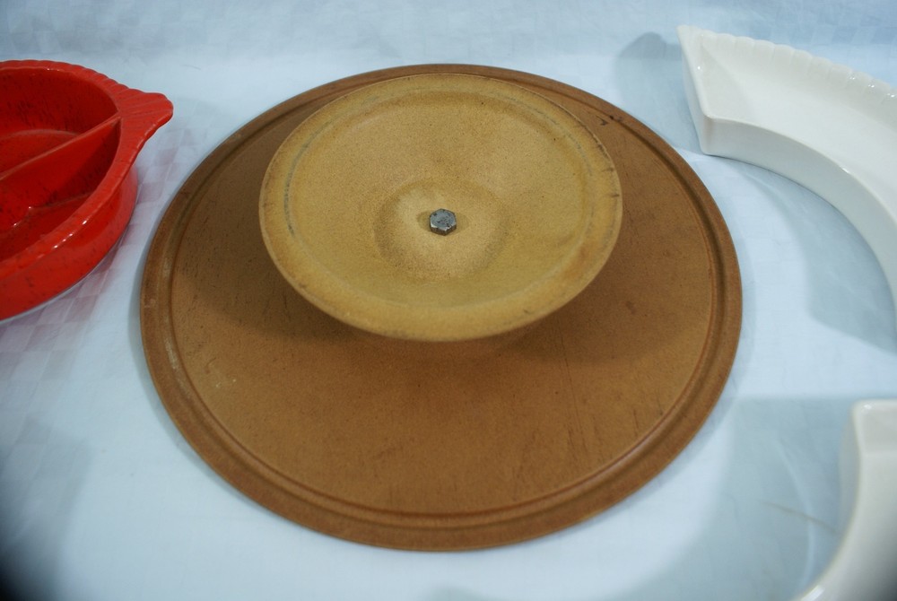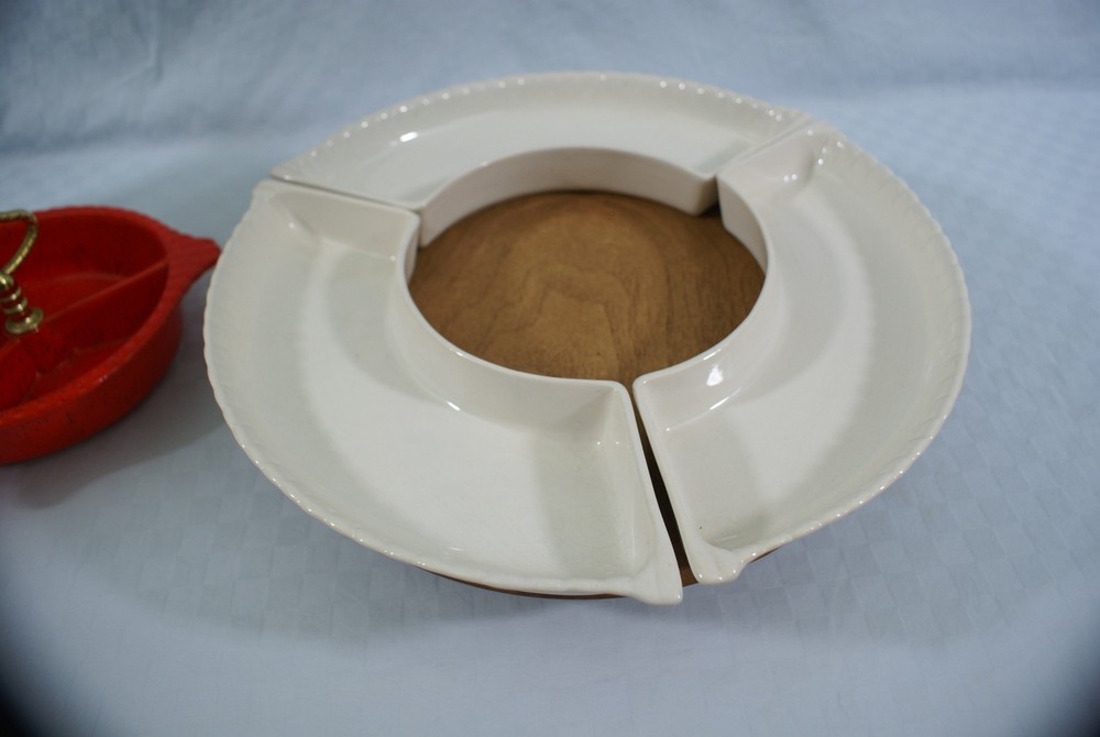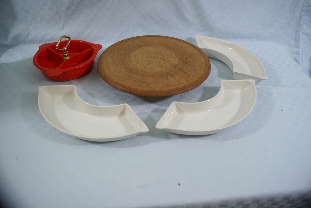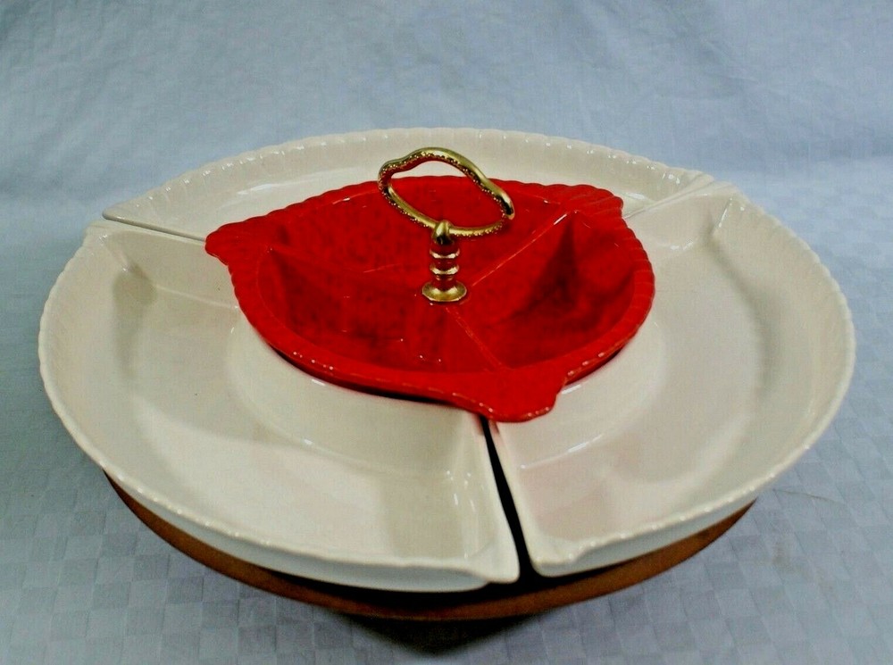 Vtg. California Pottery Lazy Susan - Orange & White - L65 - Mid-Century Retro - 5 pcs . Wood base that spins - 3 white trays and center of orange that has 3 sections. Gold handle. Preowned - In excellent condition - no chips, cracks or marks. Measurements - 13 inch diameter Please check the photographs - they are a part of the description. At the time of listing I have other items you might be interested in - if more than one item bought at the same time and shipped to the same address I might be able to offer a better shipping rate. All rates are the same I am charged by USPS. I do not make money from shipping. THANKS FOR LOOKING!!!! I describe items the best I can, with as much information as possible. Colors in photographs may appear different based on the resolutions set on your computer. I you have any questions, please email me BEFORE you buy. If you win the bid you will be expected to follow through with the purchase. Items, new and used, are sold ?AS IS?, I buy from estate sales an items may NOT be from a smoke free/pet free environment. I suggest that all clothing items be cleaned or washed before they are worn. Please contact me immediately if you have a problem with your purchase. SHIPPING Items are carefully packaged and shipped to a verified PayPal address within 2 business days after funds have cleared. Shipping cost are based on weight of the packed item and are the amounts charged by USPS. I ship from Florida and prices are based on zones therefore Priority and Parcel Select will cost more if you are further away. Please keep in mind Priority and Parcel Select increase by the pound, not by the parts of a pound. First Class is only up to 13 oz.