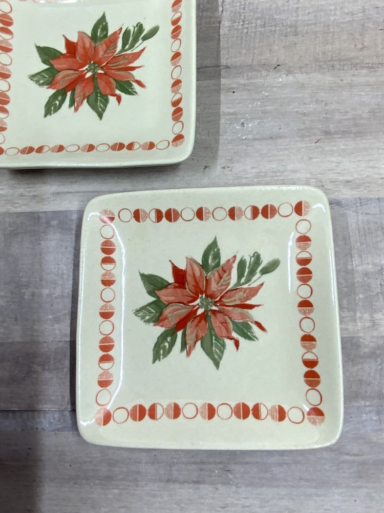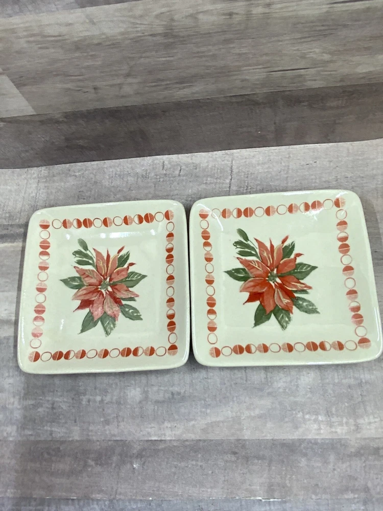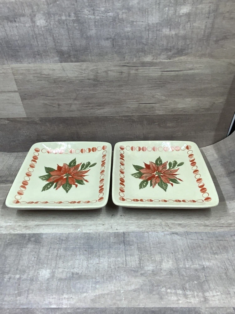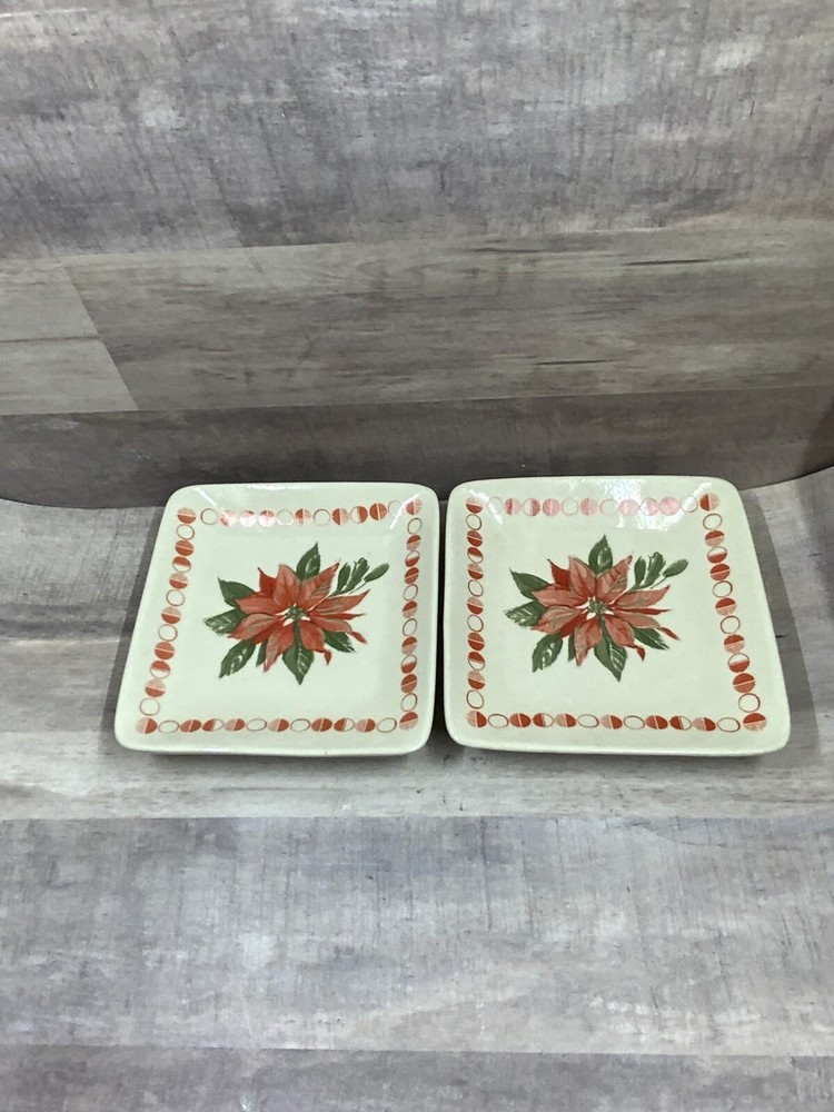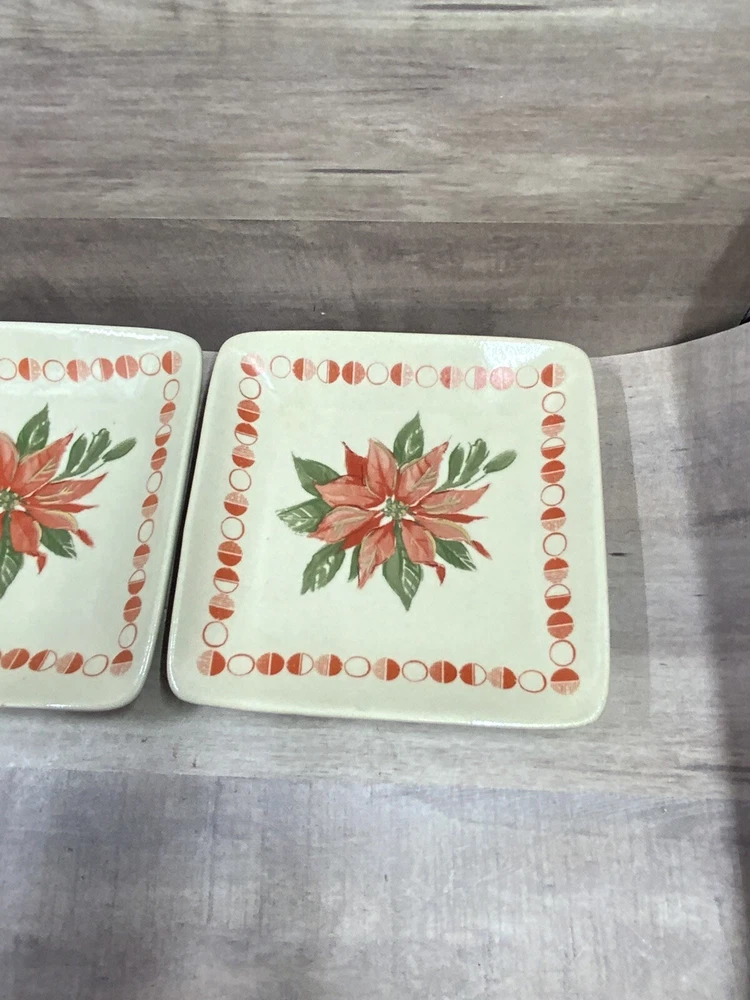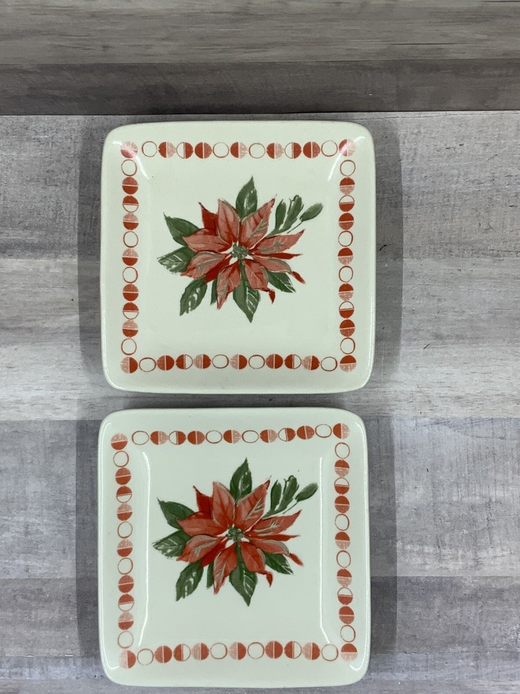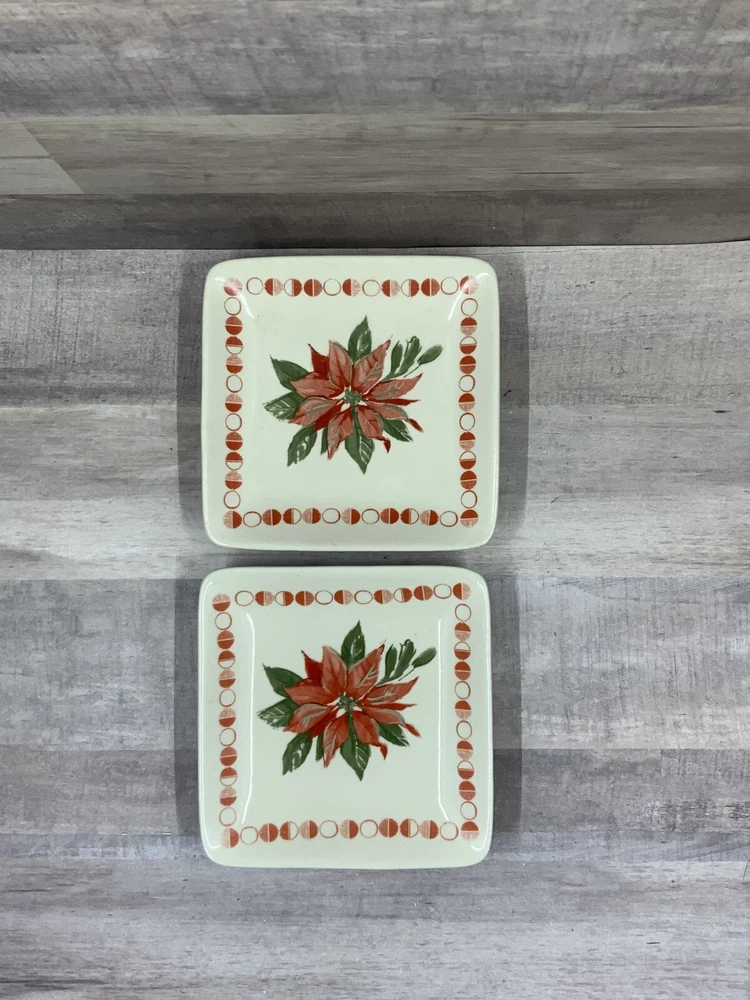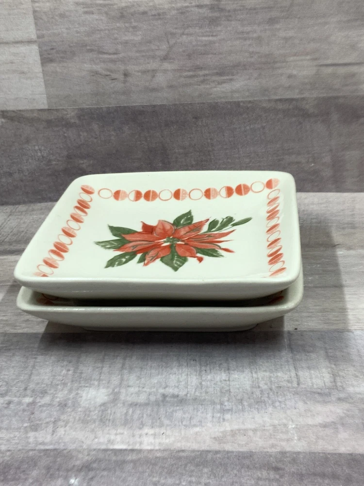 Vintage set of 2 Chad Barrett Creative Co-Op Red Christmas Poinsettia 4" Trinket Plate Dish. No chips, nicks or cracks. In very good pre-owned condition. The pictures provided are part of the description and details.