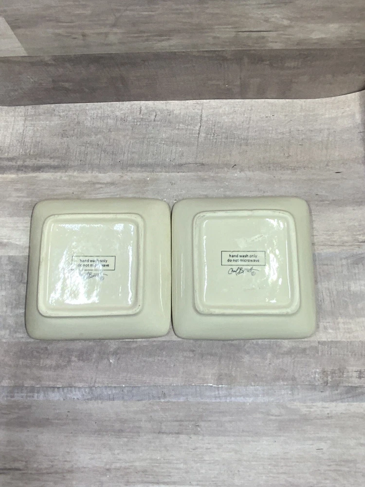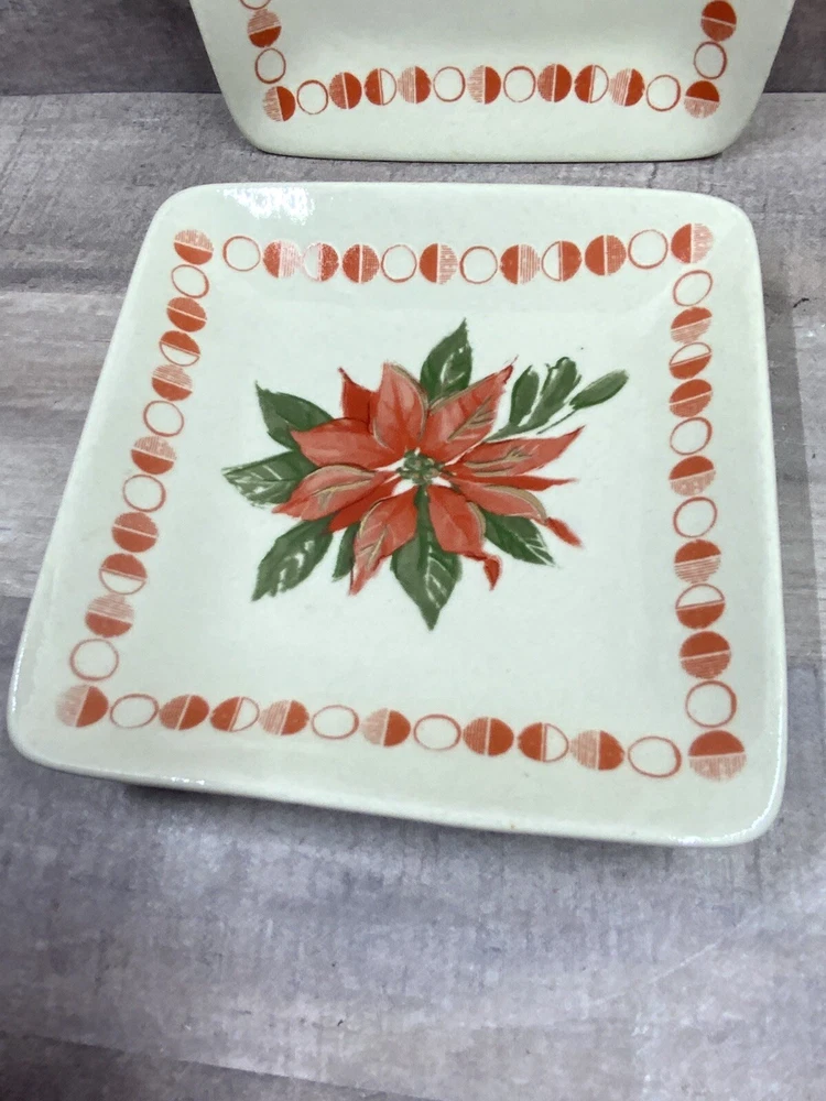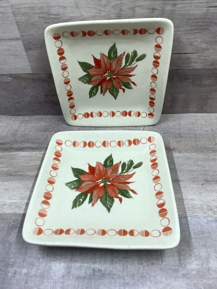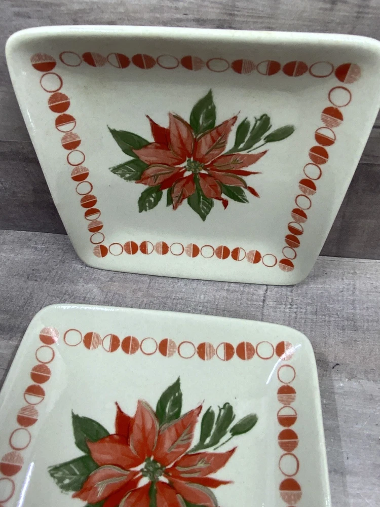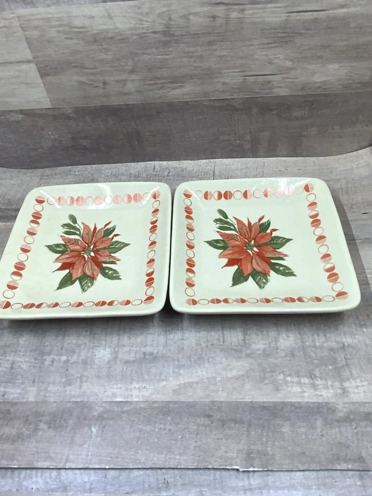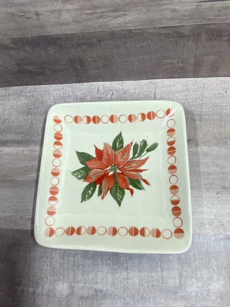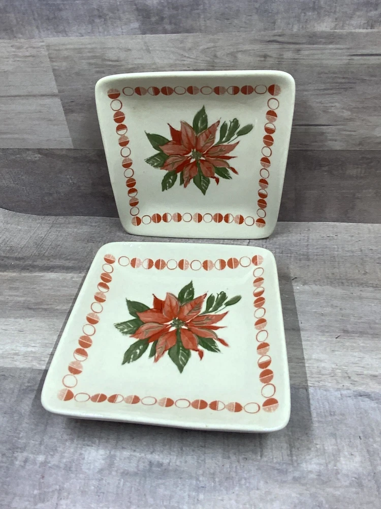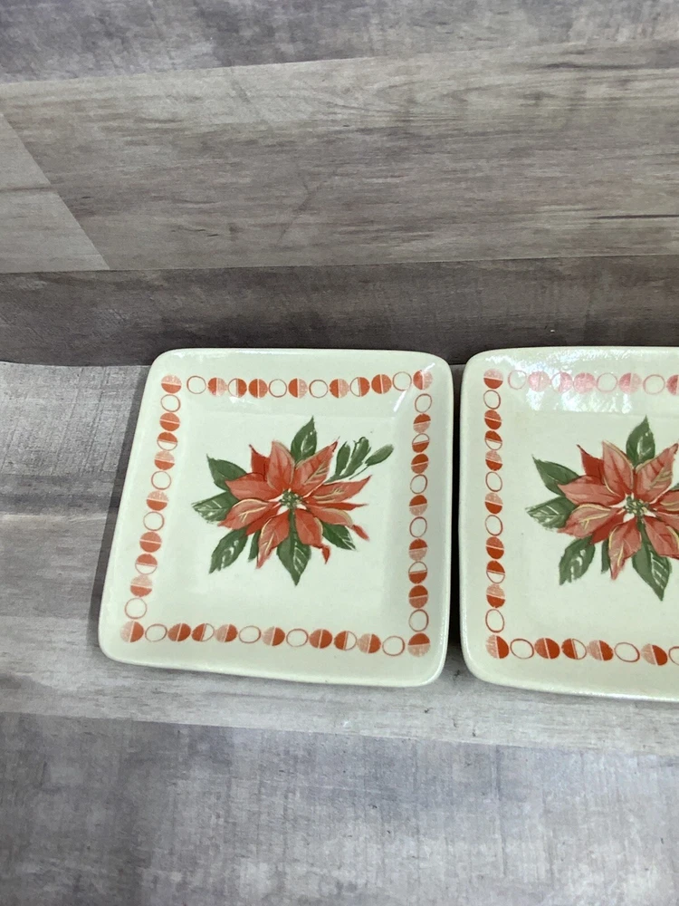 Vintage set of 2 Chad Barrett Creative Co-Op Red Christmas Poinsettia 4" Trinket Plate Dish. No chips, nicks or cracks. In very good pre-owned condition. The pictures provided are part of the description and details.
