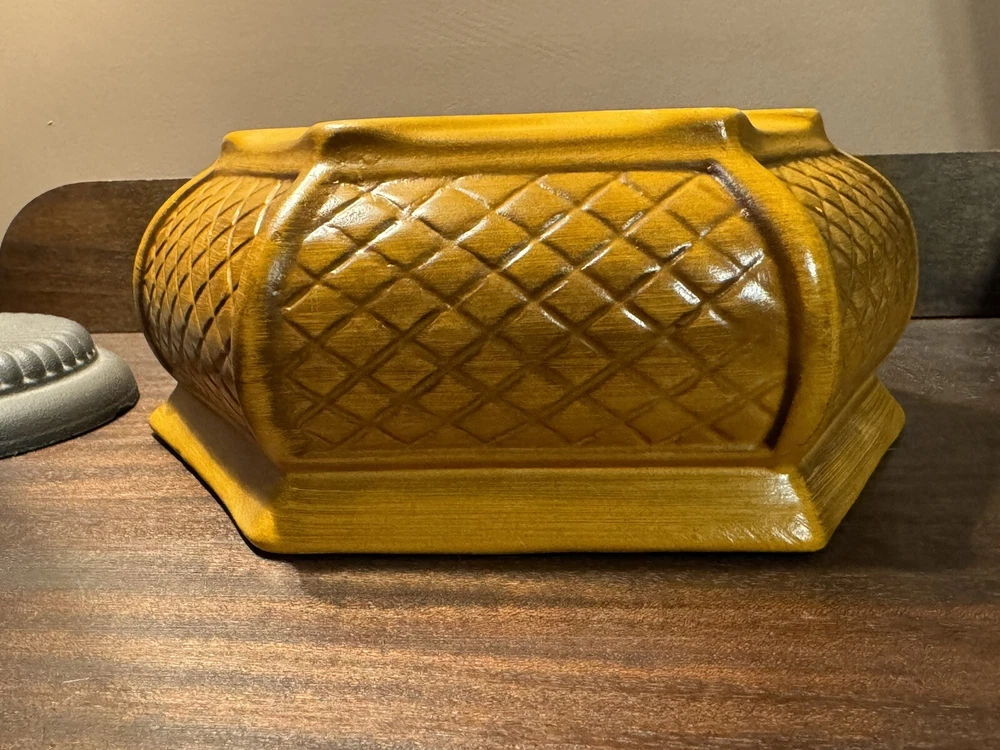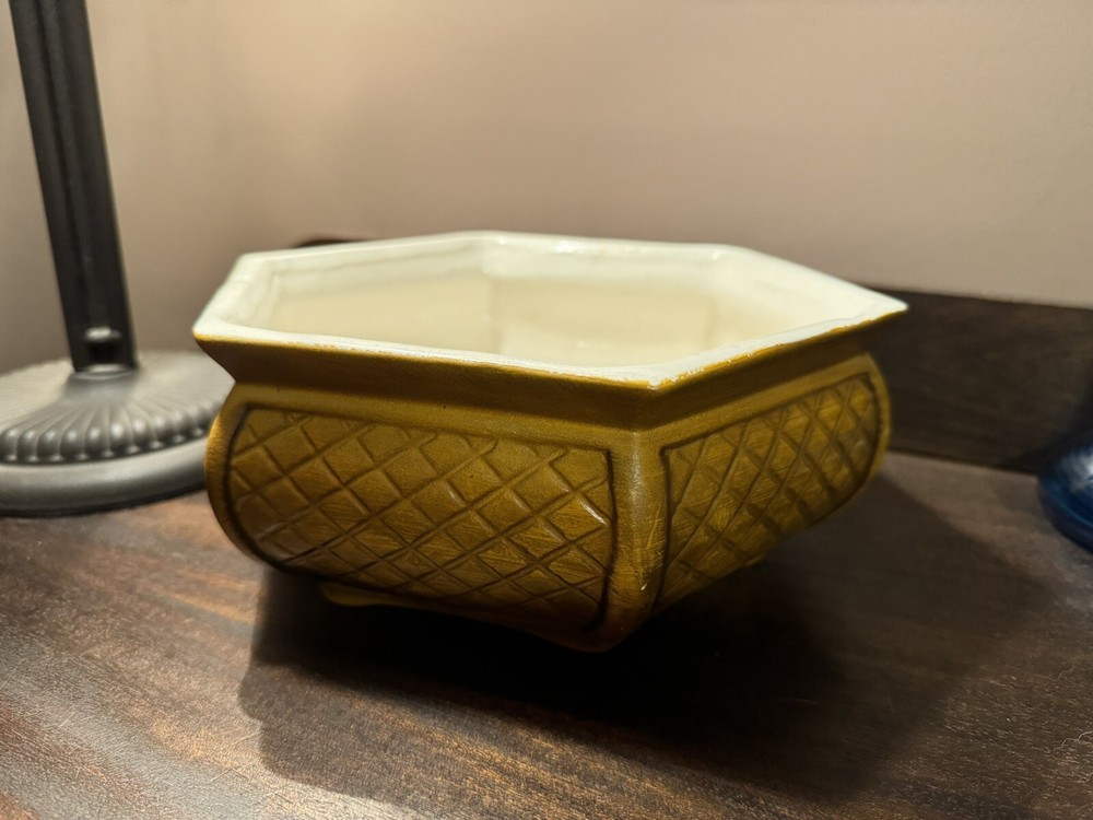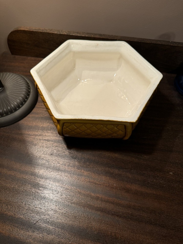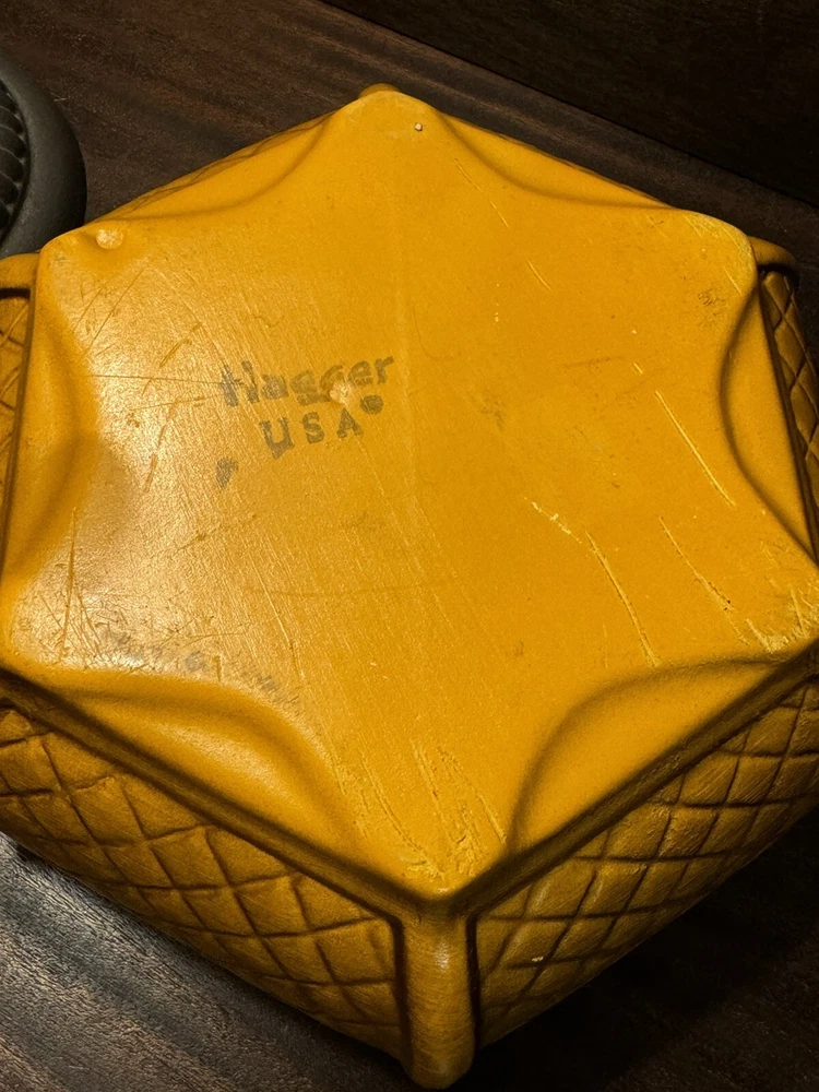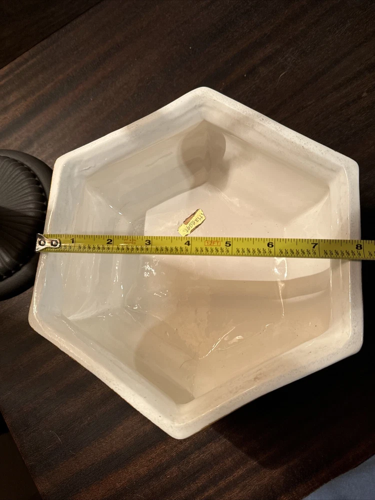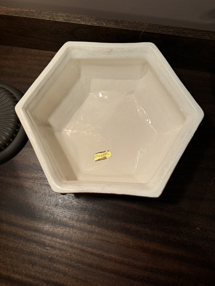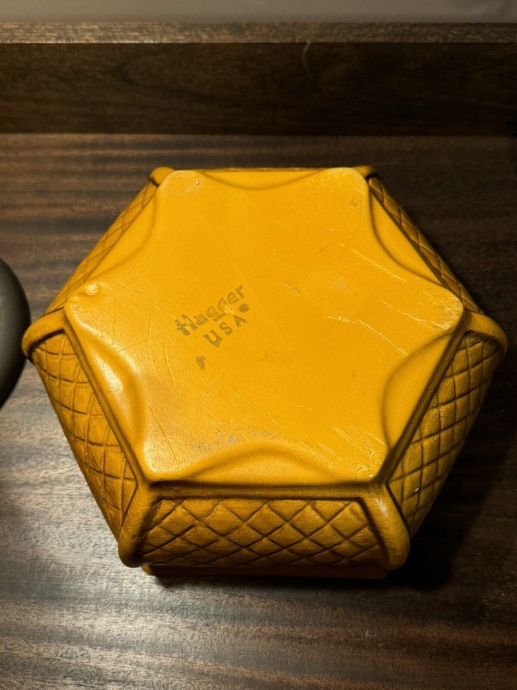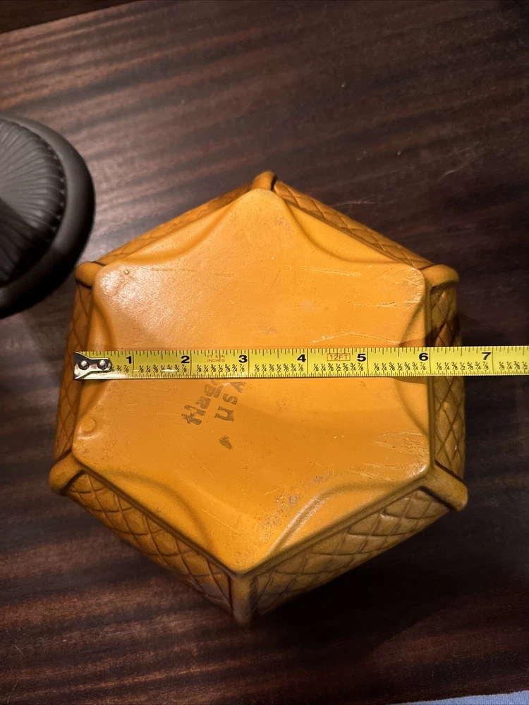 Haeger USA hexagonal planter. Diamond pattern exterior with an orange glaze under a brown wash. The interior is a contrasting white. In excellent overall vintage condition, this mid century piece does have some scratches on the bottom as shown in photos. A great addition to your Haeger collection or a special gift for lovers of vintage American pottery. Haeger was produced beginning in 1854 in Illinois. It was in continual operation for 145 years until it ceased production in 2016. Thanks for shopping and be sure to check out my other listings for some amazing unique & vintage finds.