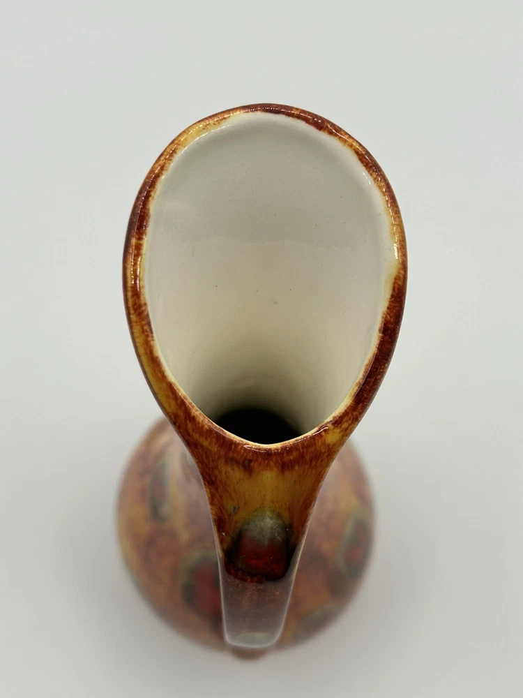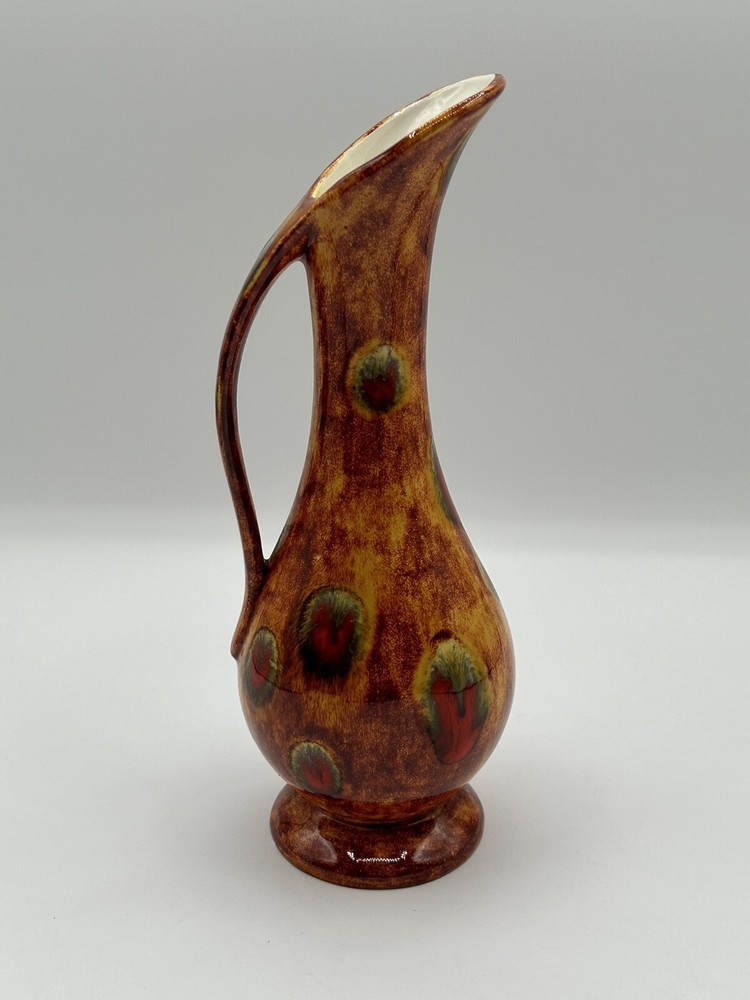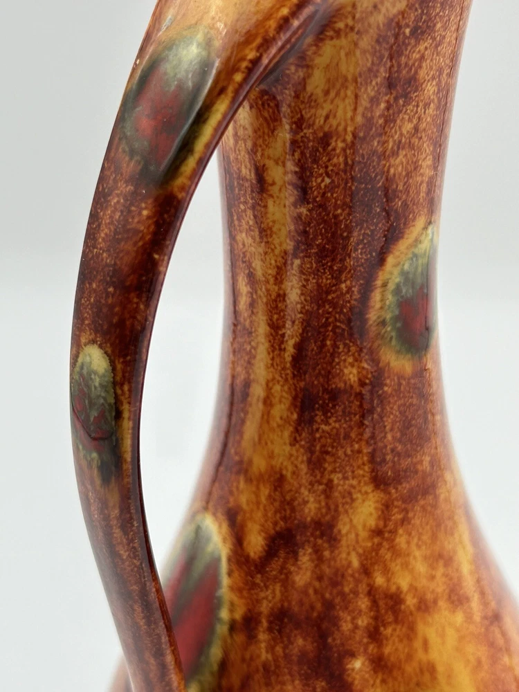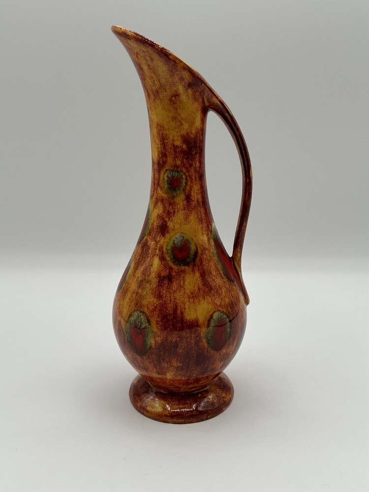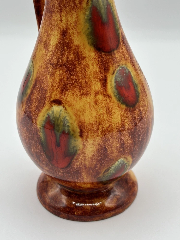 This vintage mid-century modern art pottery pitcher/vase is a unique addition to any collection. With a beautiful multi-color drip glaze finish in orange, green, and red, this piece is sure to catch the eye. The item measures 3 inches in length and width, and stands at 8.5 inches tall, making it the perfect size for display in any room. The pitcher/vase is handmade and features a glossy finish, with an impressed backstamp. It is an original piece from the United States, produced using the studio craft technique in the mid-20th century. The item weighs 8.85 ounces and includes a handle for easy display. This MCM art pottery vase is perfect for collectors of vintage decorative pottery and is sure to add a touch of retro charm to any space. Note 4.0