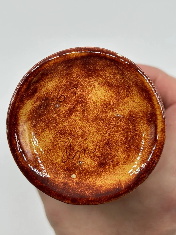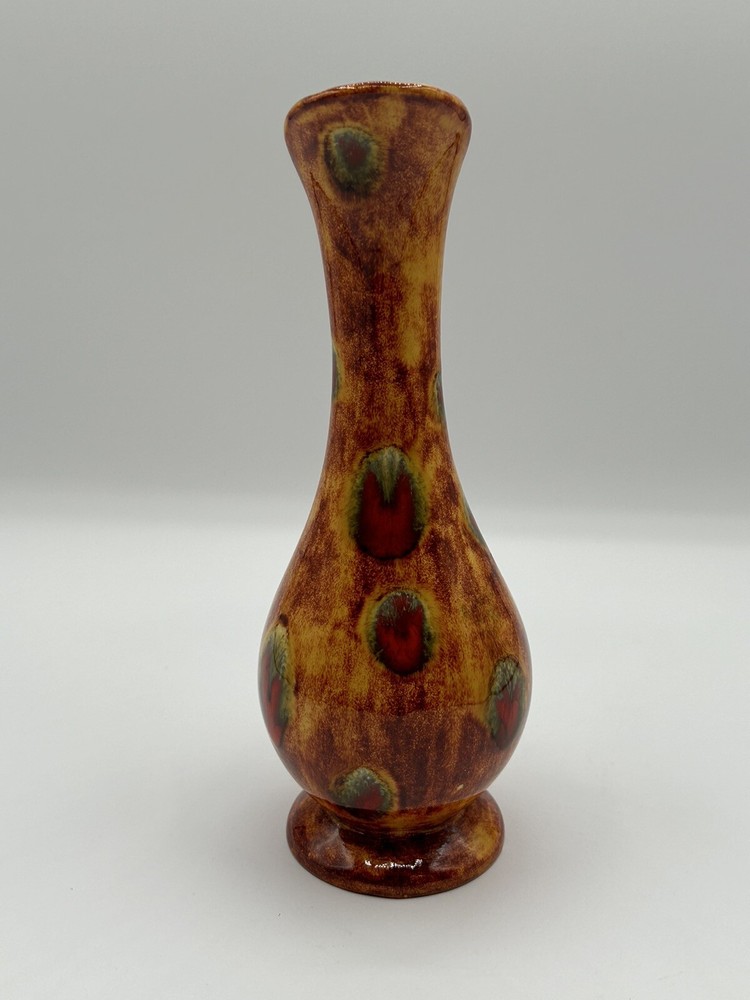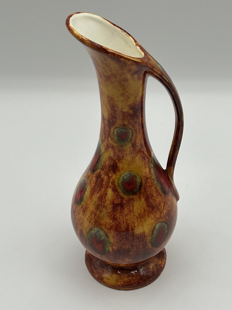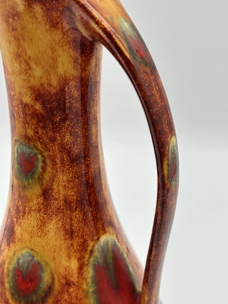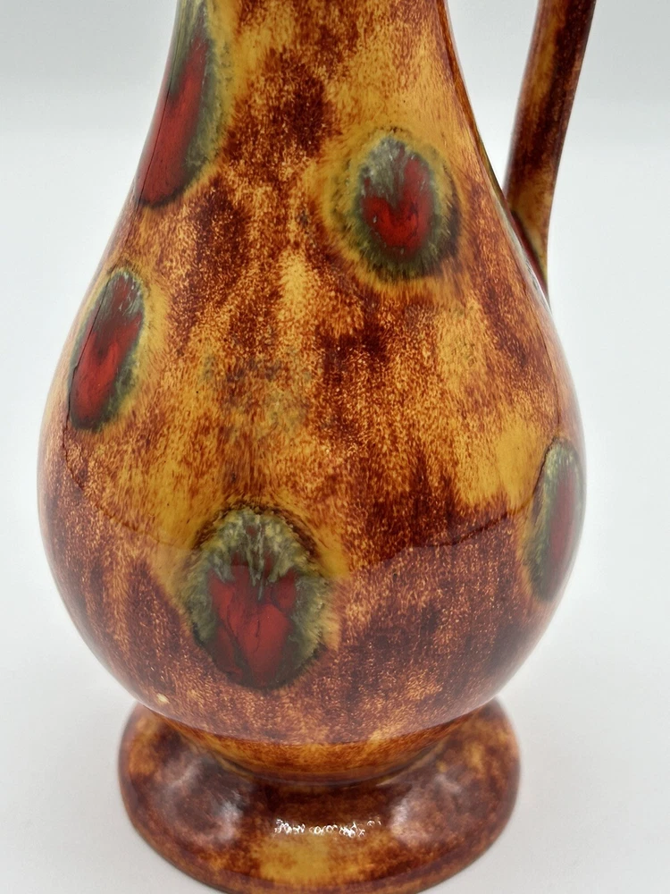 This vintage mid-century modern art pottery pitcher/vase is a unique addition to any collection. With a beautiful multi-color drip glaze finish in orange, green, and red, this piece is sure to catch the eye. The item measures 3 inches in length and width, and stands at 8.5 inches tall, making it the perfect size for display in any room. The pitcher/vase is handmade and features a glossy finish, with an impressed backstamp. It is an original piece from the United States, produced using the studio craft technique in the mid-20th century. The item weighs 8.85 ounces and includes a handle for easy display. This MCM art pottery vase is perfect for collectors of vintage decorative pottery and is sure to add a touch of retro charm to any space. Note 4.0