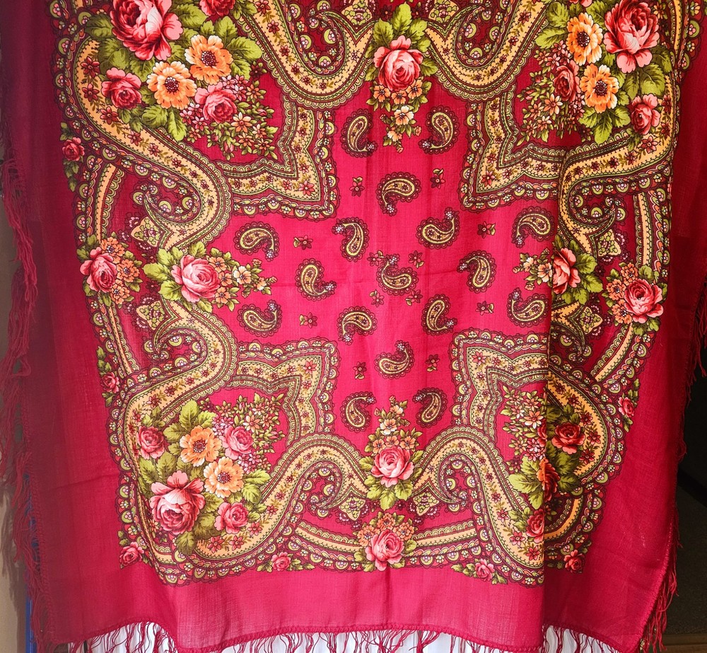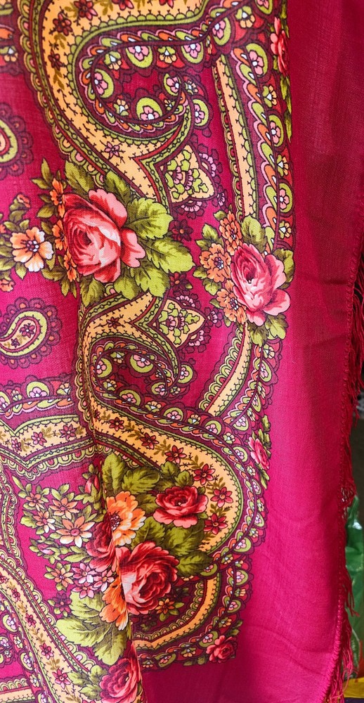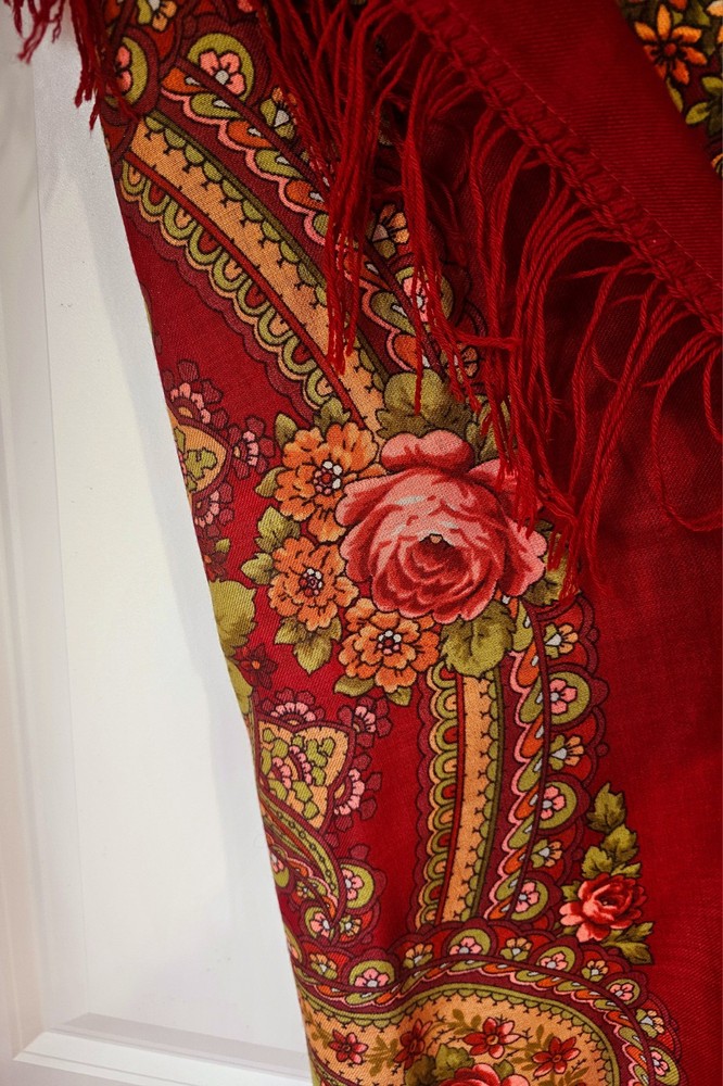 This vintage floral paisley scarf is absolutely gorgeous! The vibrant red, pink, and orange colors pop beautifully, and the fringe adds a playful touch. The cotton fabric is soft yet durable, and it’s in perfect condition—no flaws at all. At 56” square, it’s versatile enough to wear as a scarf, shawl, or even a stylish table accent. The retro design gives it so much character, and the colors are even more stunning in person. Love how lightweight it is for layering. A must-have for any vintage lover!
