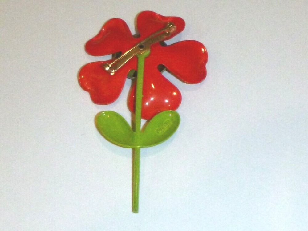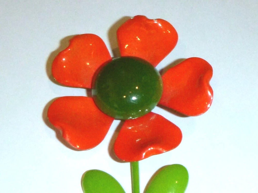 Fab flower power brooch - enamel paint over metal! Big orange daisy with a green stem and leaves. Measures 3.75" in height and is 2.25" wide
